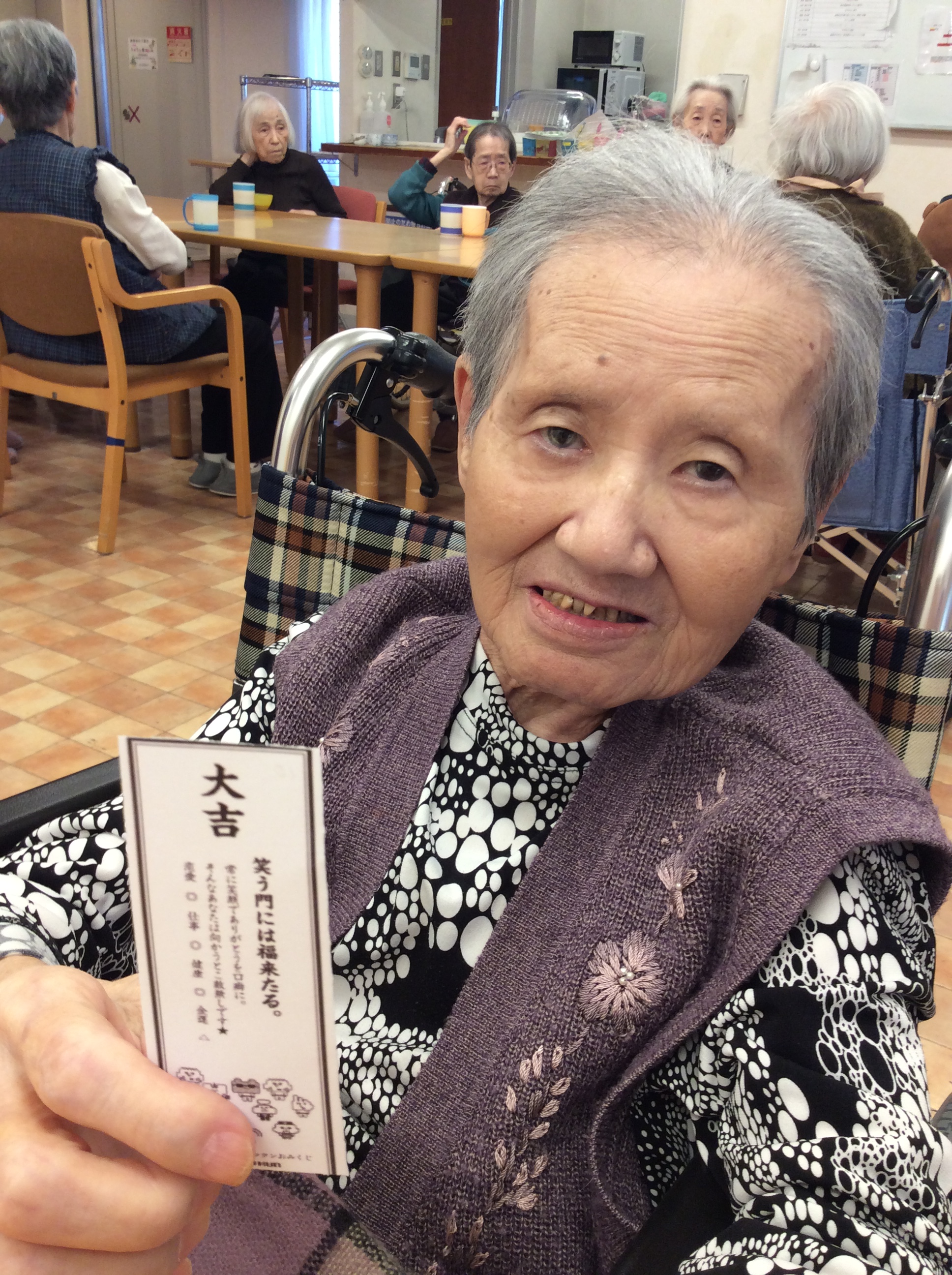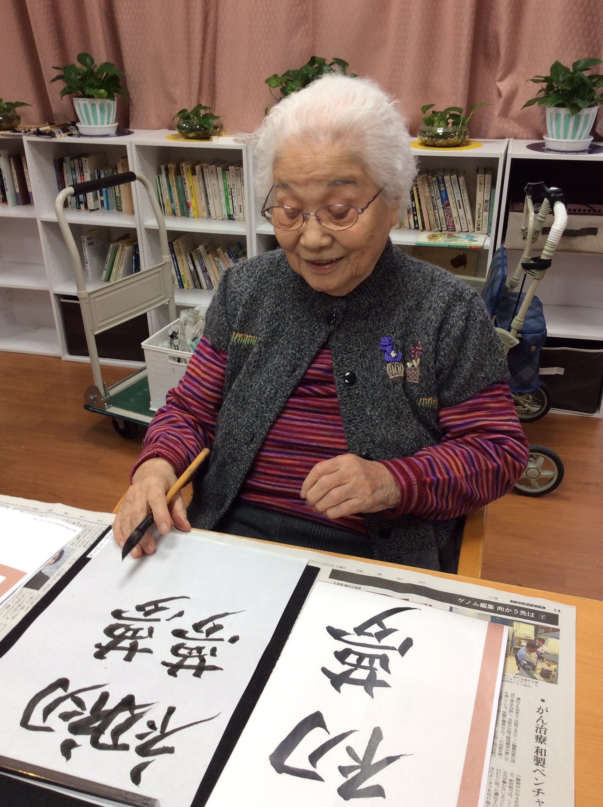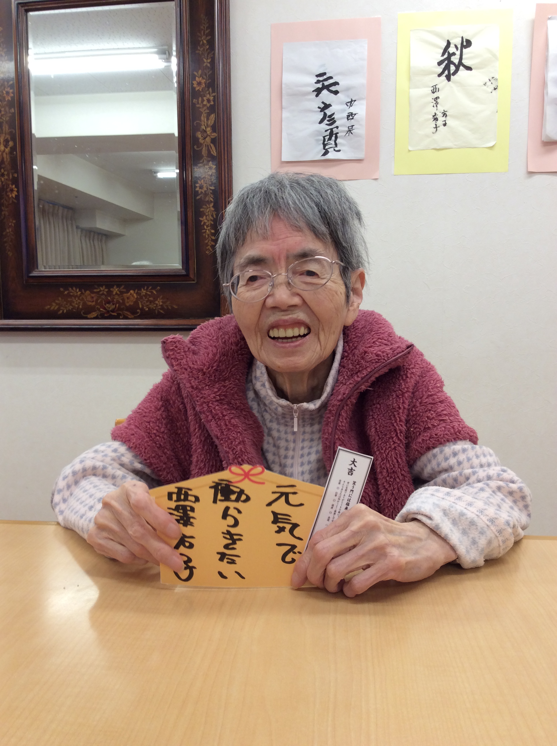 施設長にも新年書初めということで一筆書いて頂きました。作品名は「笑顔」です!