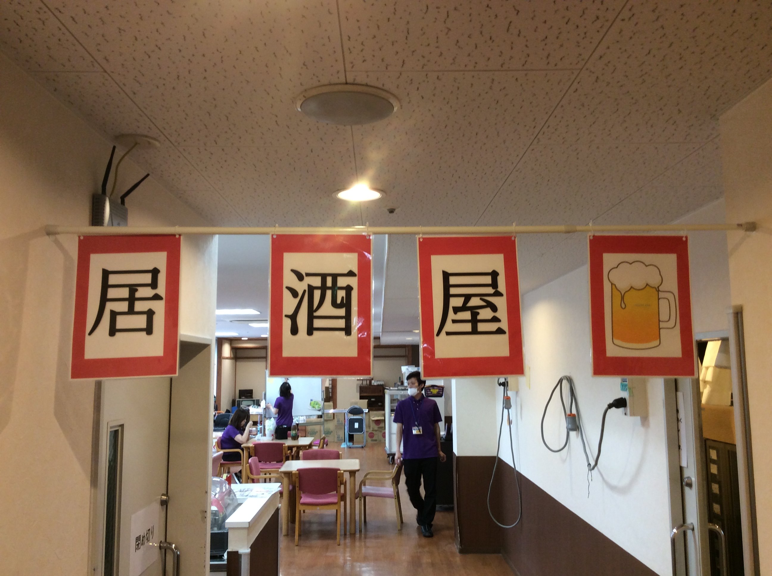 1階の食堂に飾りつけ、暖簾を掲げ、カラオケでBGMと雰囲気は、ばっちり居酒屋です!!