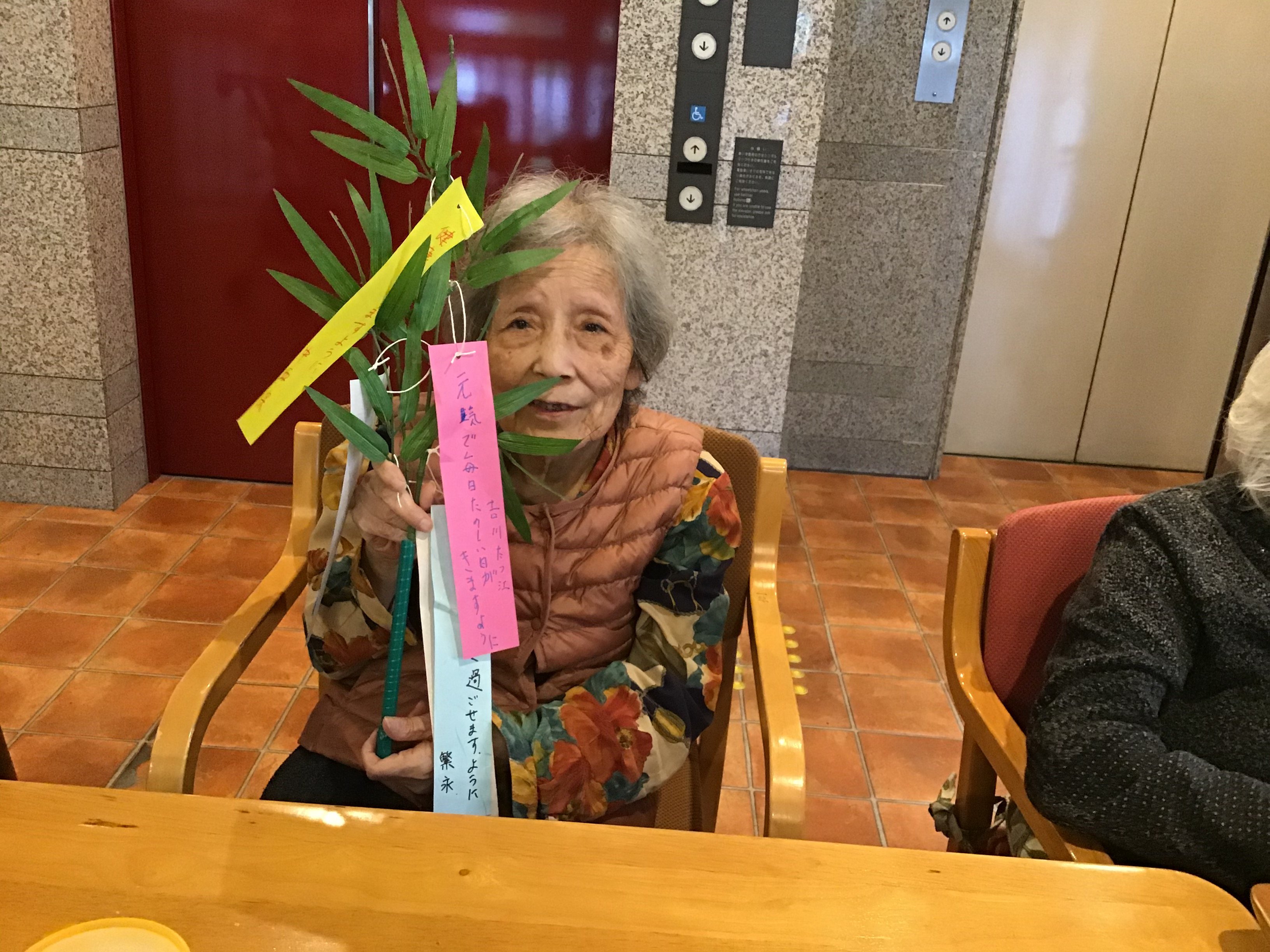 ご入居者、職員全員に願い事を短冊に書いて頂き、笹の葉に飾りつけをしました!(*^_^*)