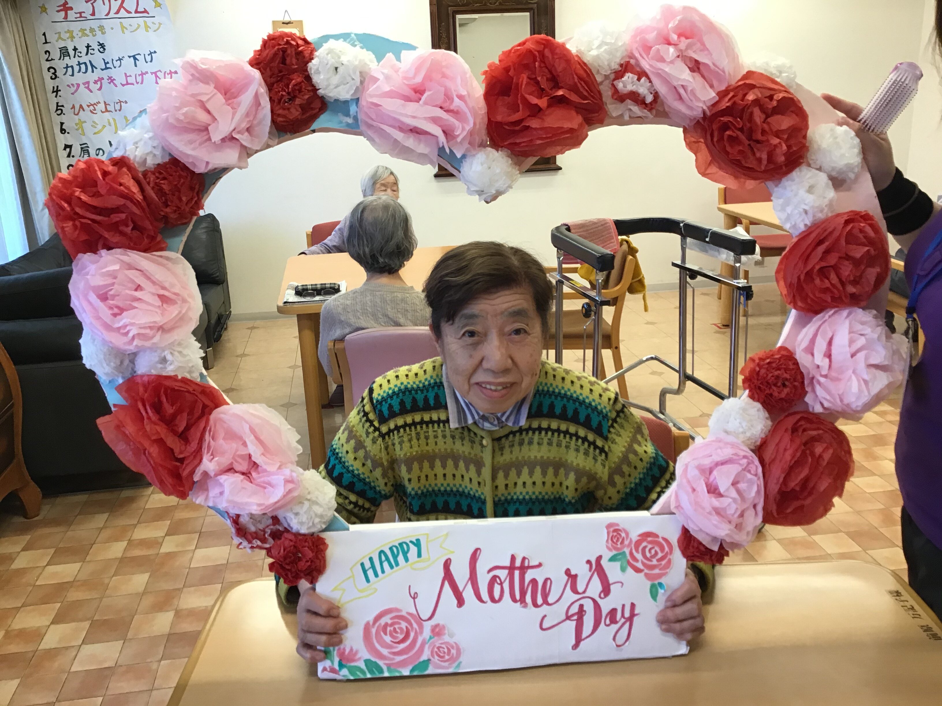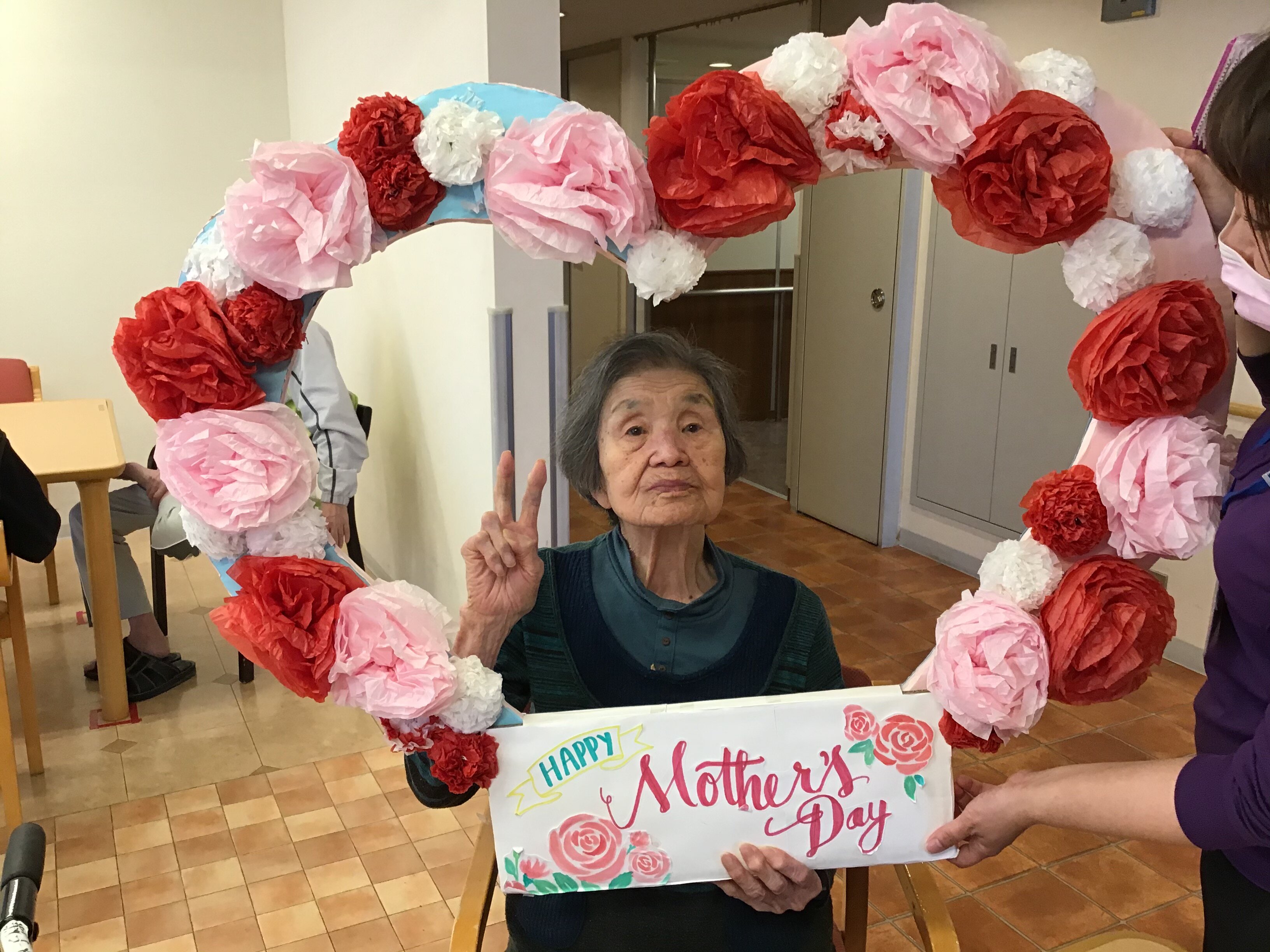 男性のご入居者の仮装が勇ましくて良いですね。皆様も気分転換されたのではないでしょうか。母の日の撮影用ハートも映えてますね。