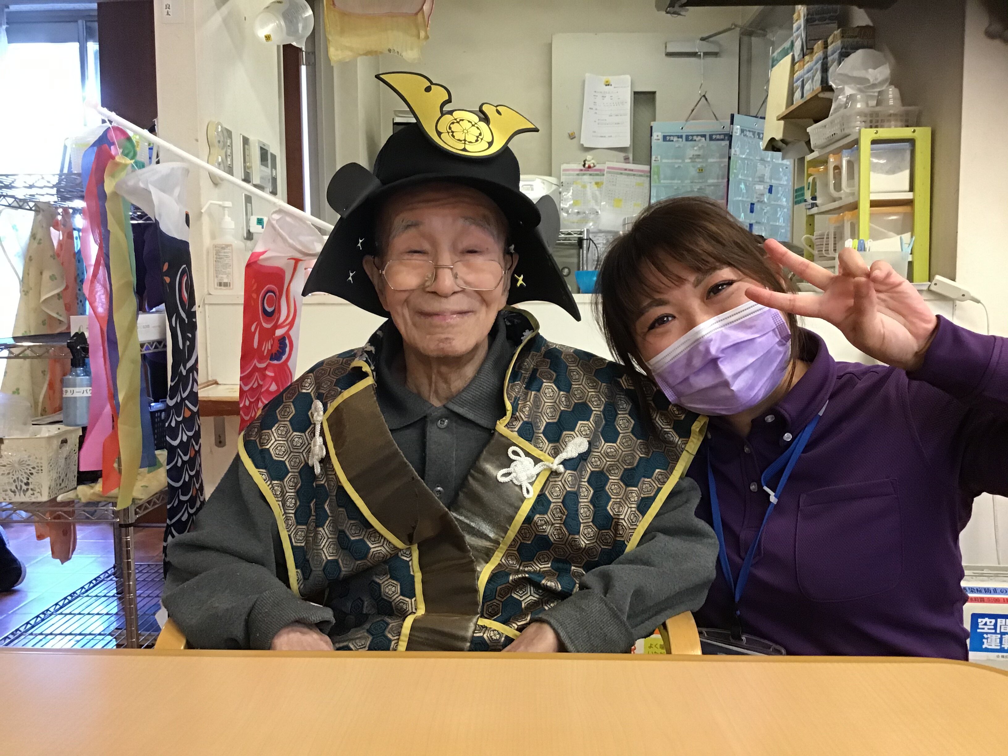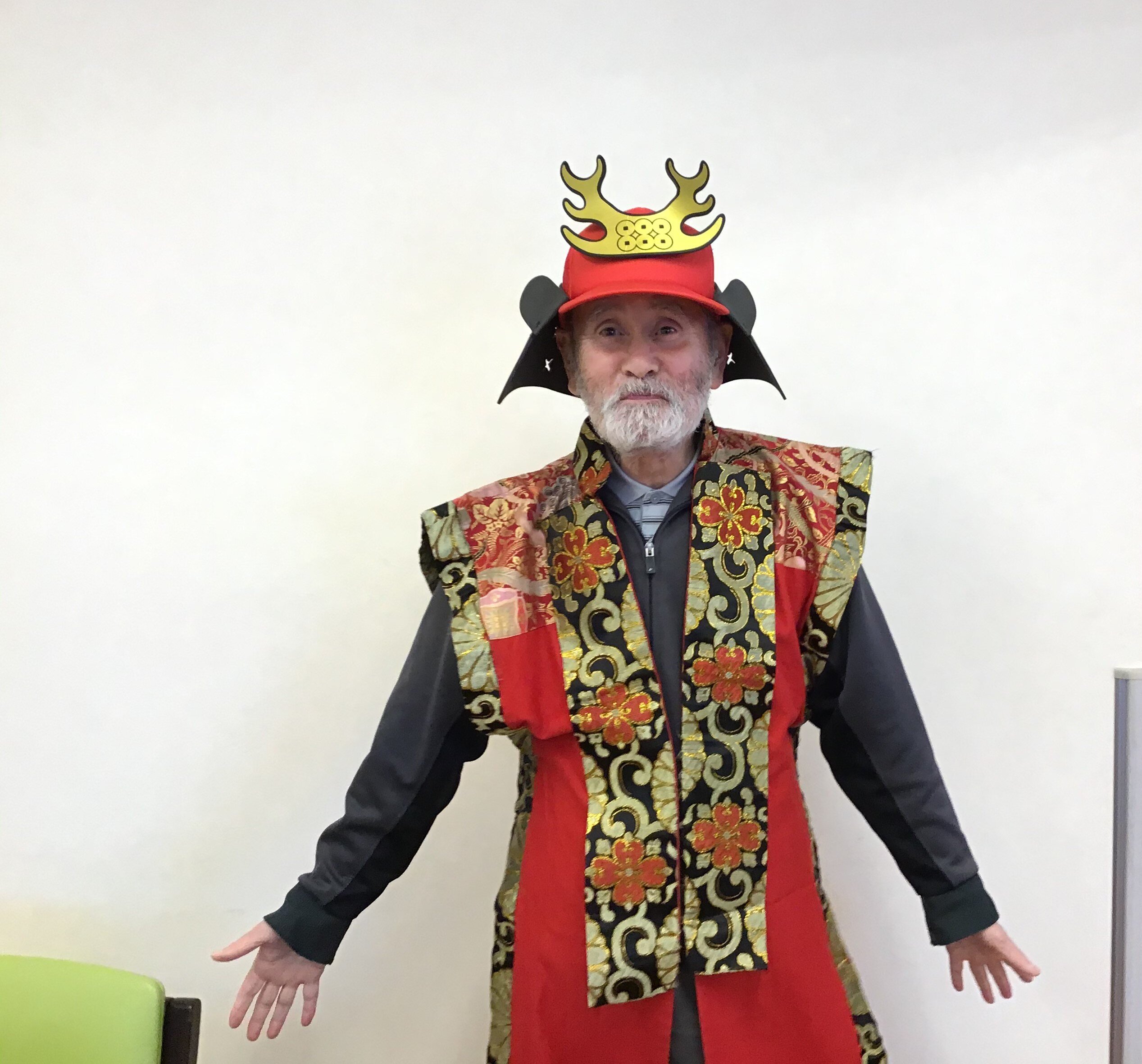 男性のご入居者はフロアにて陣羽織と兜を身に着けて頂きました!(^^)!