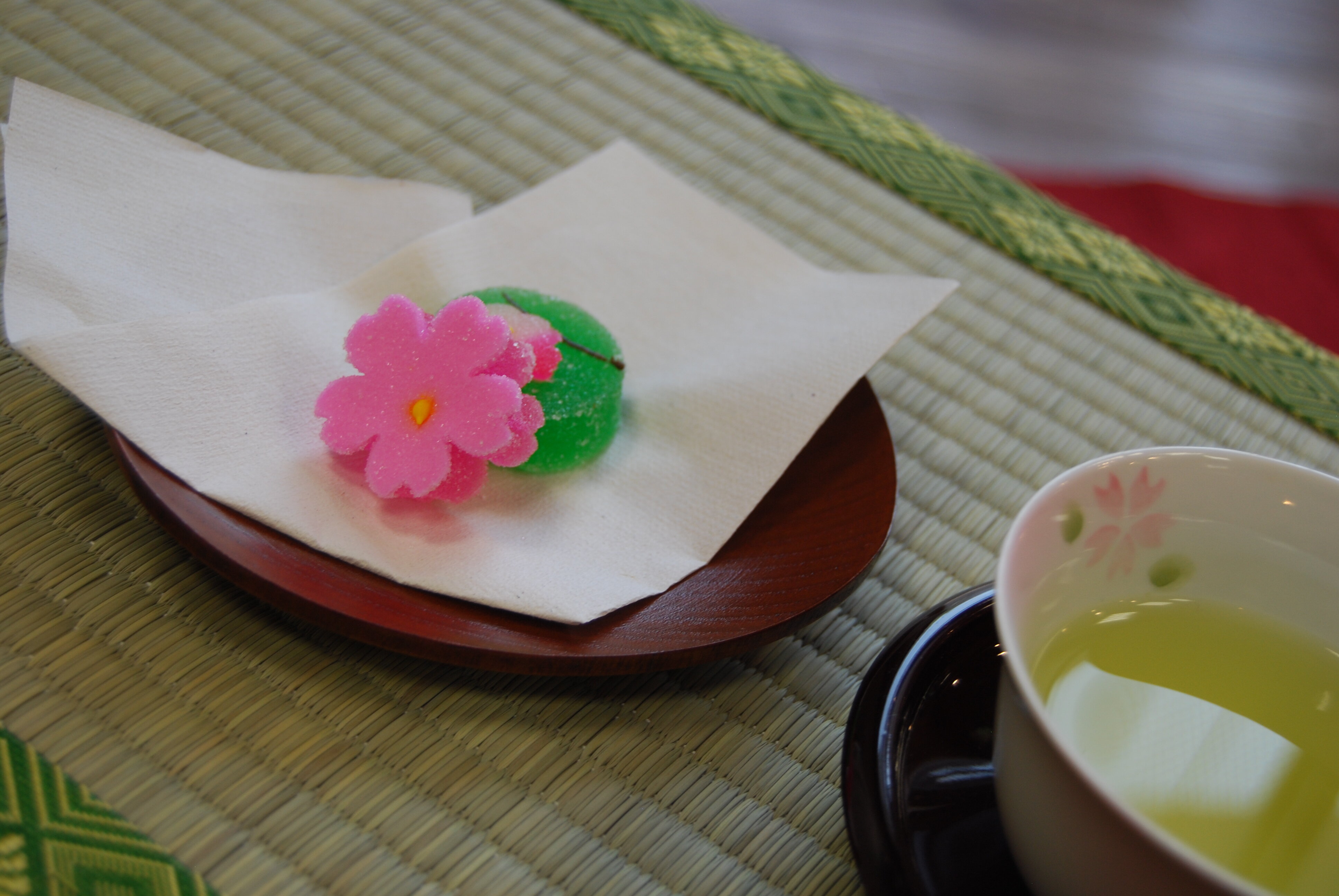 観光案内の後は、ご当地のお菓子とお抹茶ならぬ緑茶でティータイム♪
