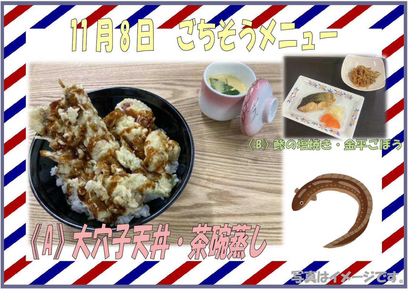 来週のご馳走メニューは『あなご天丼』となっております。ごはんが美味しい週になってますね♪