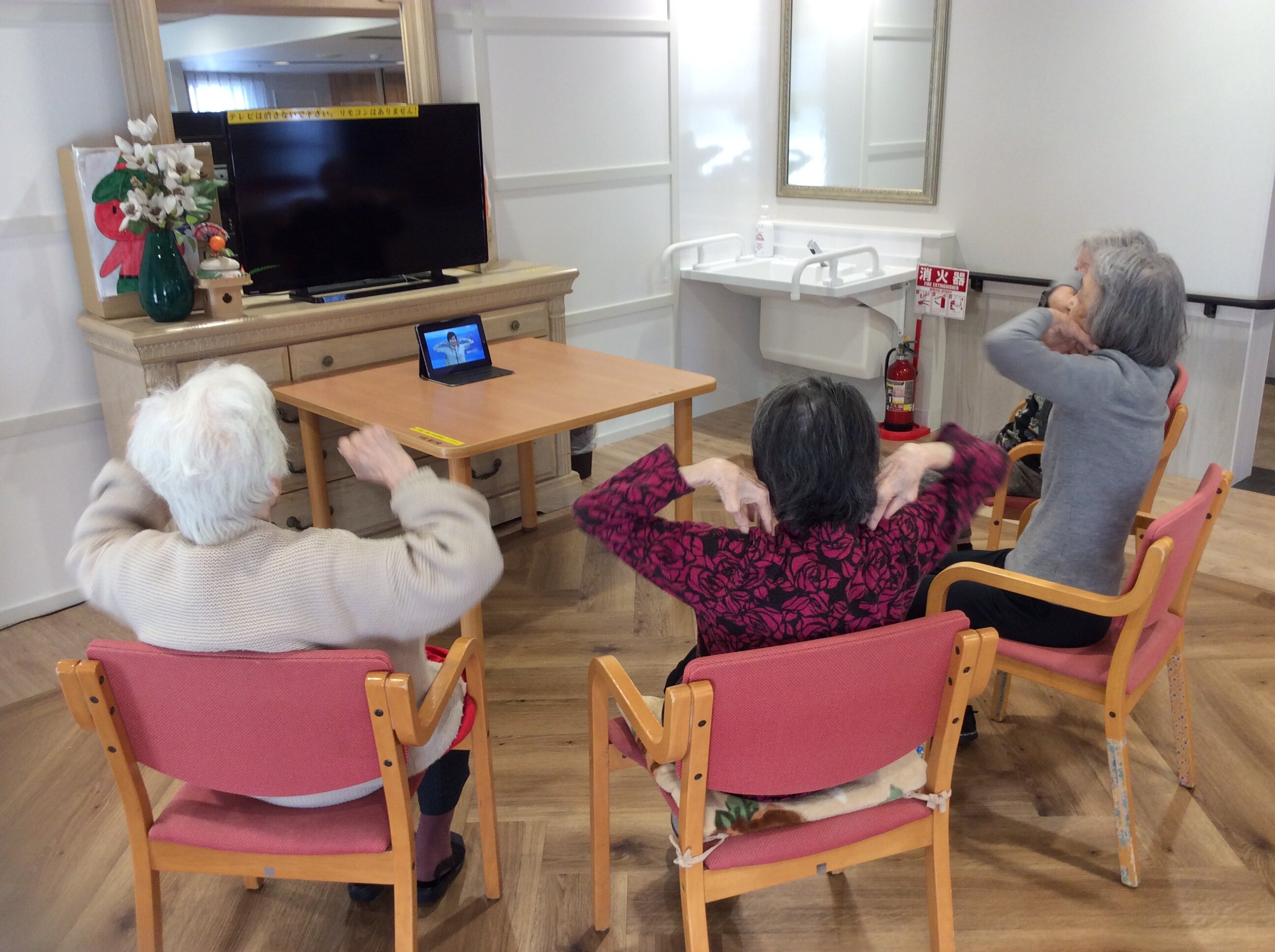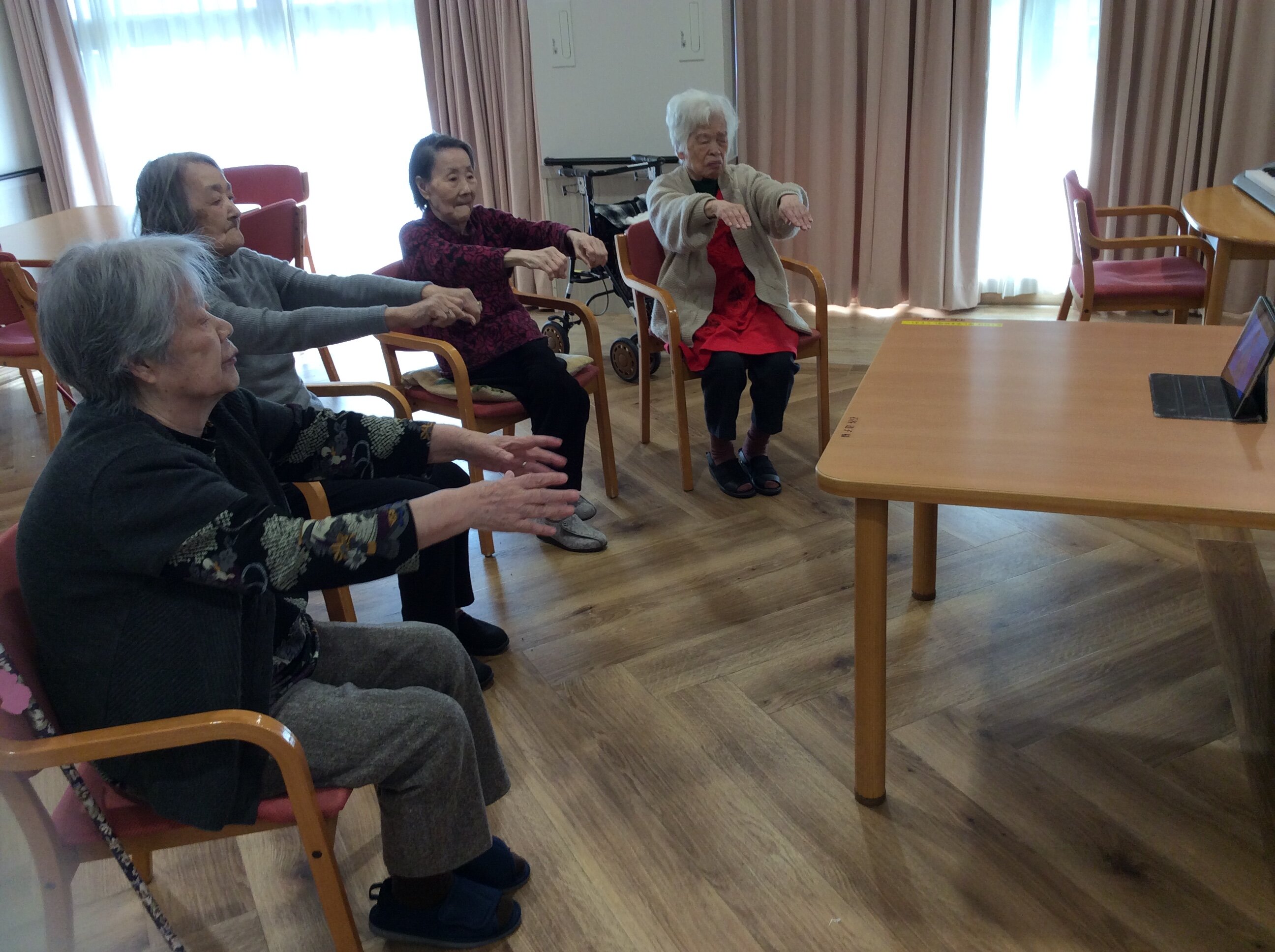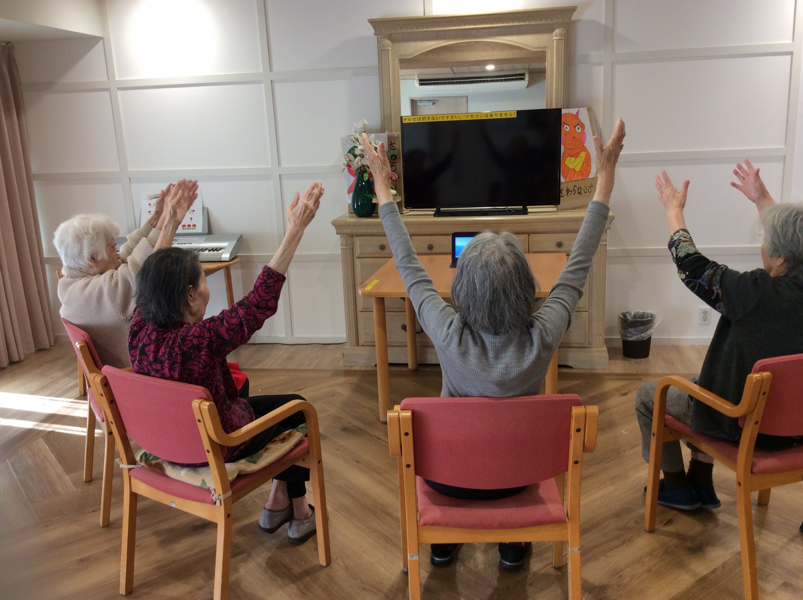 椅子体操の動画は1回約15分ですが、意欲的なご入居者は2回目も3回目も参加され、長時間にわたり身体を動かされております★