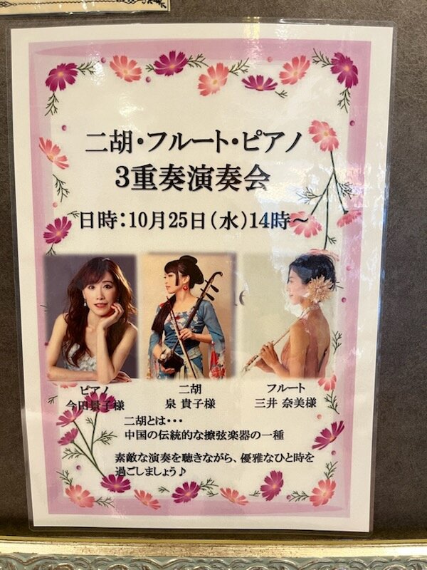 フルートとピアノ、そして中国の伝統的な楽器「二胡」の素敵な演奏会です(*^^*)