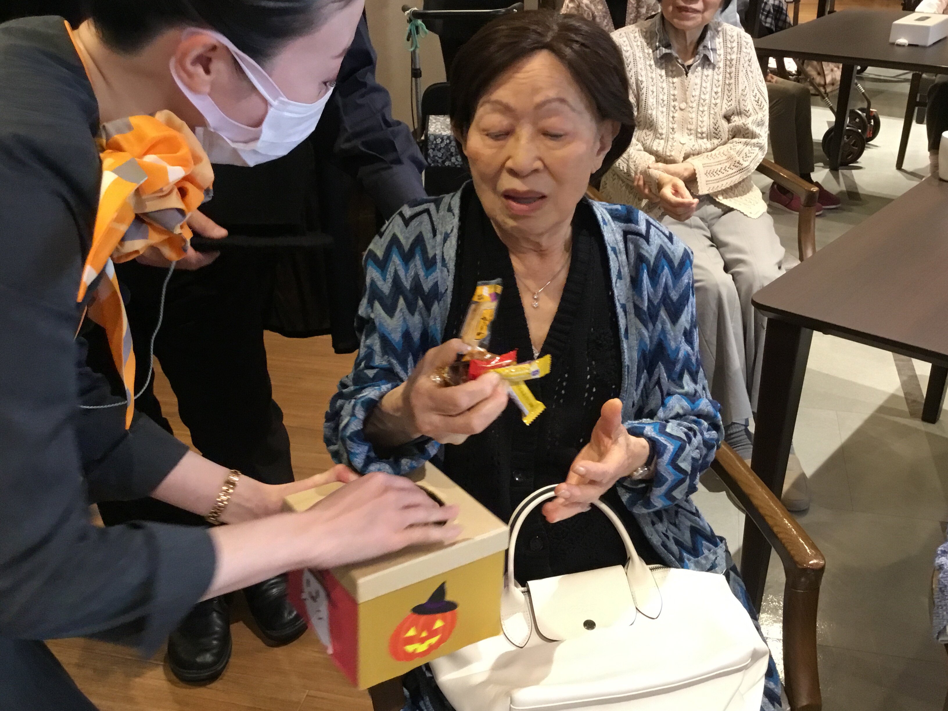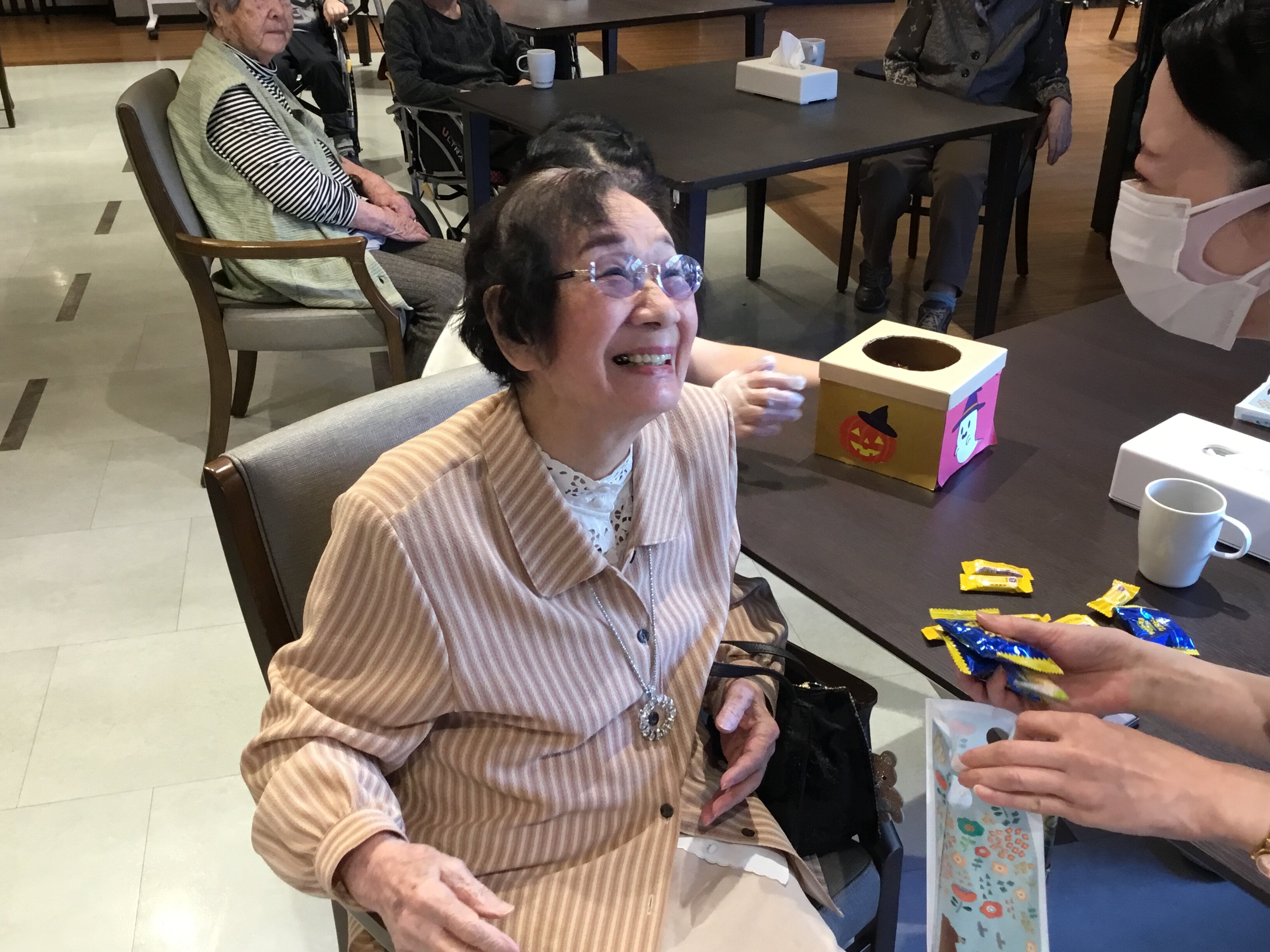 14時開始の15分前にはご入居者の皆様が「もう始まった?」「早く買いたいの~」「前回買ったお菓子が美味しかった