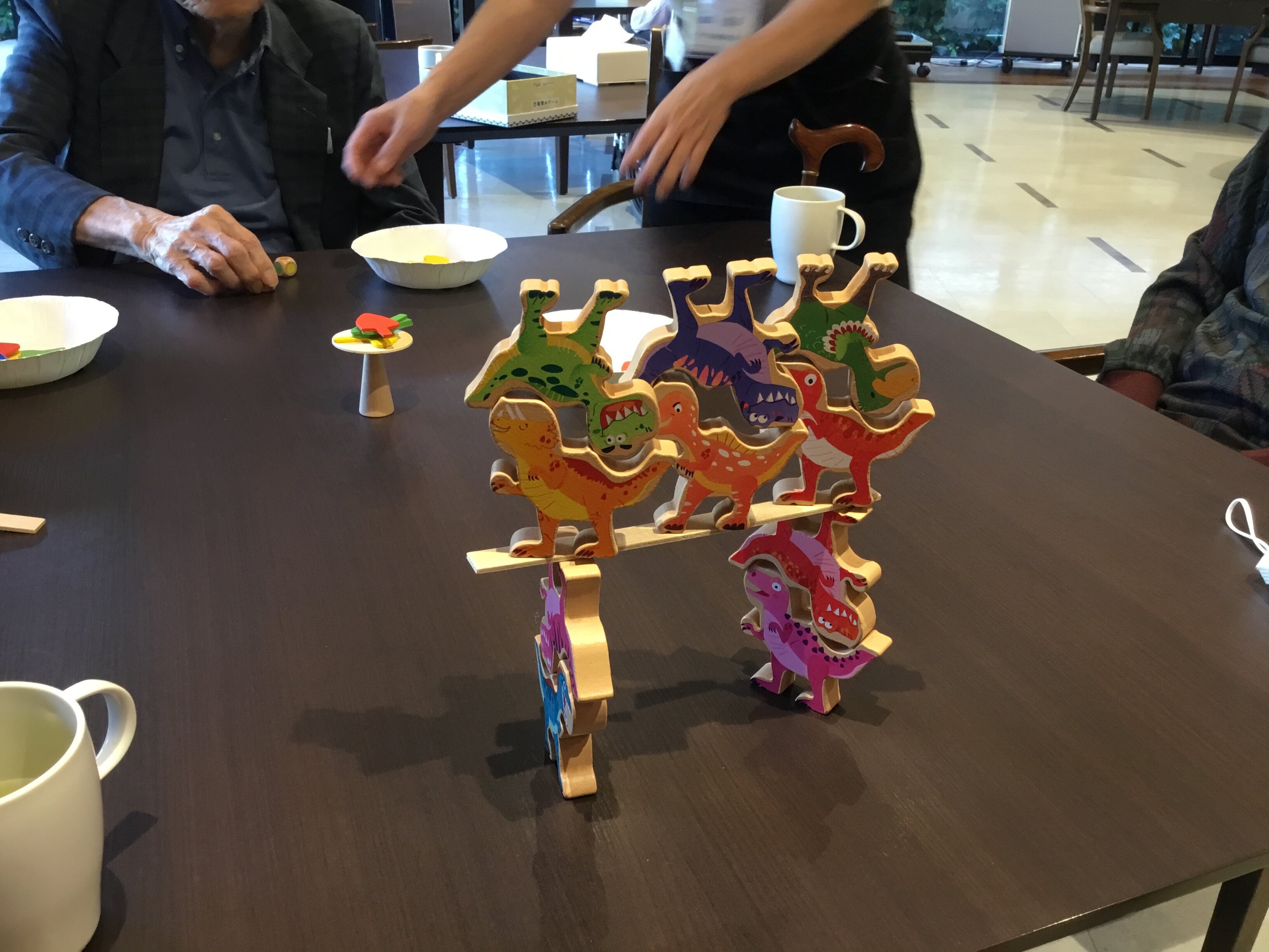 恐竜の積み木をいろいろな形に積み上げたり、誰が一番高く積み上げれるかを競争したり、