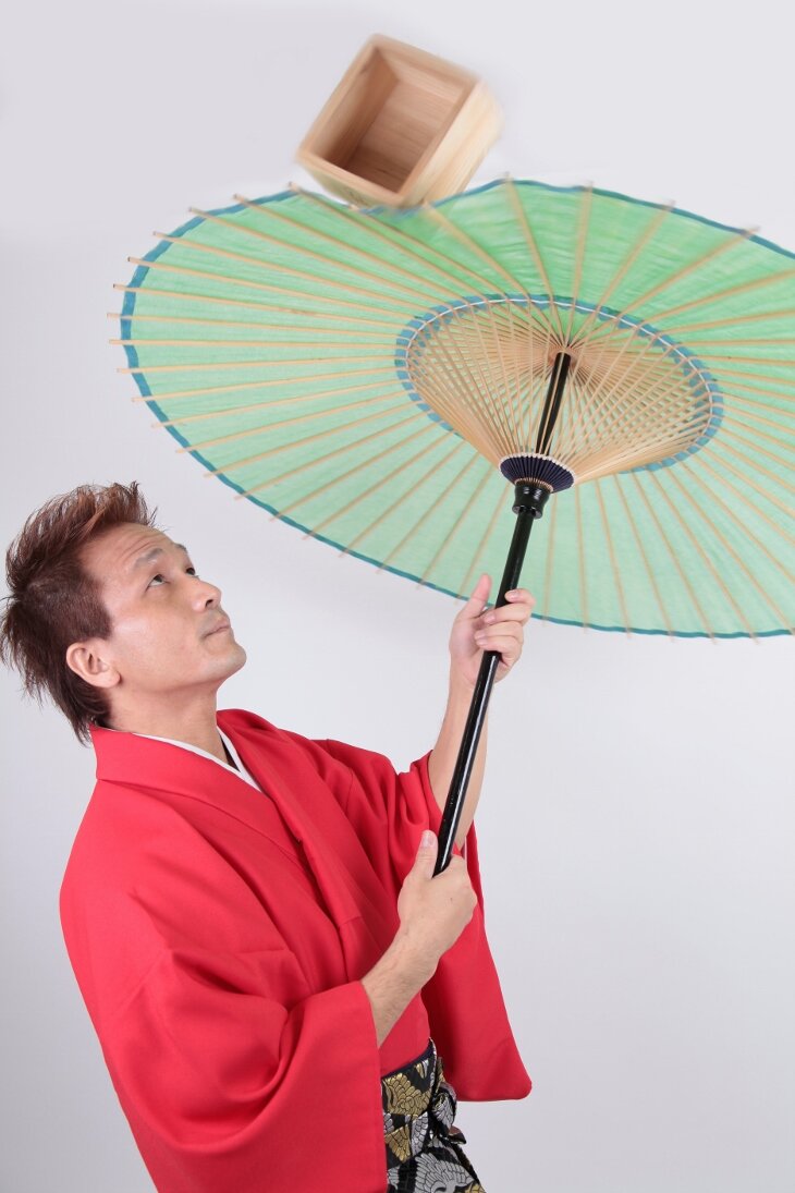和傘の上で毬や湯呑茶碗、リングや升を回します。