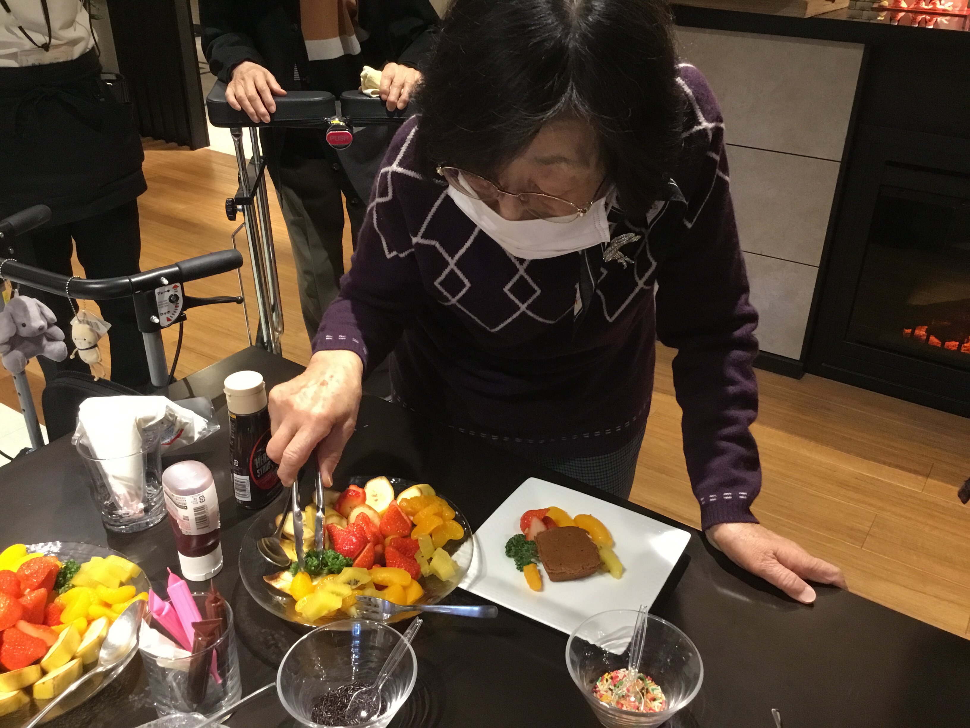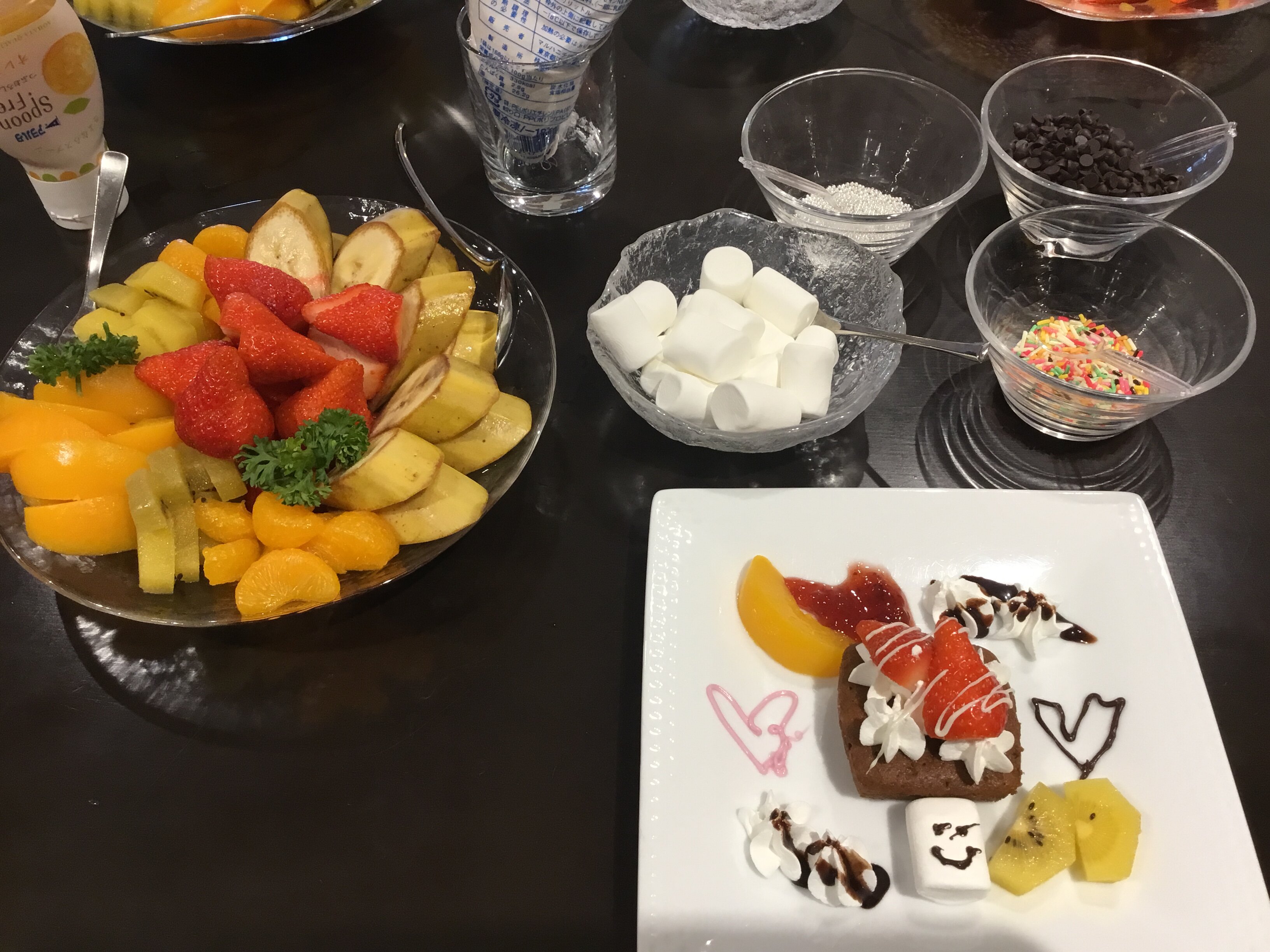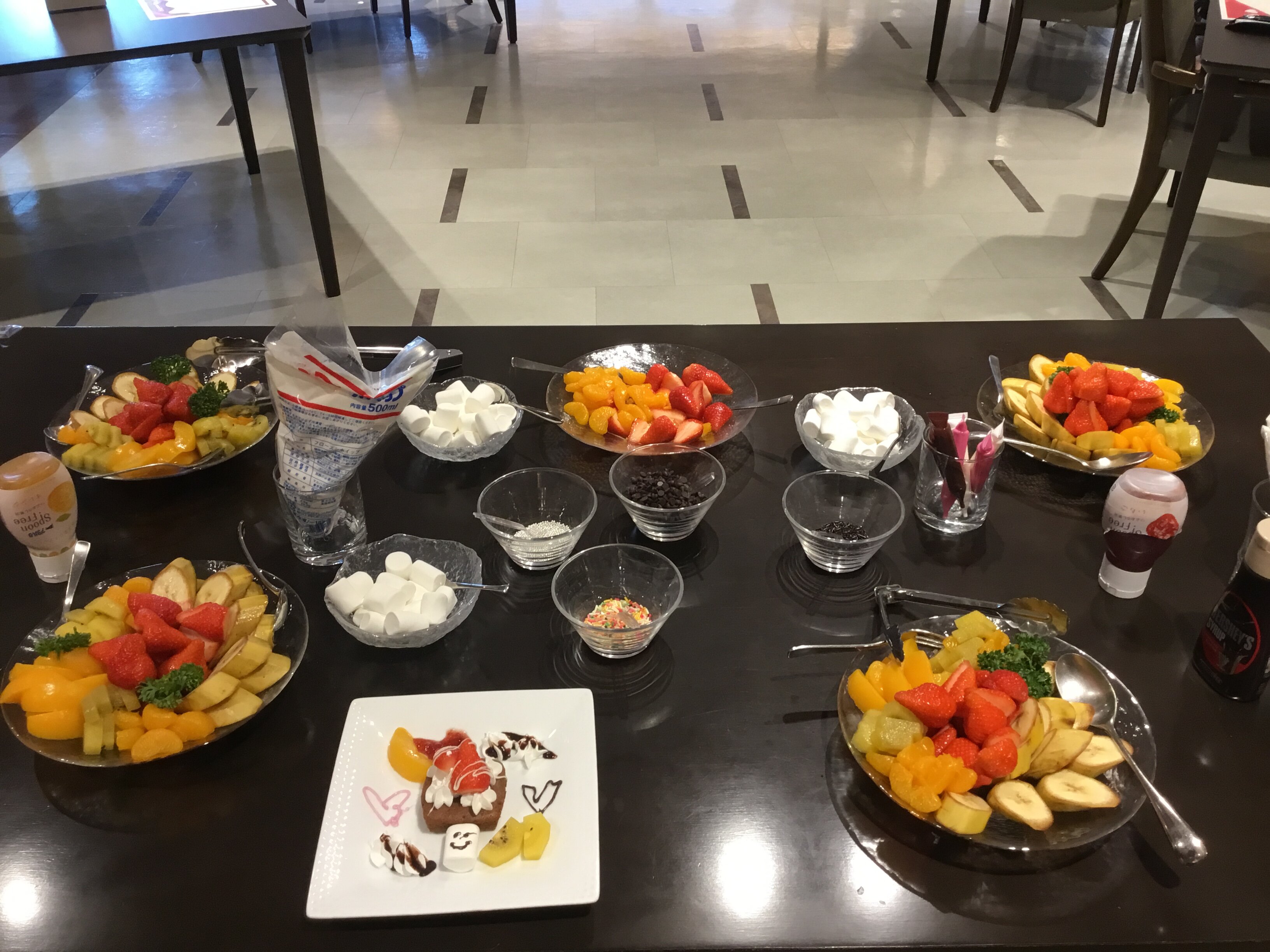 たくさんのフルーツと、ホイップクリーム、チョコレートやマシュマロの