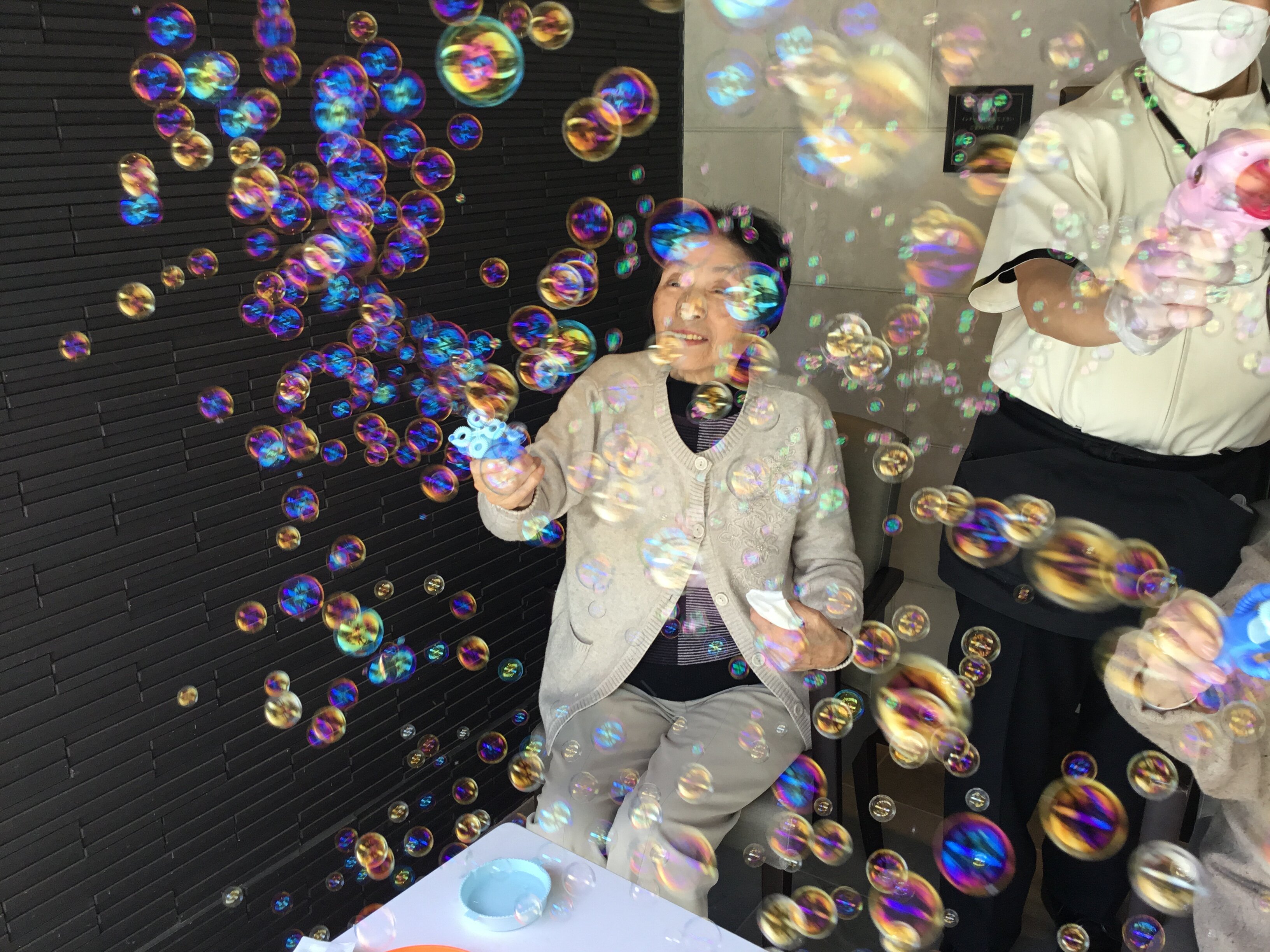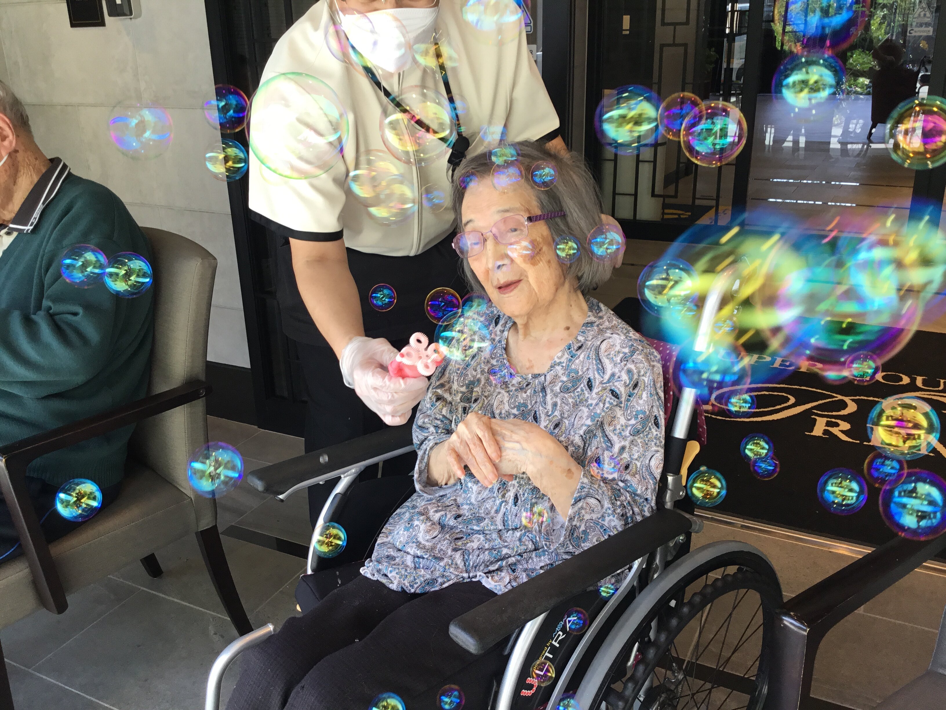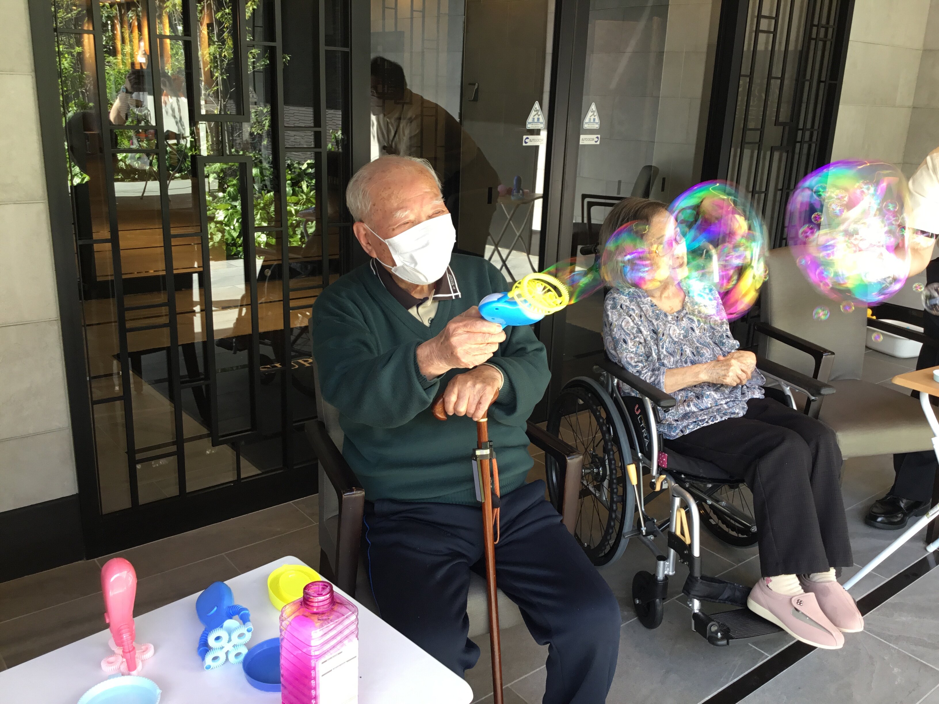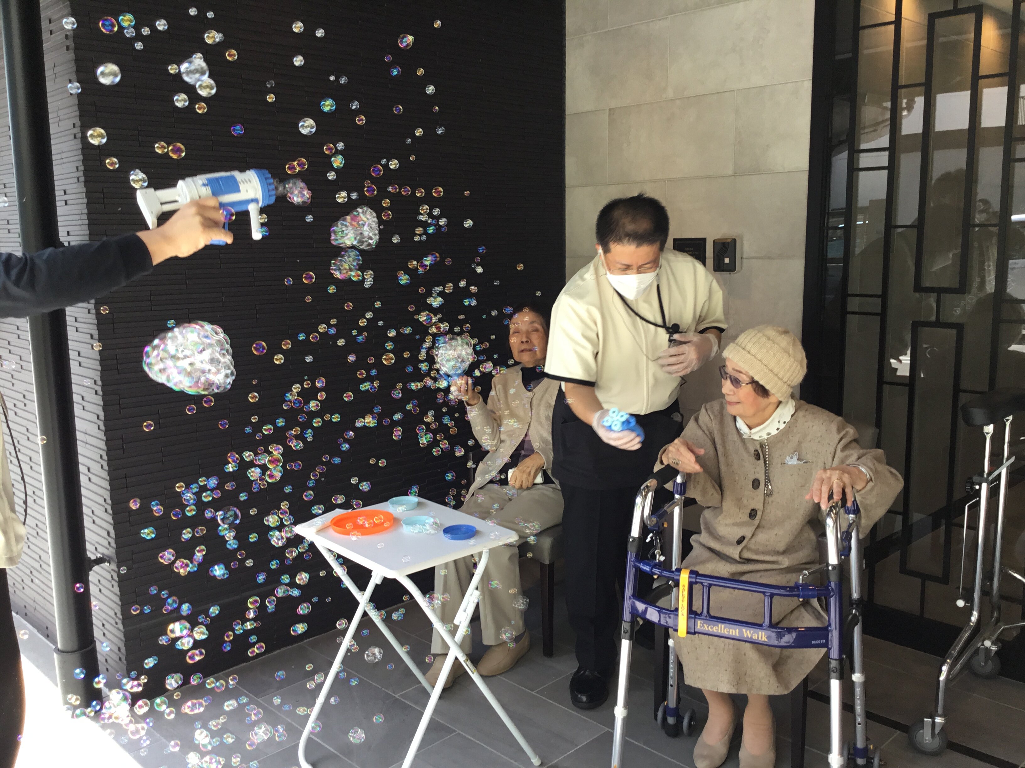 シャボン玉に囲まれて外の空気もしっかりと吸っていただいて