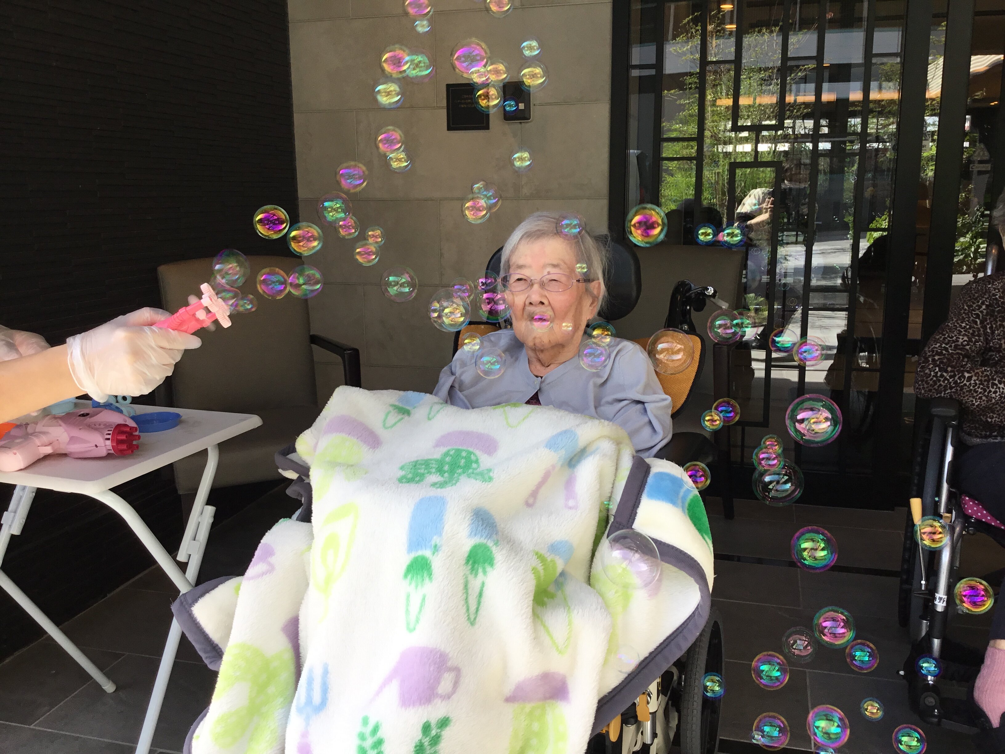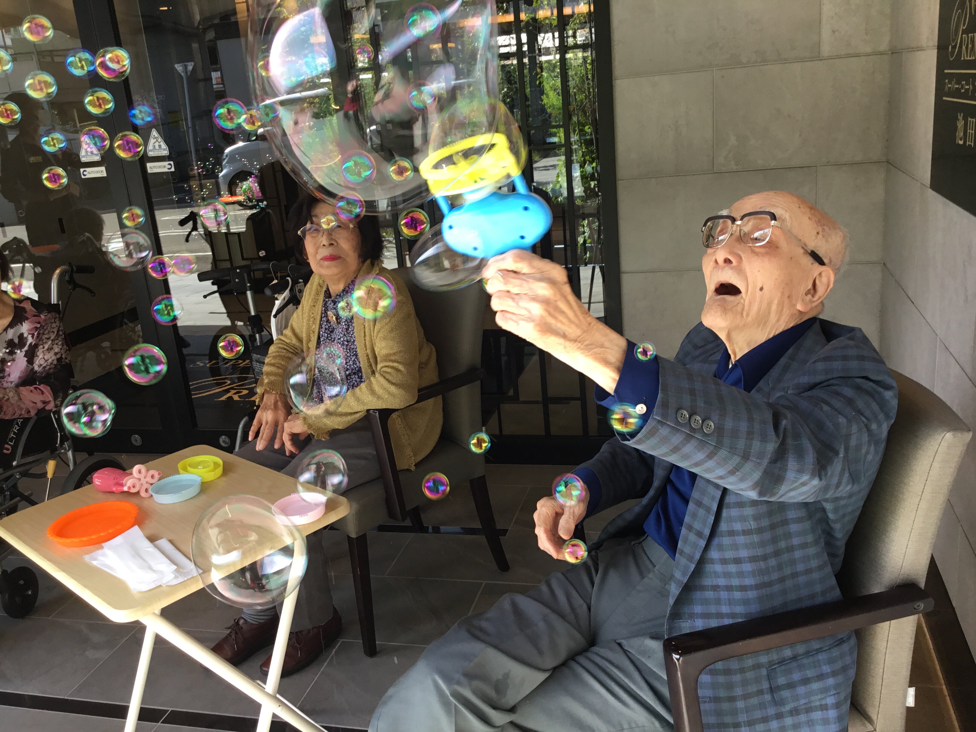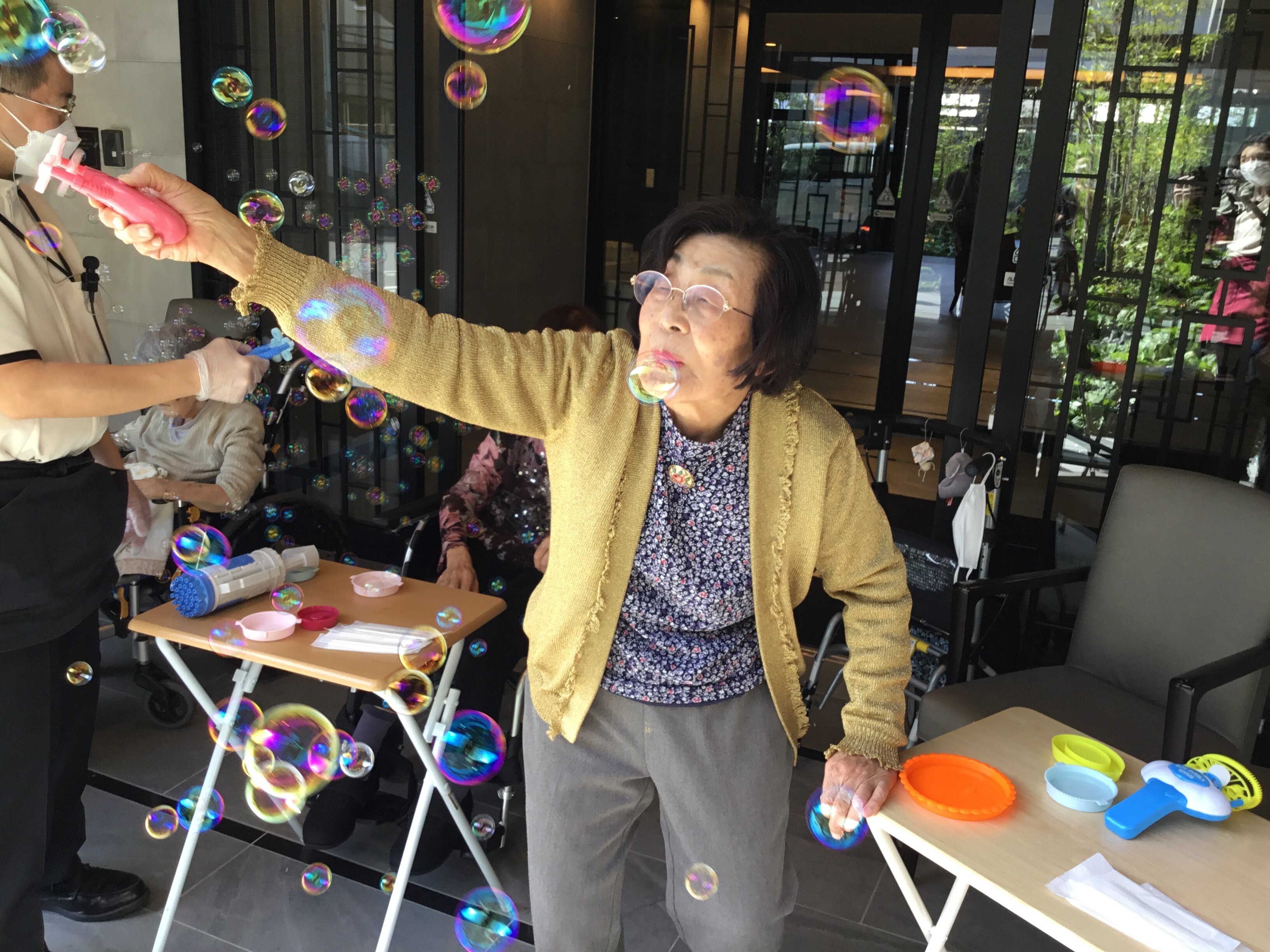 シャボン玉に囲まれて外の空気もしっかりと吸っていただいて