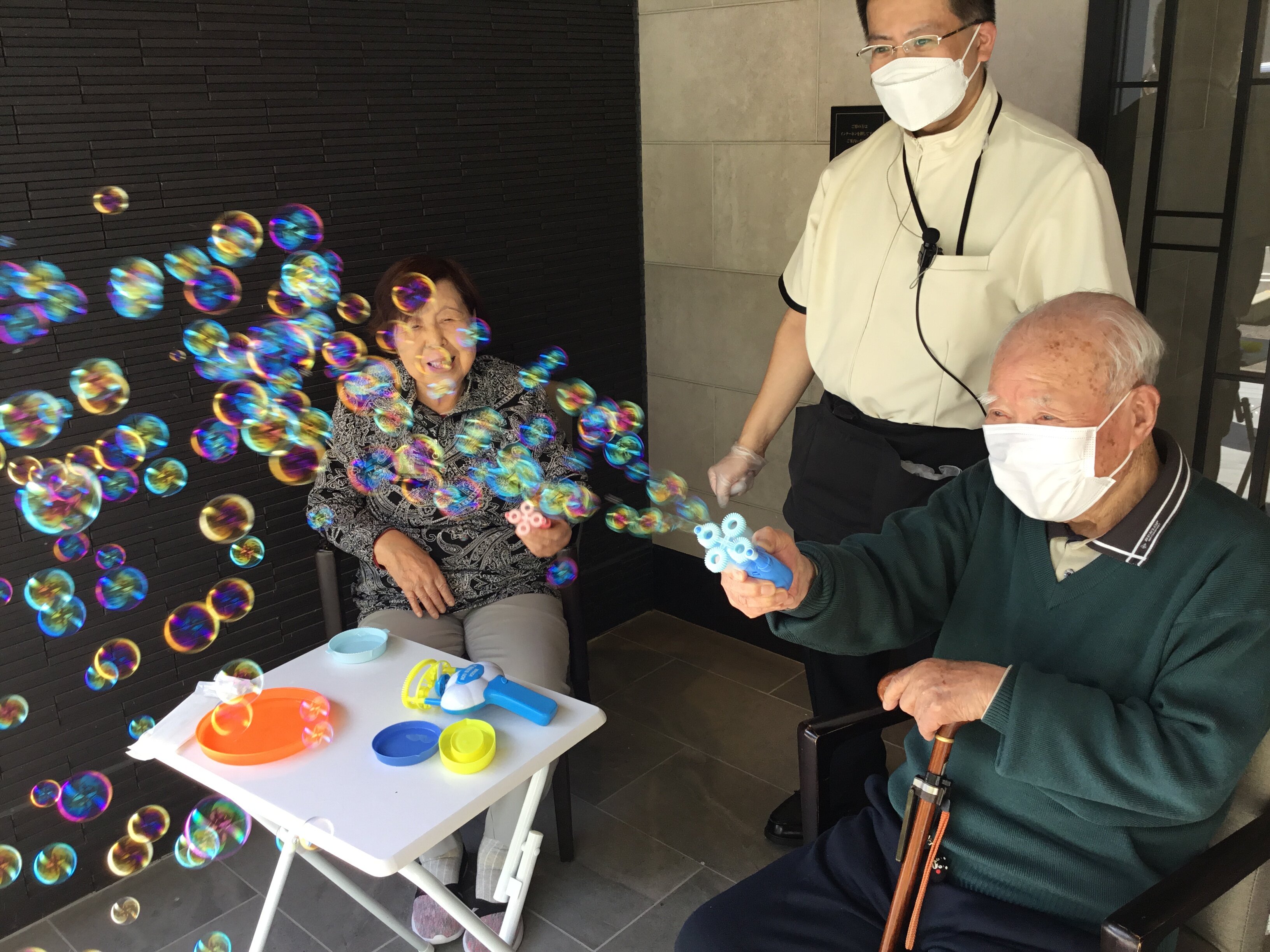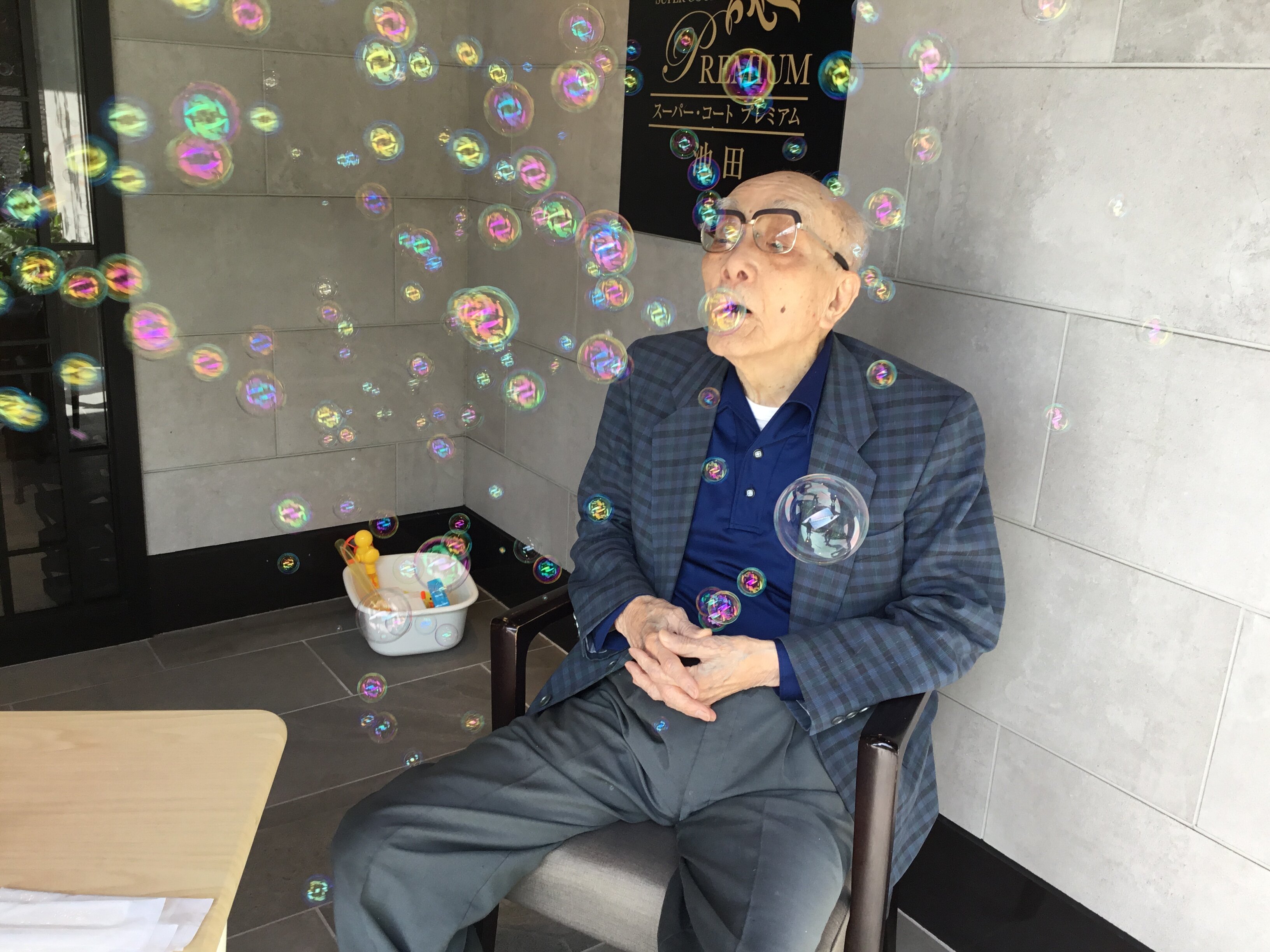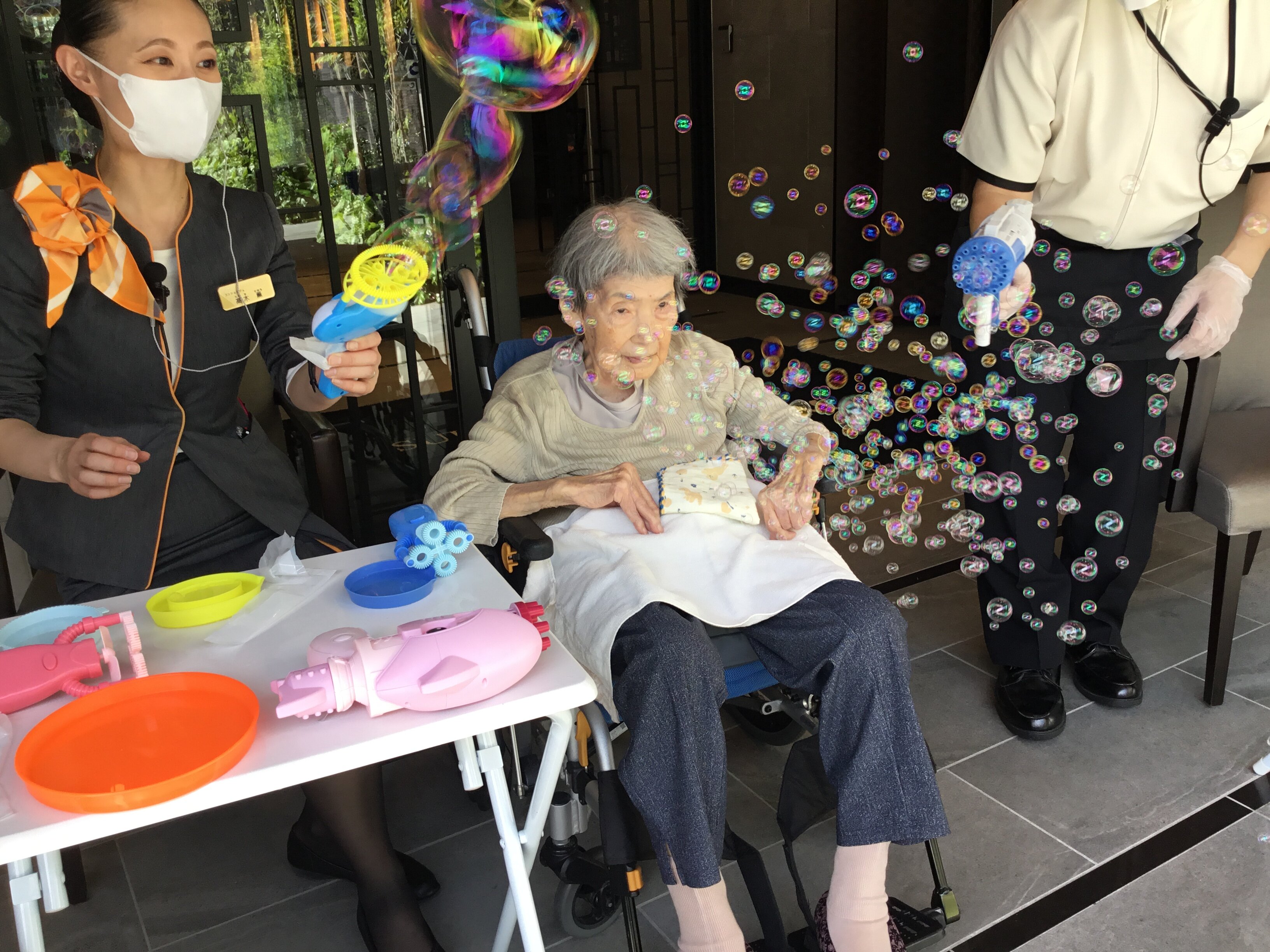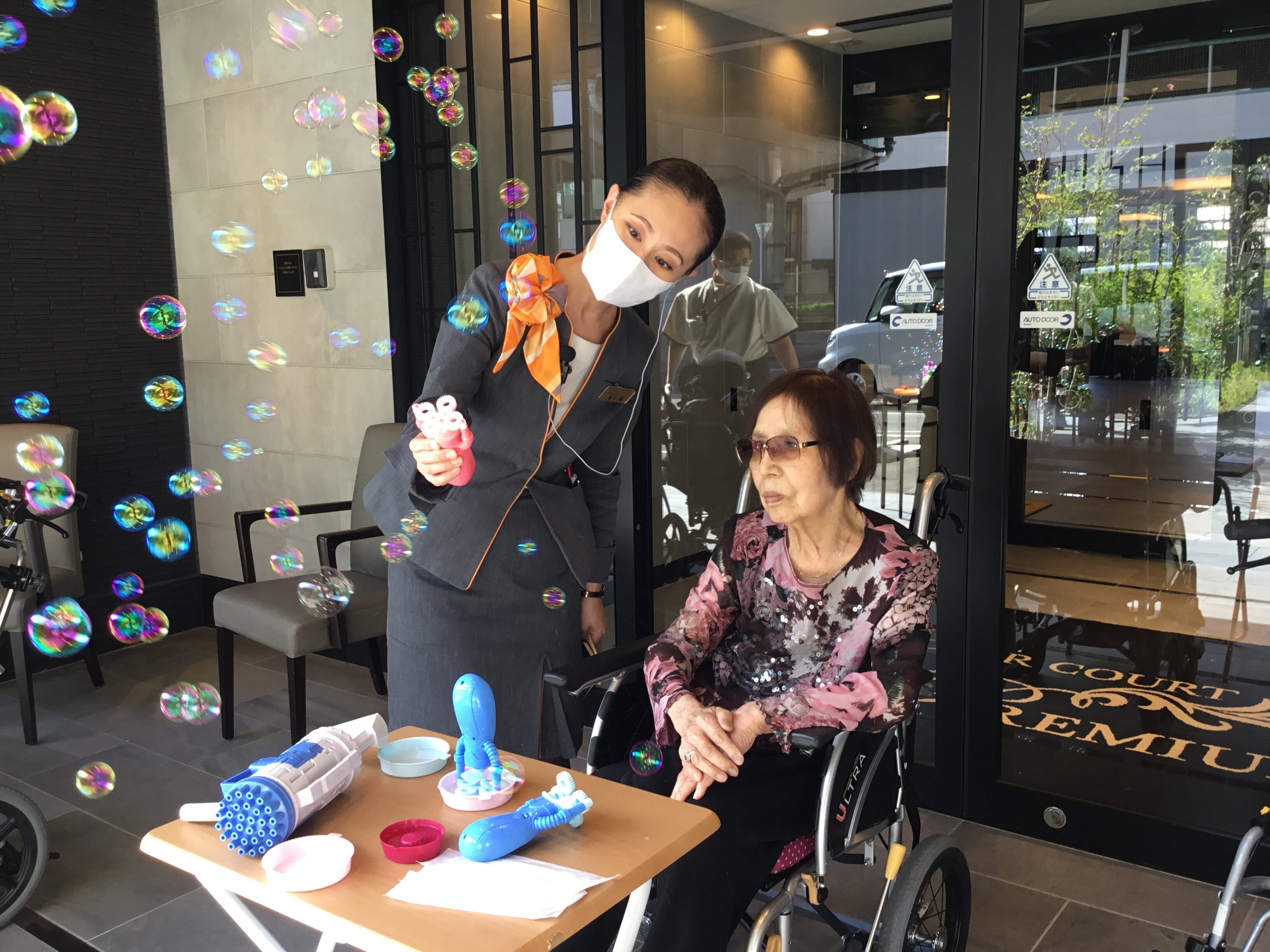 シャボン玉に囲まれて外の空気もしっかりと吸っていただいて