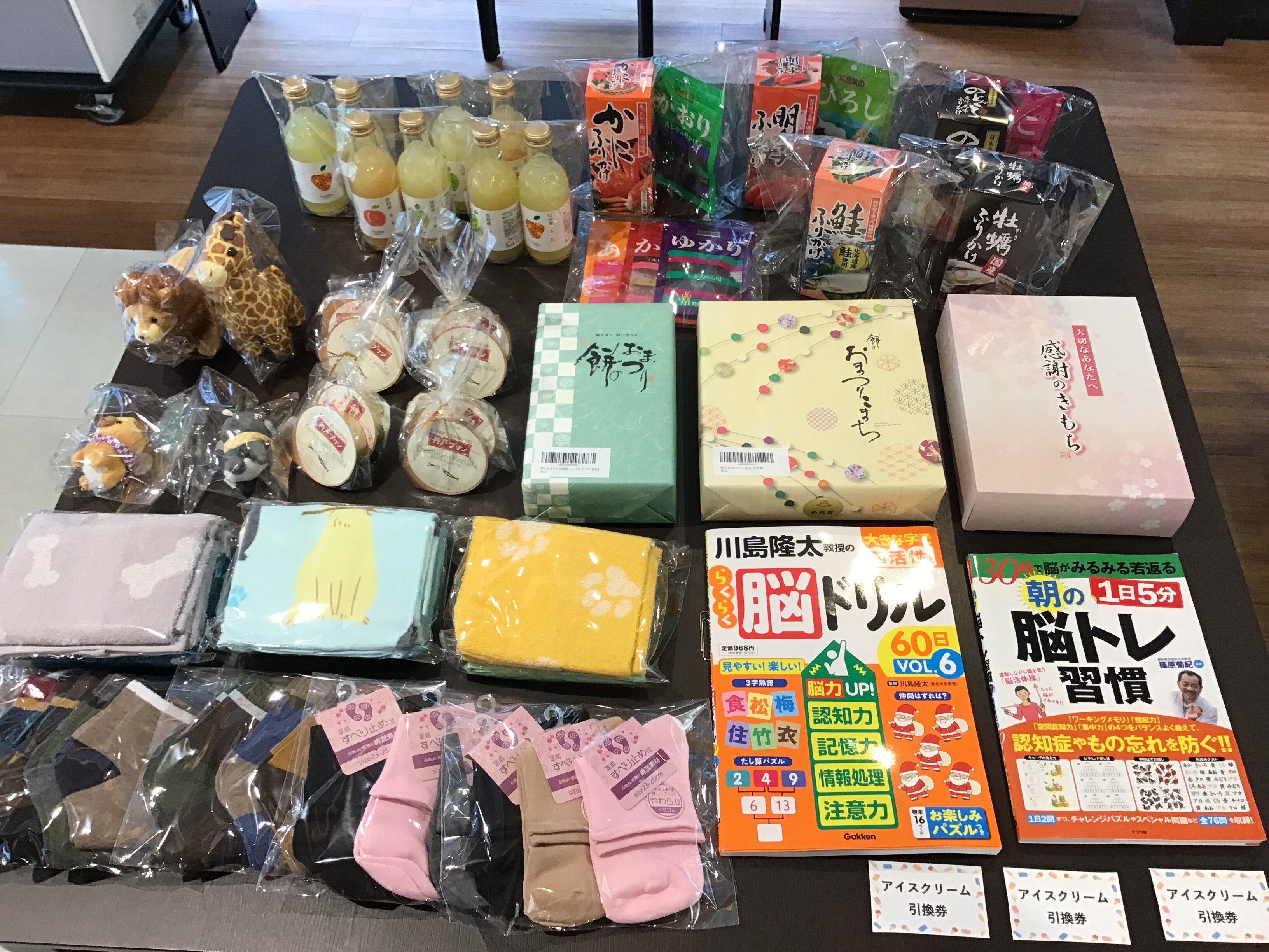 靴下、タオル、ジュース詰合せ、ご飯のお供(ふりかけ)、おかき、脳トレドリルなどなど!