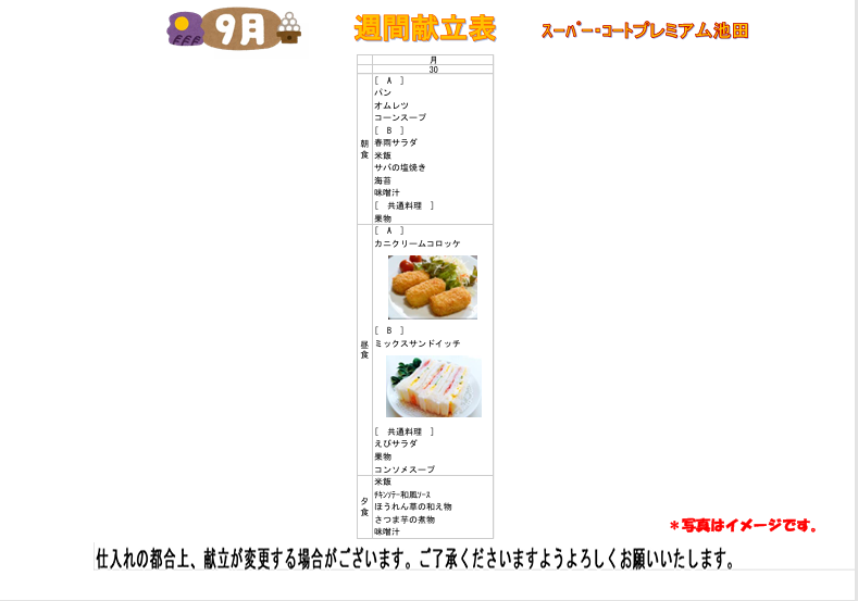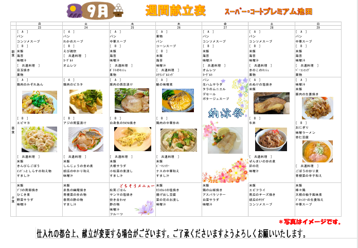 今回は9/23~9/30までの献立表をご紹介させて頂きます!