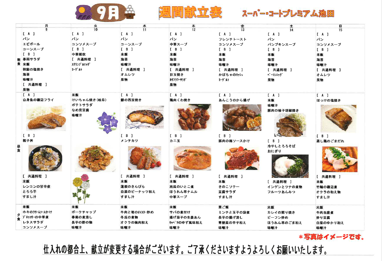 さて、今日は来週からのお食事の献立表(9/9~9/22まで)をご紹介します!