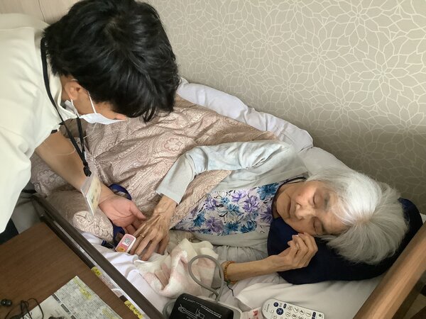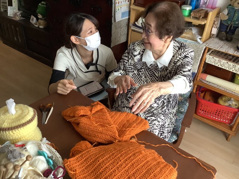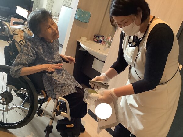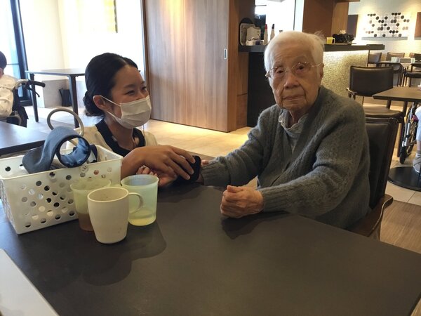 続いて看護師によるラウンドです。お一人お一人とコミュニケーションを取り、会話の中で体調確認や、時には人生の大先輩として人生相談もして頂いたり♪会話をすることで信頼関係を築いていると、小さな異変にもすぐに気づく事が出来ます。