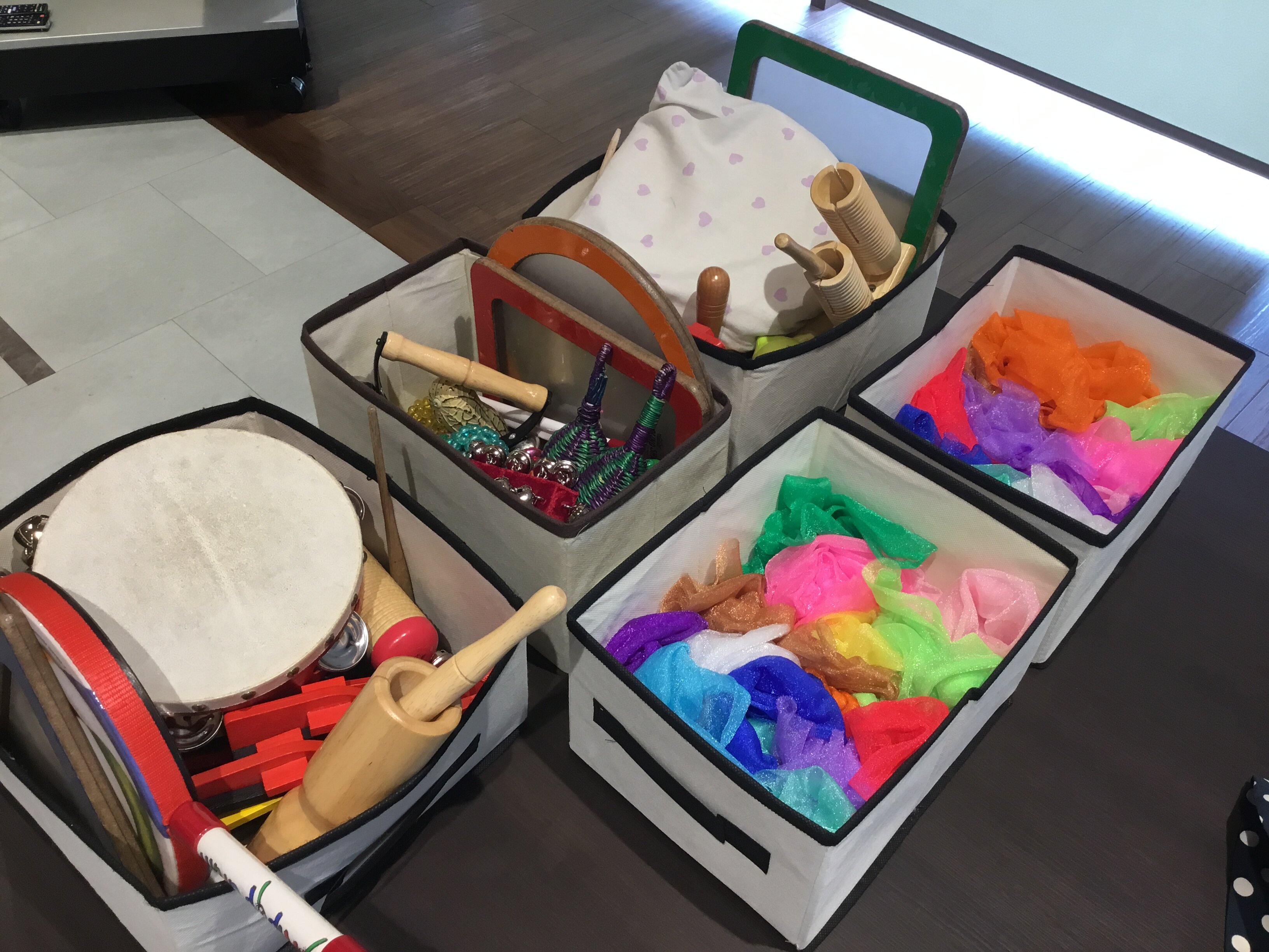 いつものたくさんの楽器と今回はスカーフを持ってきてくださいました。