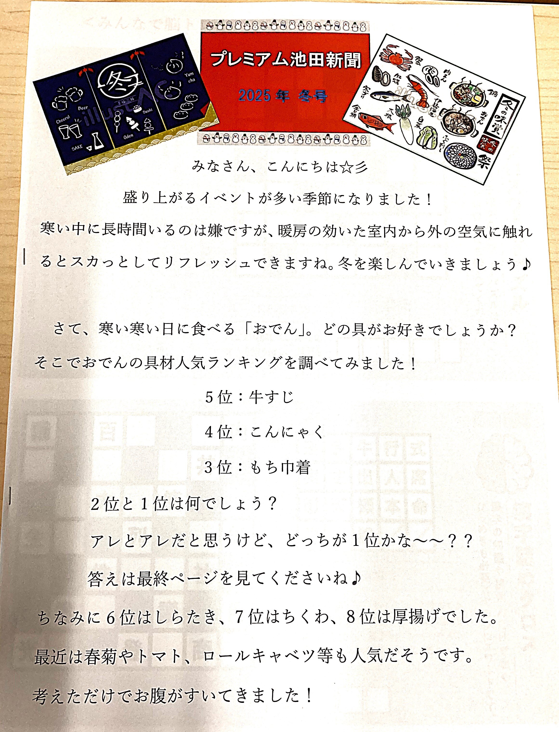 さて、今回はプレミアム池田が年4回発行している「プレミアム池田新聞 2025年冬号」についてご案内です。
