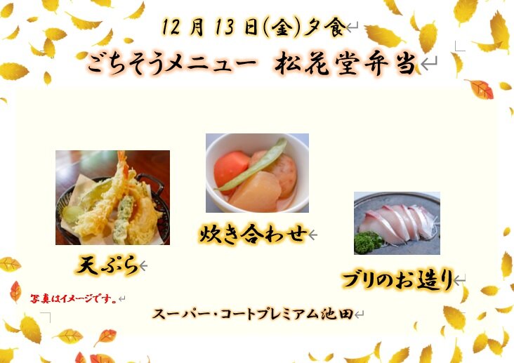 遅くなりましたが、12/1本日からの献立表をご紹介いたします('ω')ノ![]()