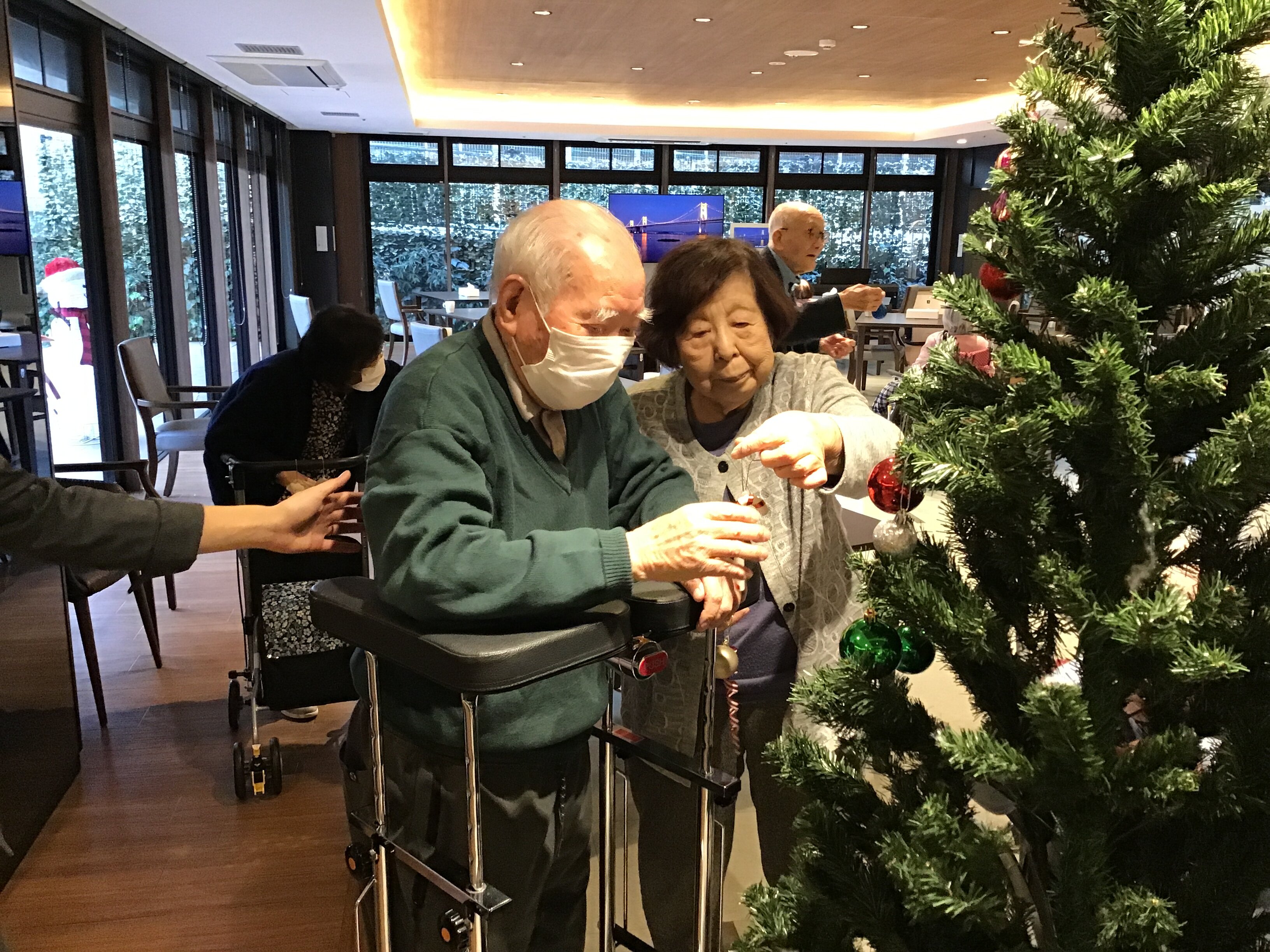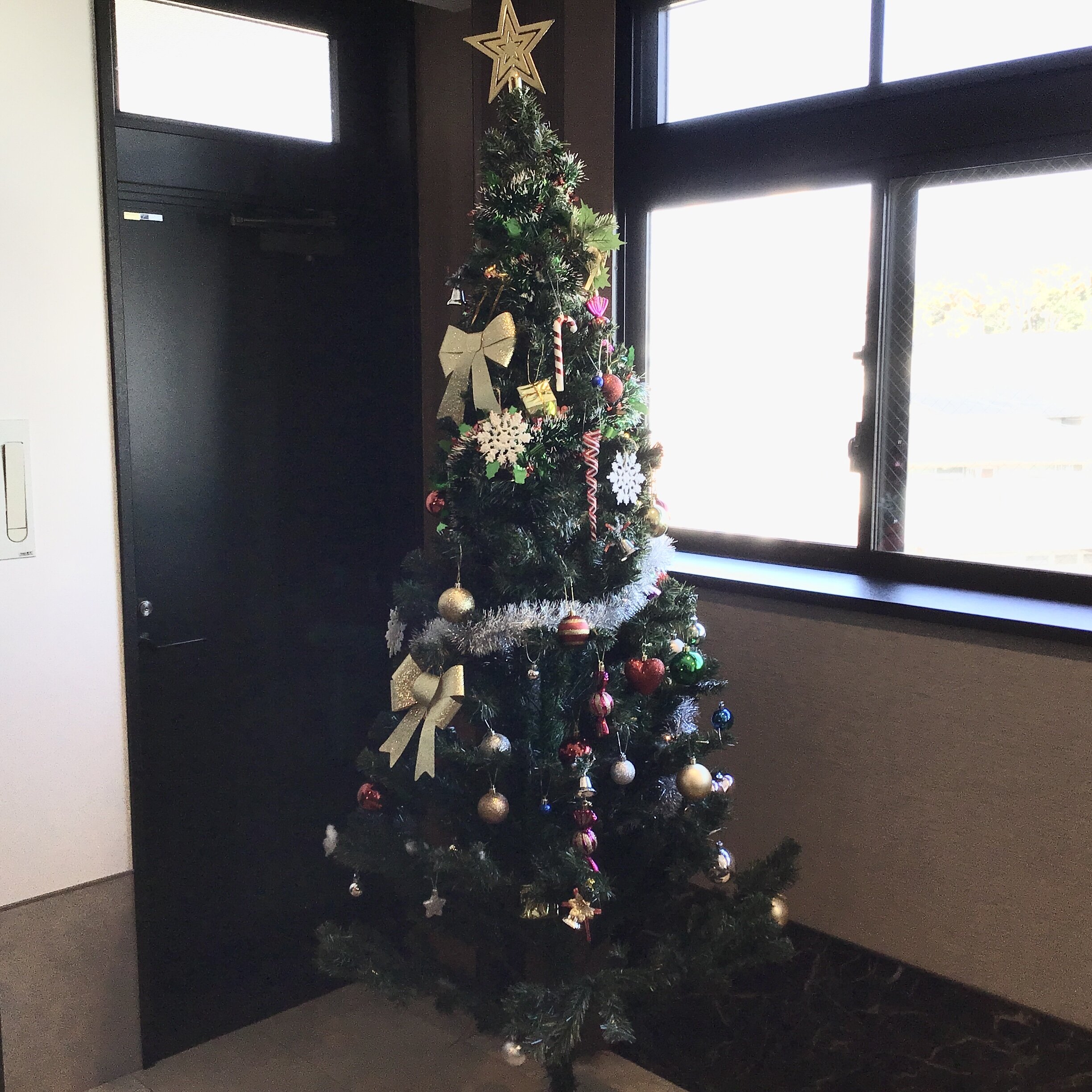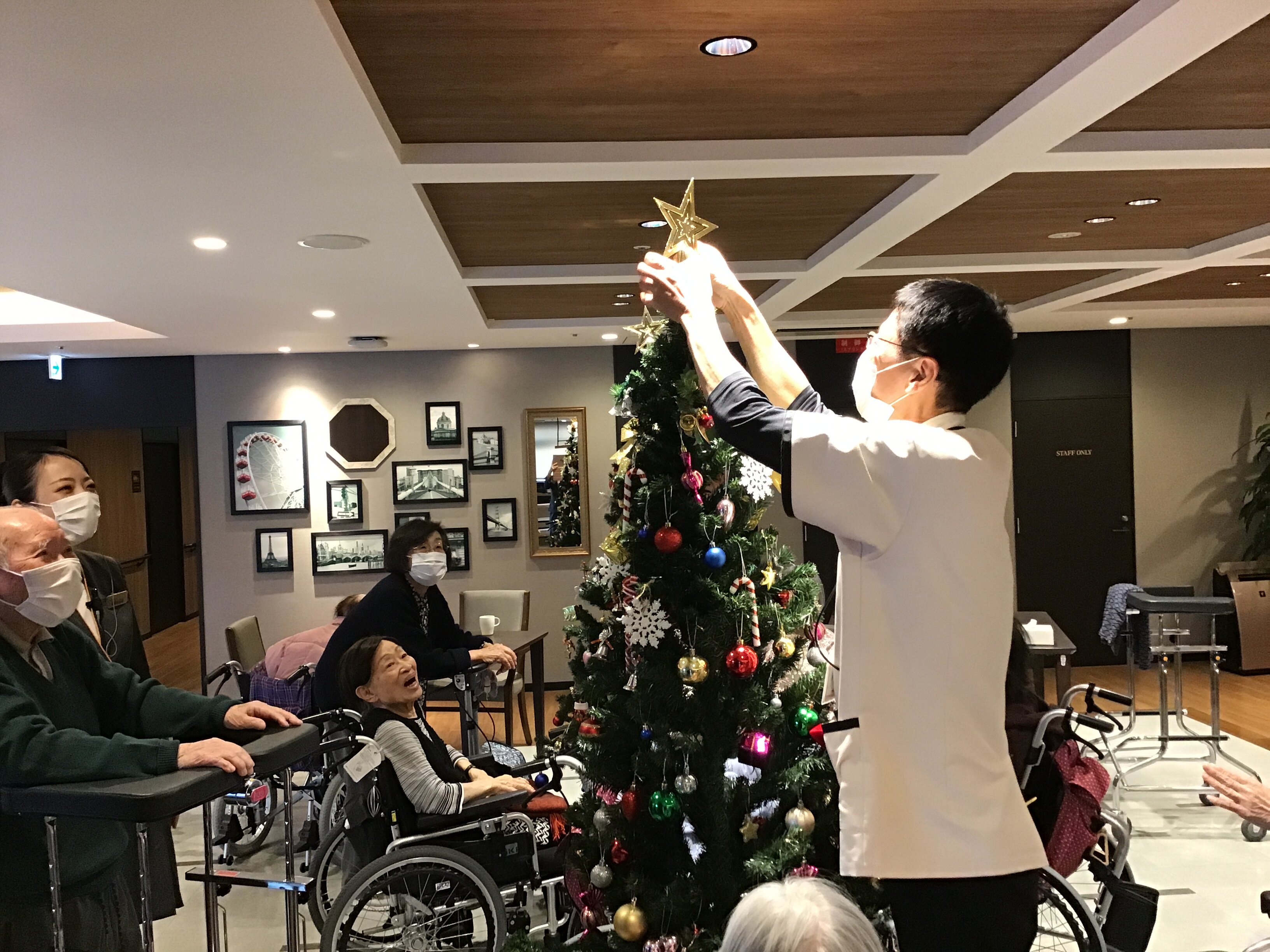 今施設内には壁紙でのツリーを含めて4つありますが、1階レストランと3階談話室のツリー飾り付けの時の様子をご紹介。