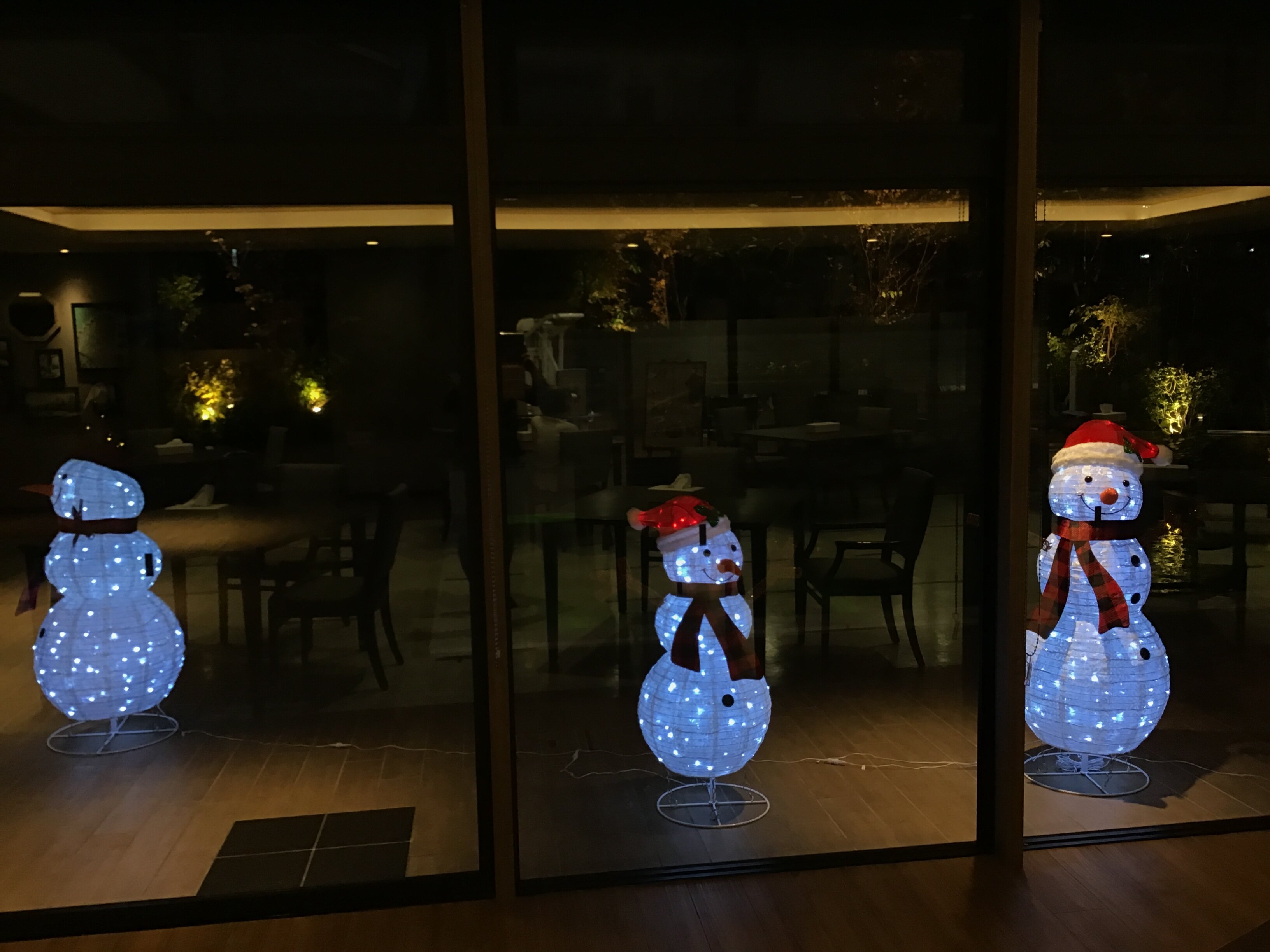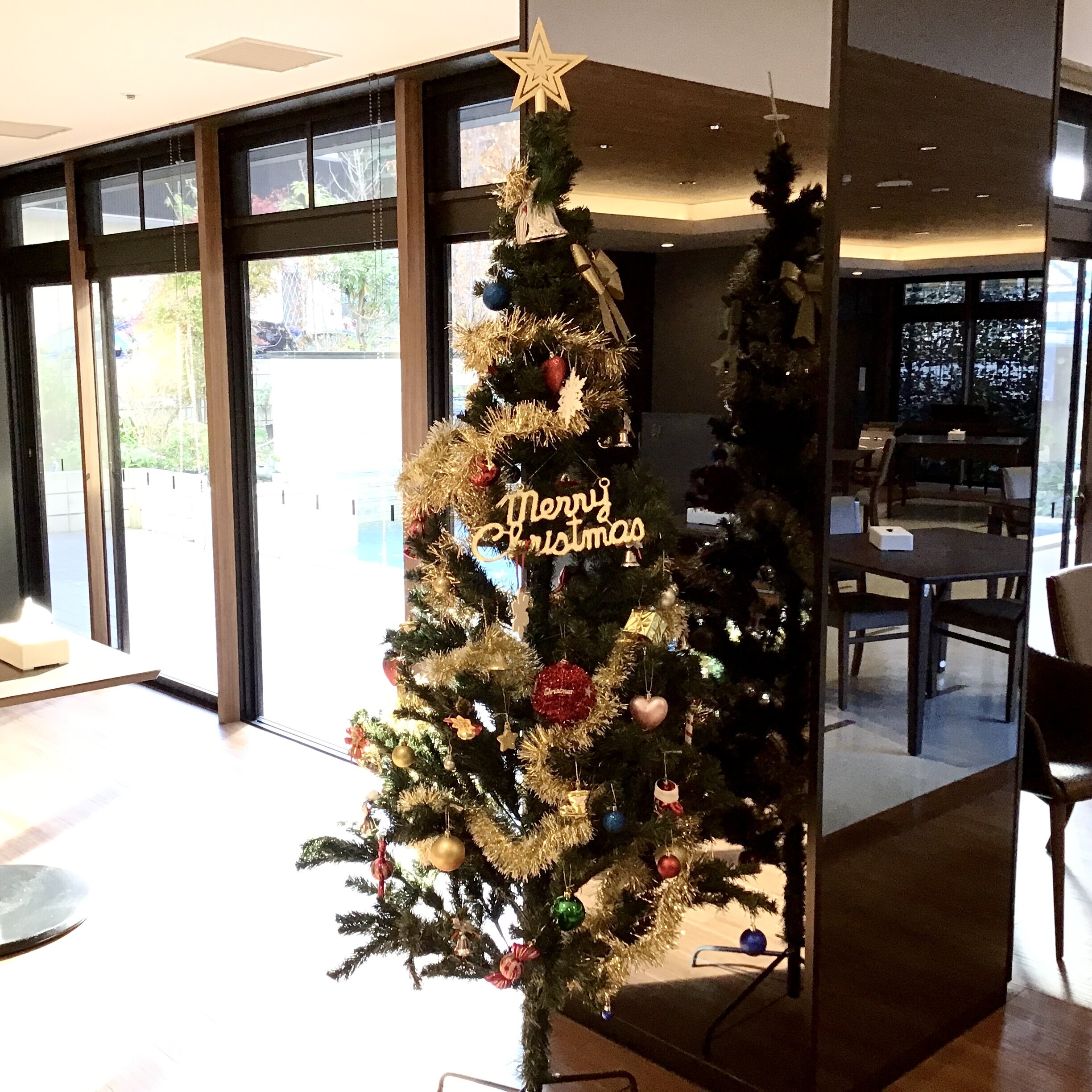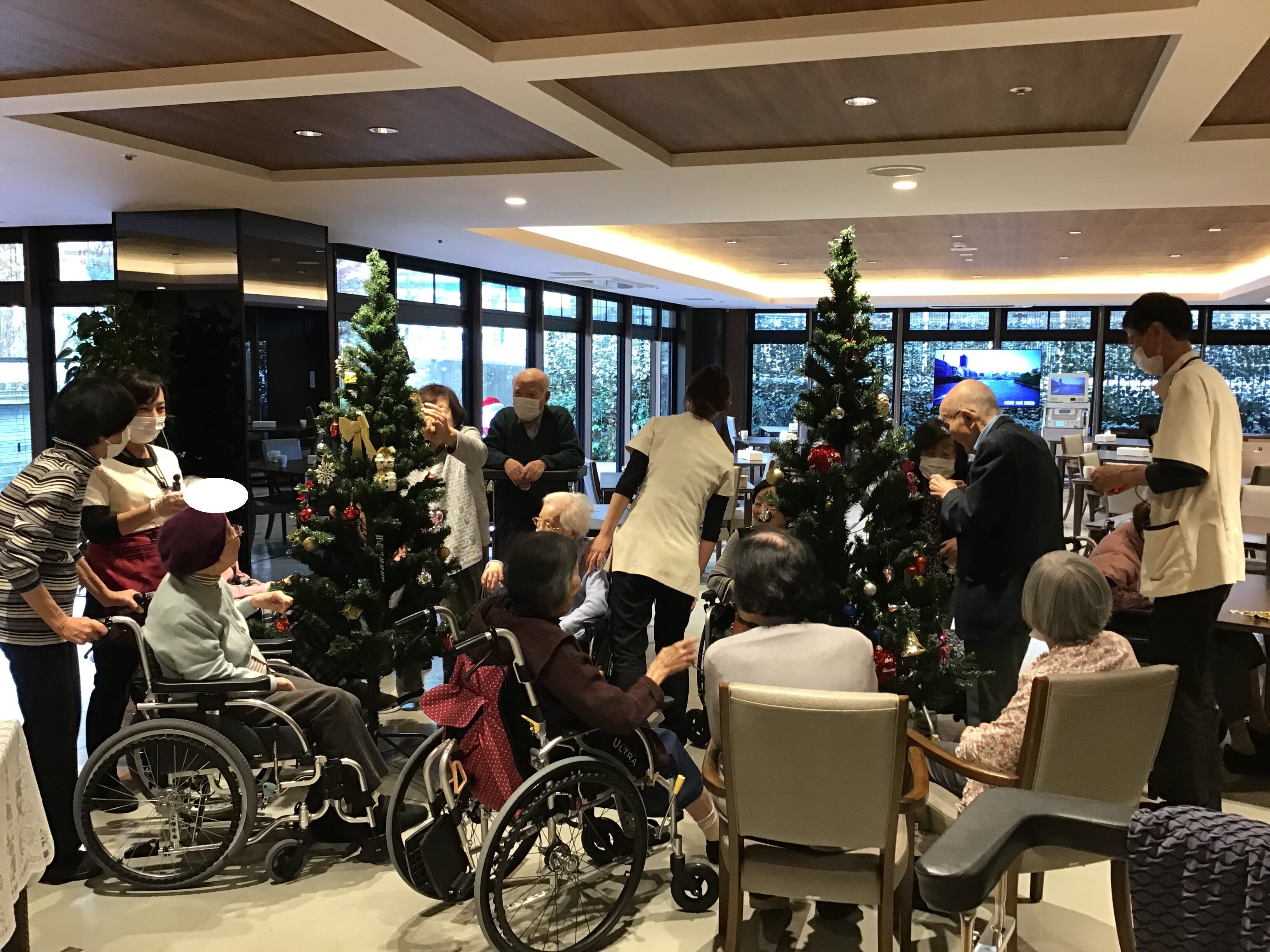 今施設内には壁紙でのツリーを含めて4つありますが、1階レストランと3階談話室のツリー飾り付けの時の様子をご紹介。