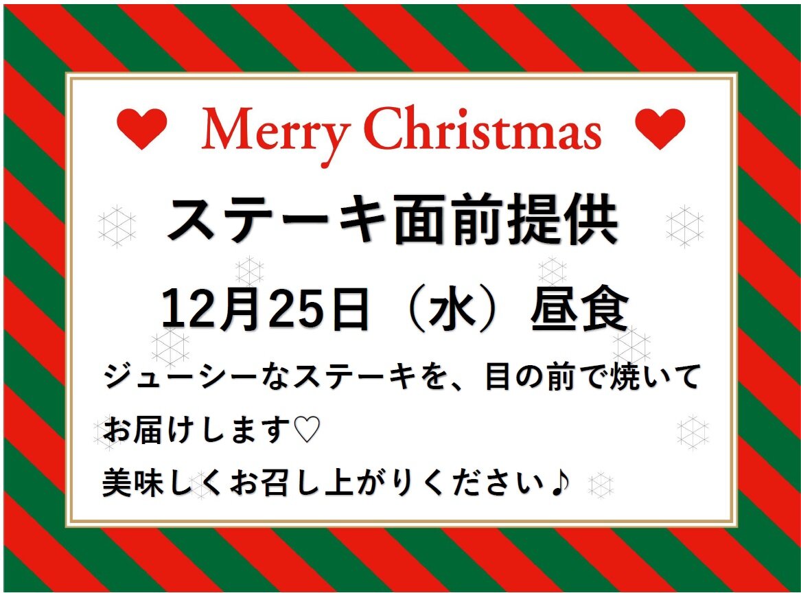 お次は12月25日(水)の昼食にステーキの面前提供を行います!!