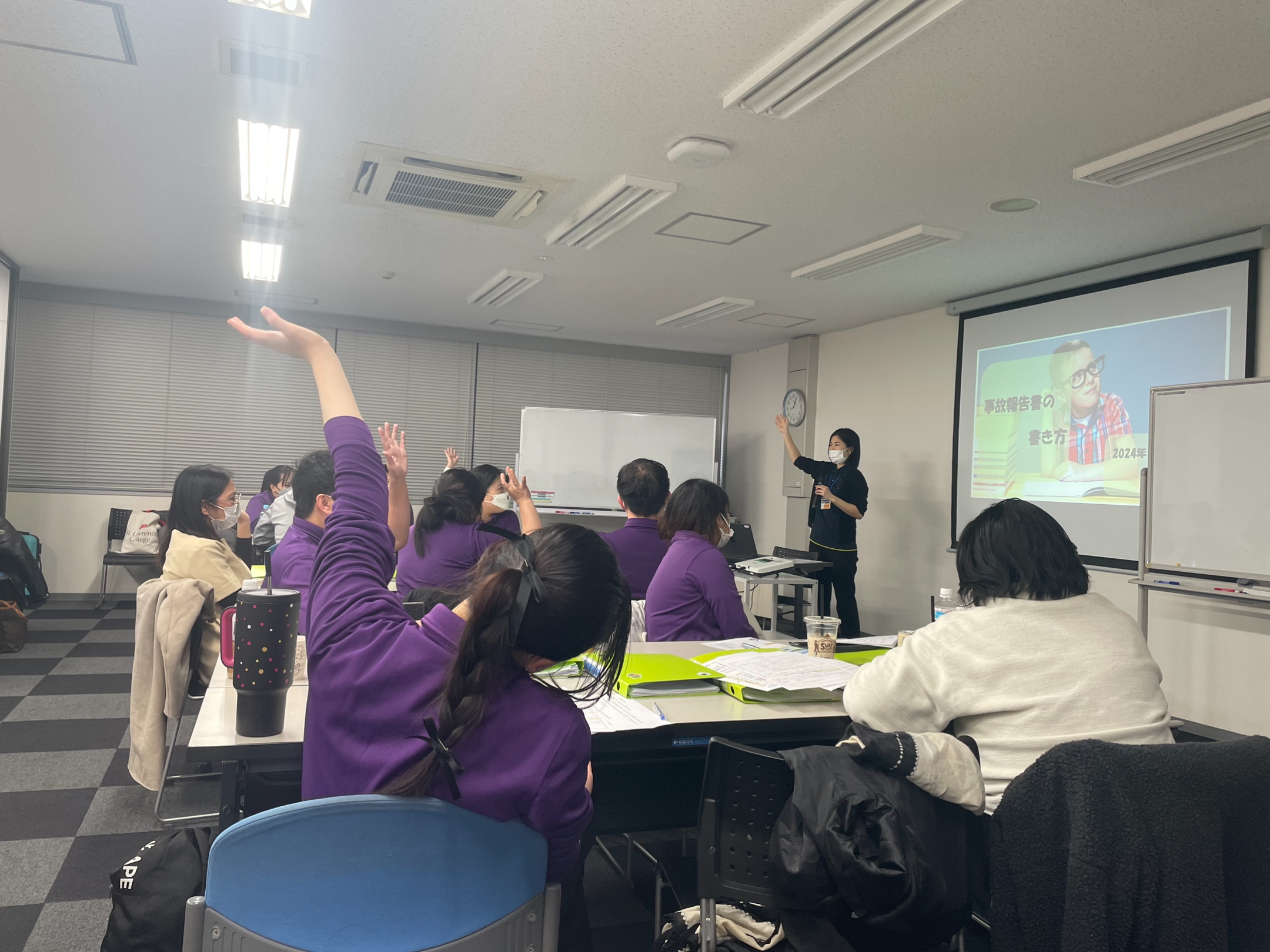 この日の授業はお悩み相談会・事故報告書の書き方・施設でのコミュニケーションの3講義で、各施設のあるある話でとても盛り上がっていました(*^^*)