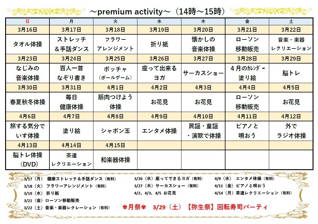 本日は3/16~4/15までのアクティビティカレンダーを