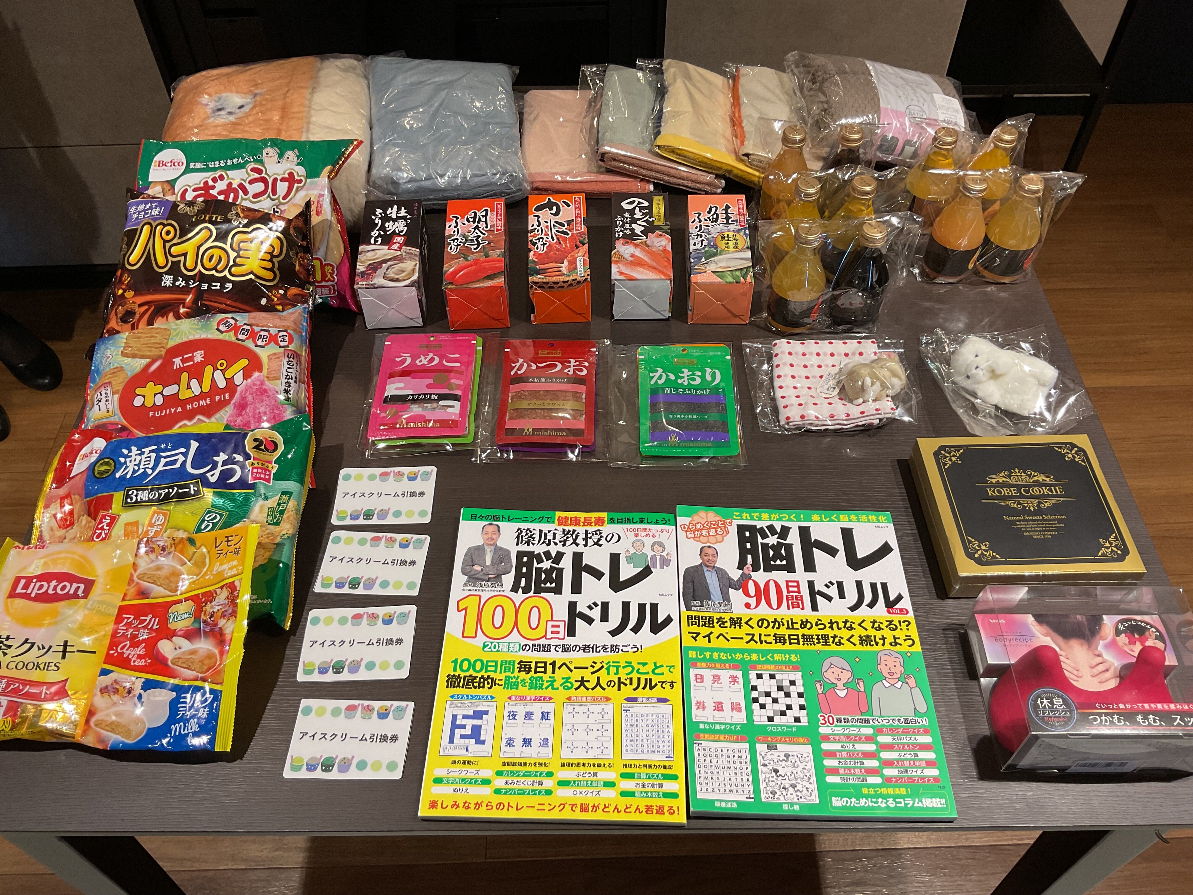 脳トレやタオル、マッサージグッズやジュースもあります♡