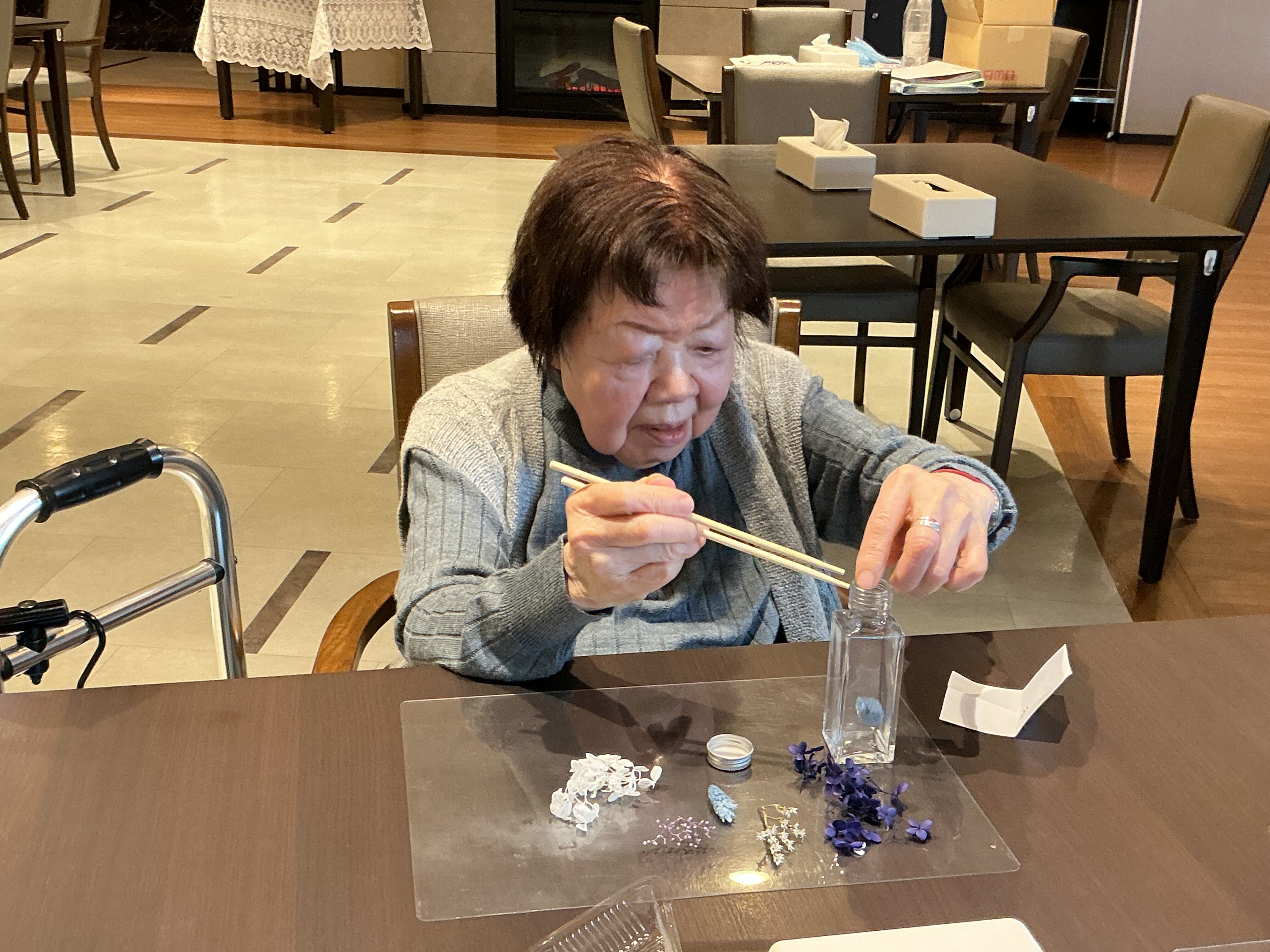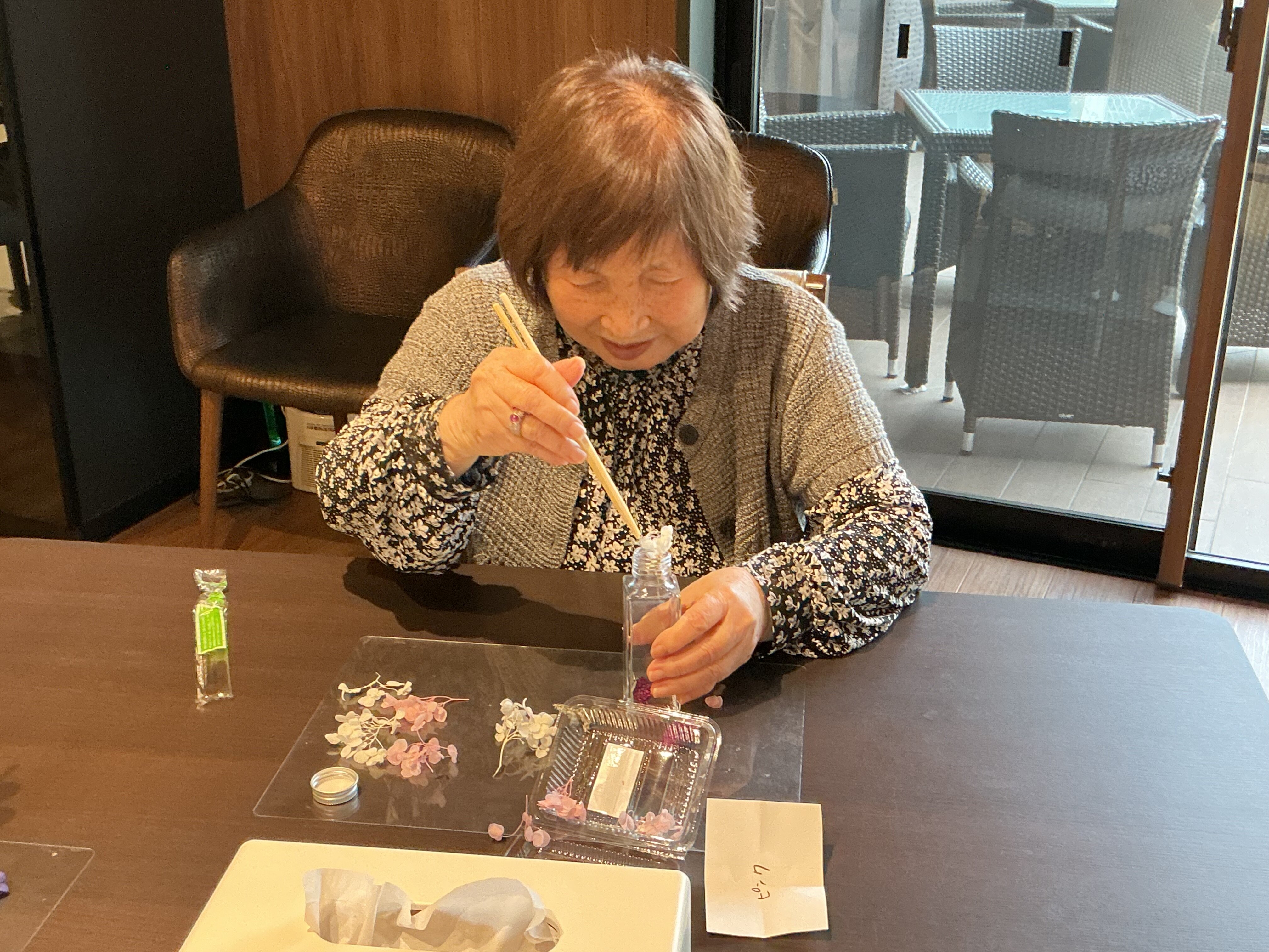 お箸を使って真剣な眼差しでお花を詰めてますね。