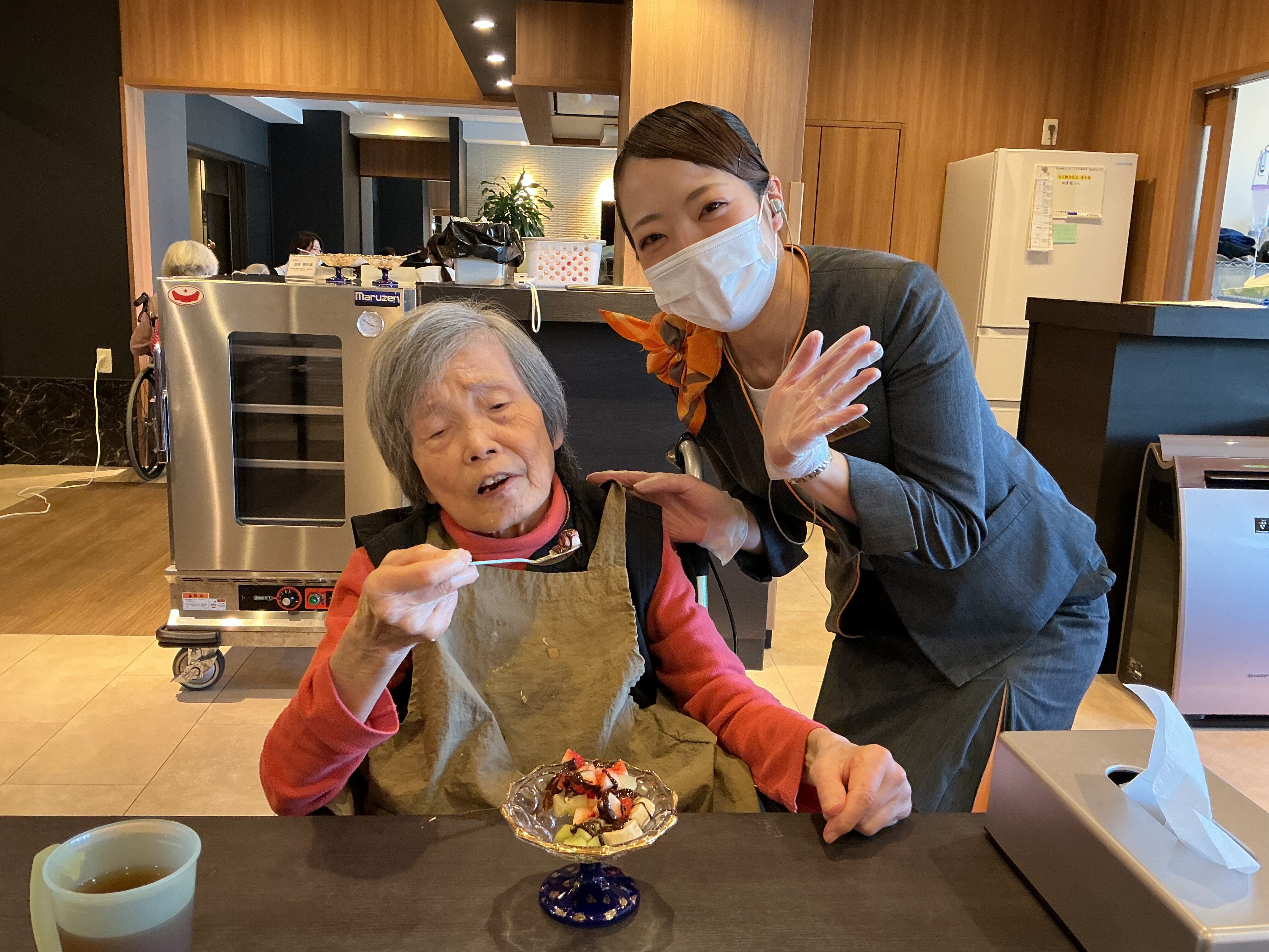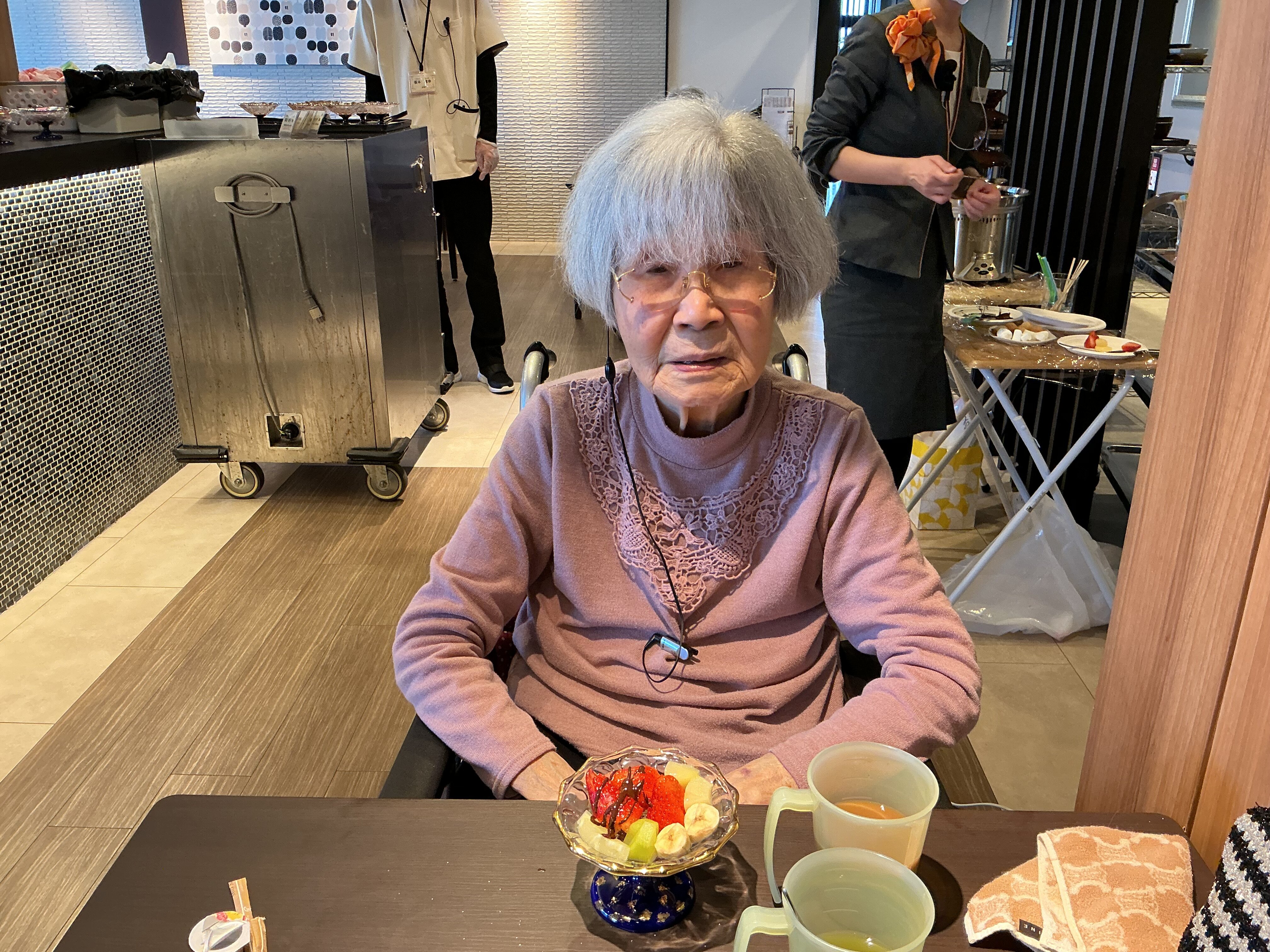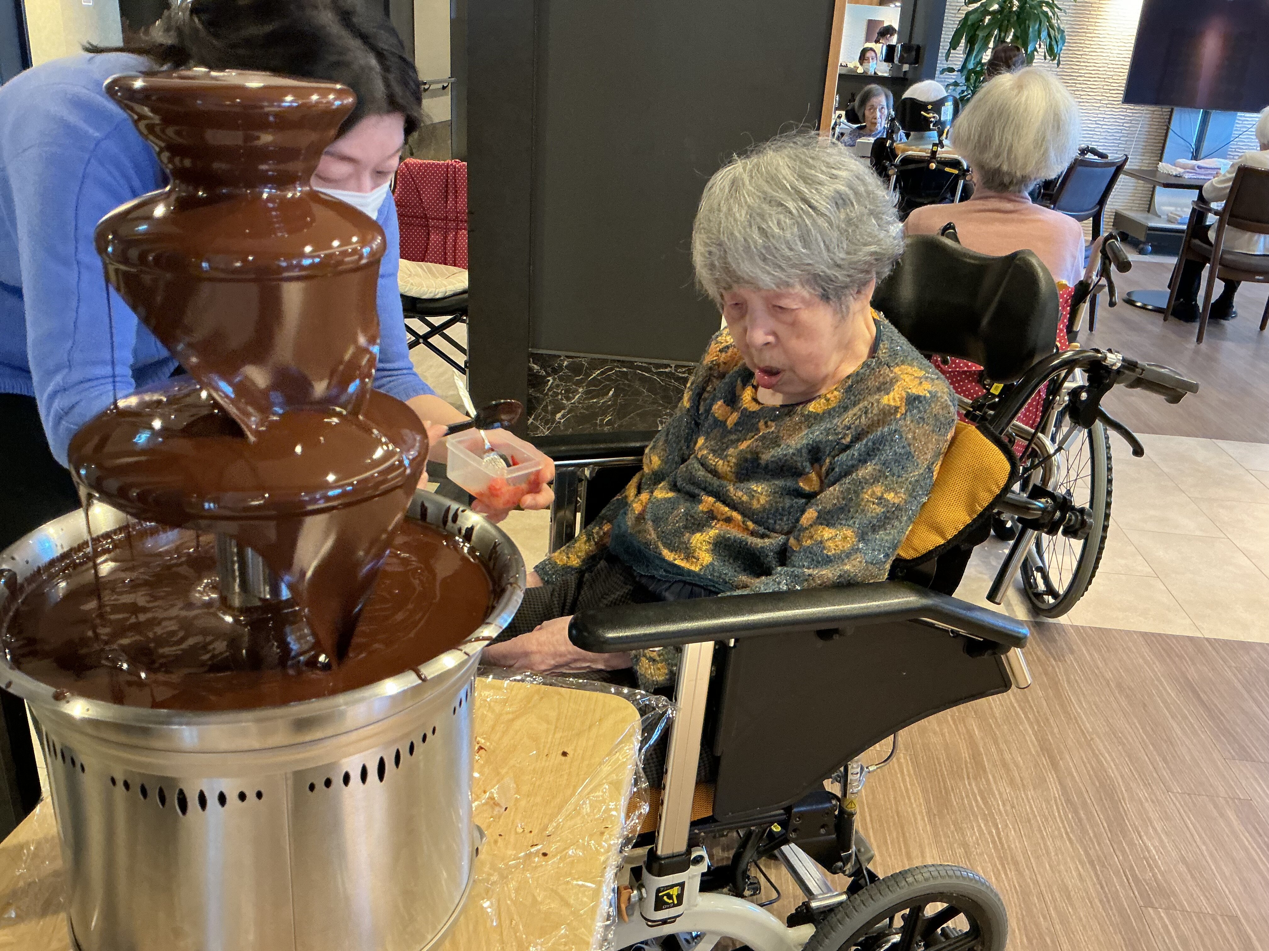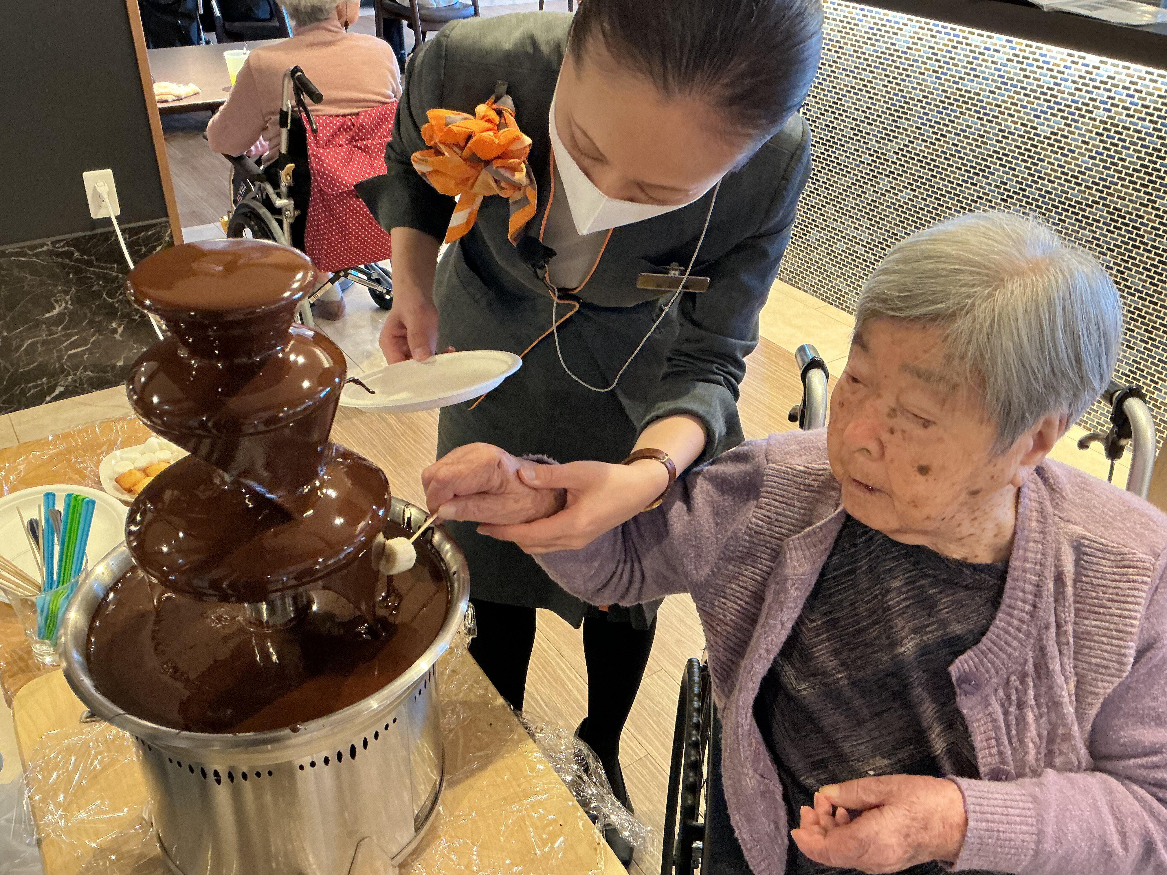 フルーツ盛りにチョコレートをかけて召し上がっていただきました(*´ω`*)![]()