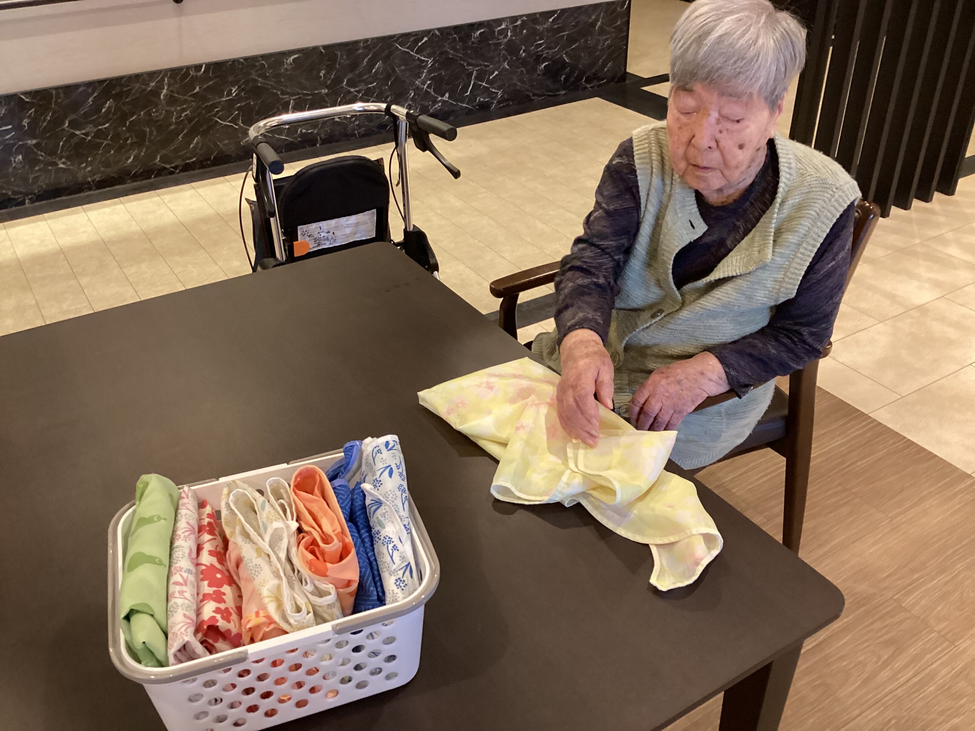 そんな待ち時間の間には、職員と一緒にエプロンを畳んでくださる方もいらっしゃいます!