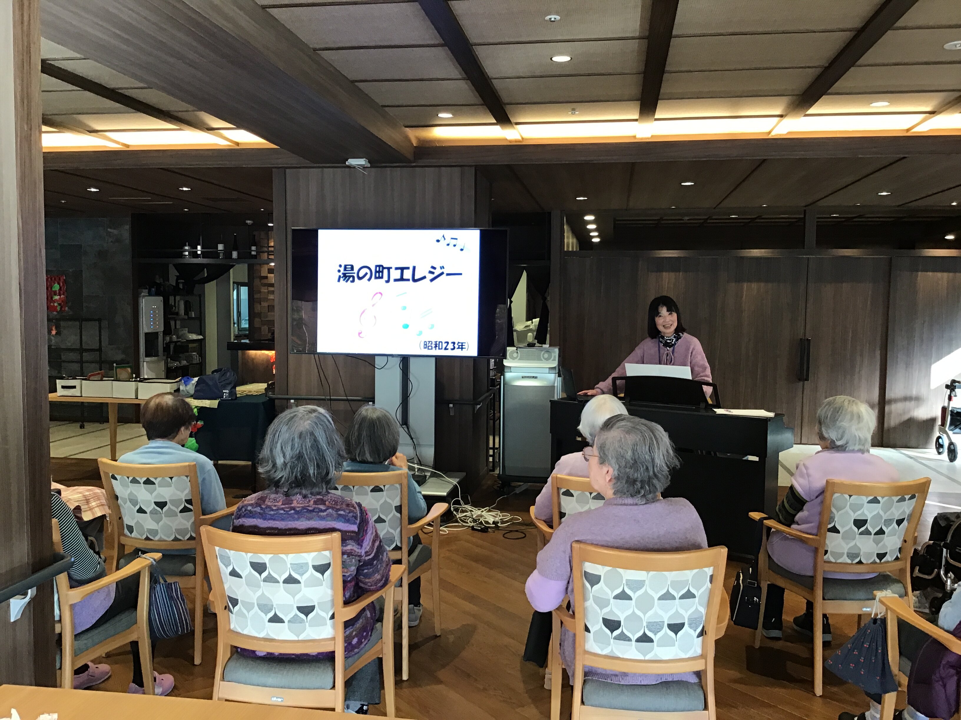 動画では、着物姿の先生による素敵なピアノ演奏に合わせて、ご入居者の皆様が歌詞カードを見ながら歌を口ずさまれたり、リズムにのったりと、音楽を楽しまれているご様子がご覧いただけます。