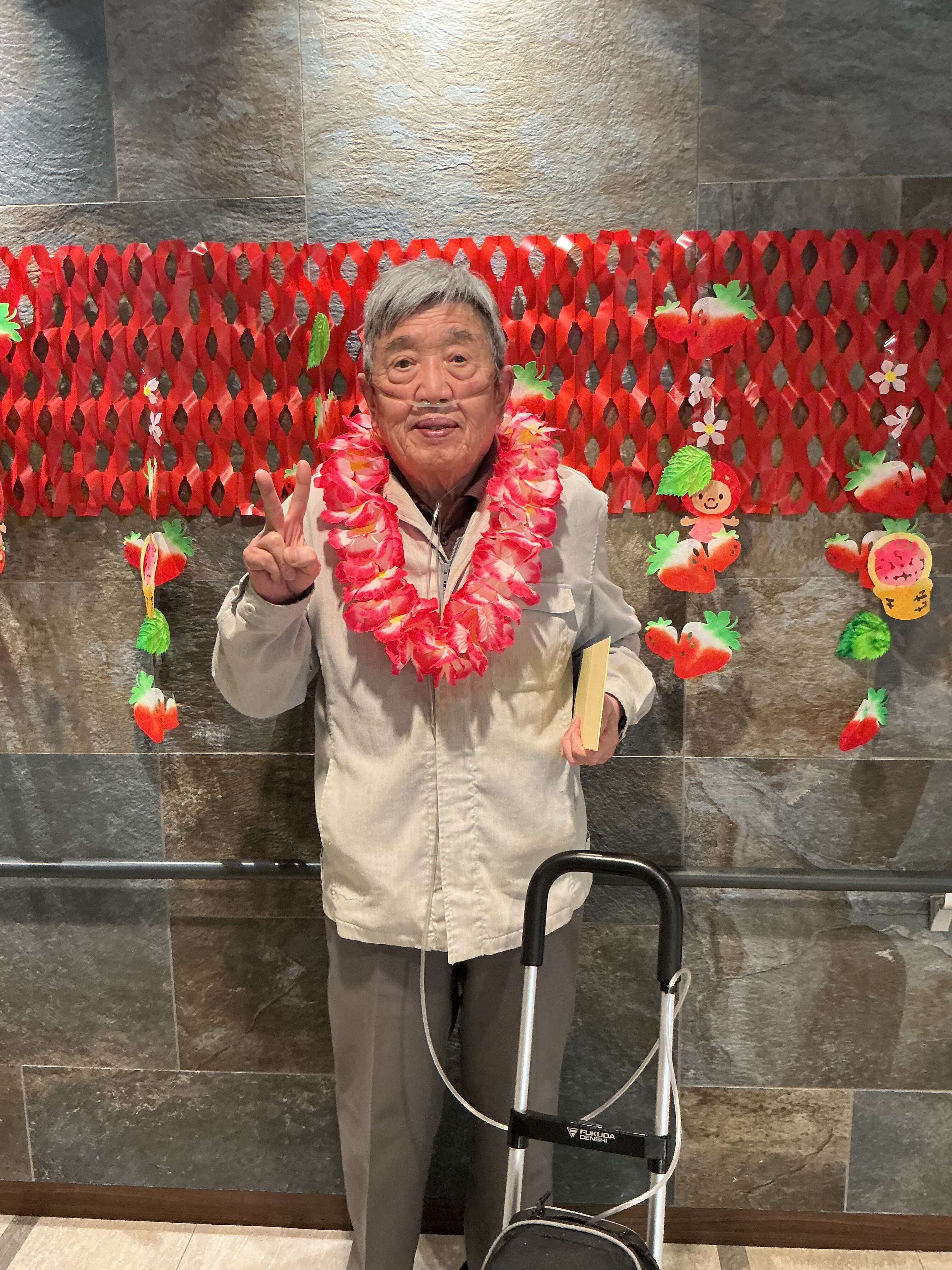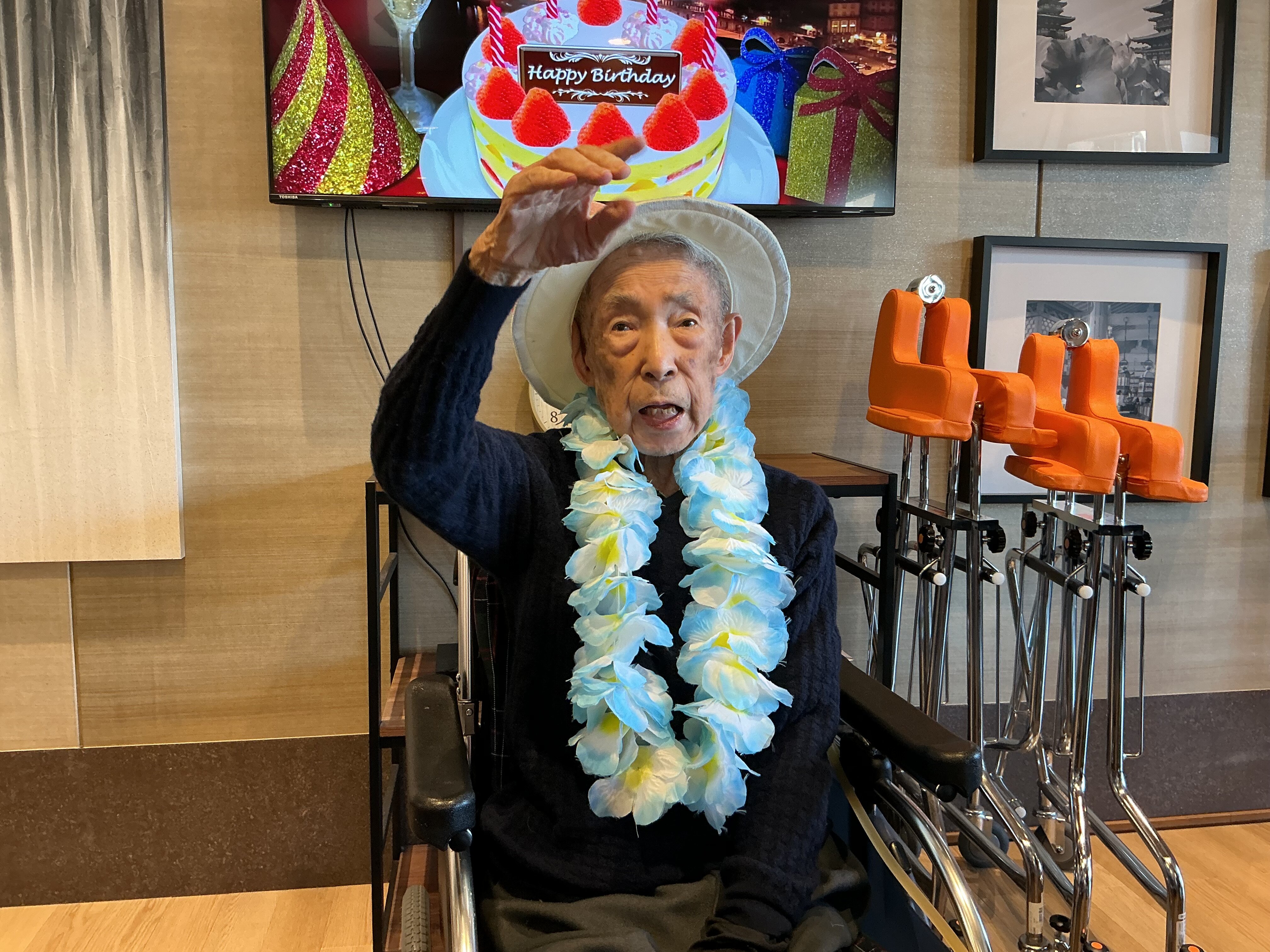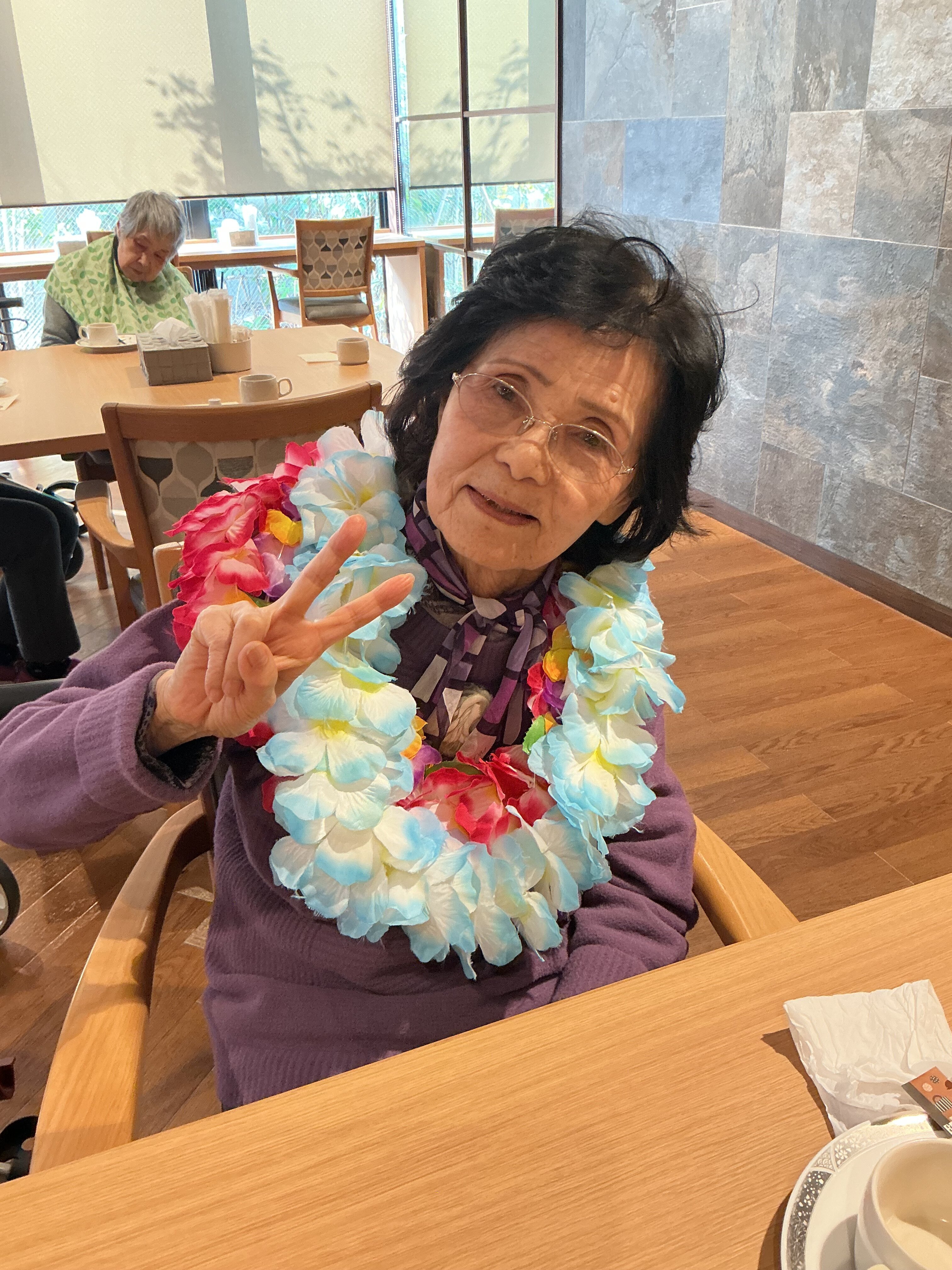 今回最高齢の94歳を迎えられたご入居者様です。 ハワイアンなレイを身にまとい、力強く手を挙げてくださるお姿からは、こちらまで元気をいただけるようなパワーを感じますね。