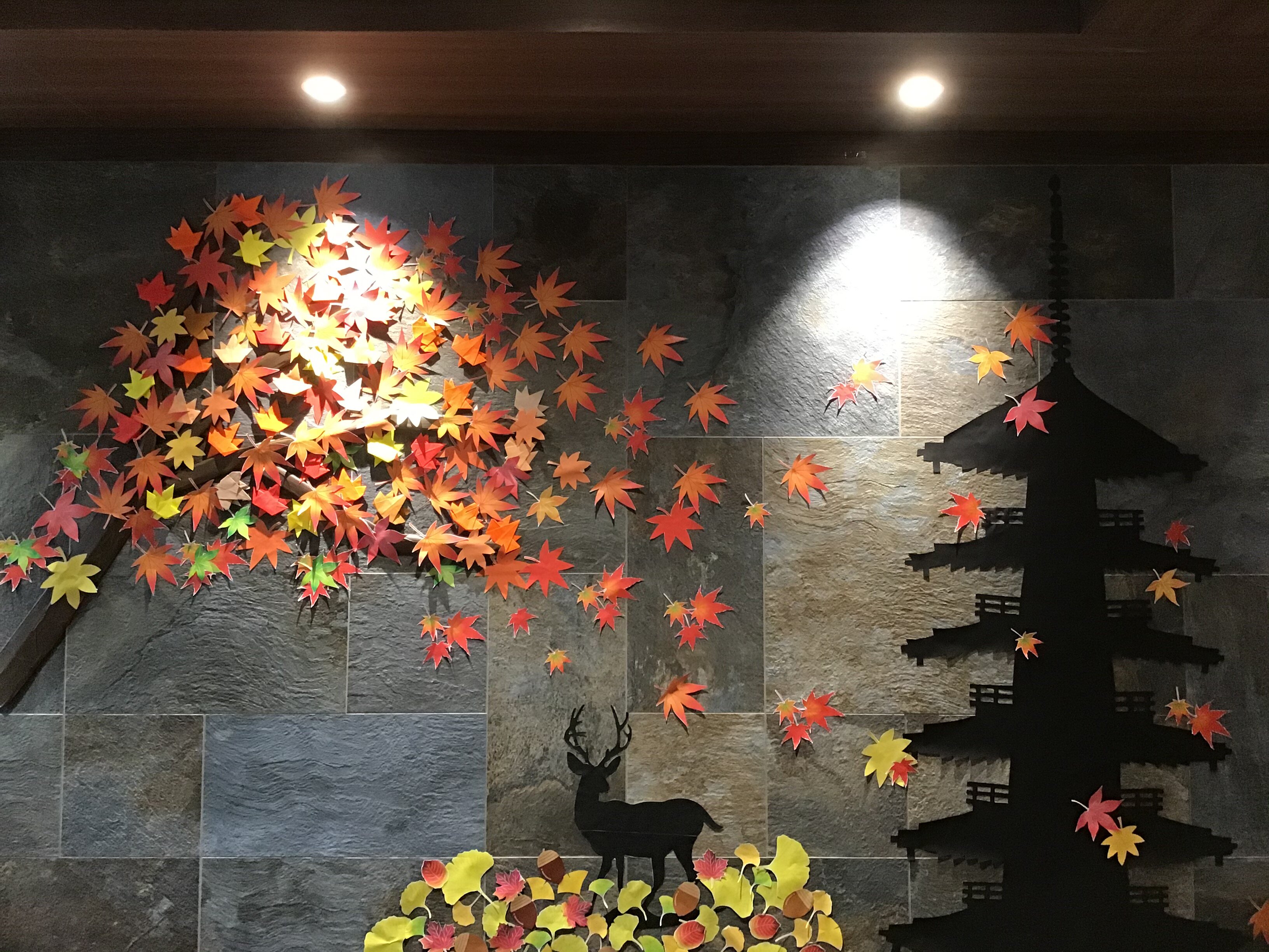 薬師寺東塔をイメージした塔、鹿、もみじを壁一面に・・・