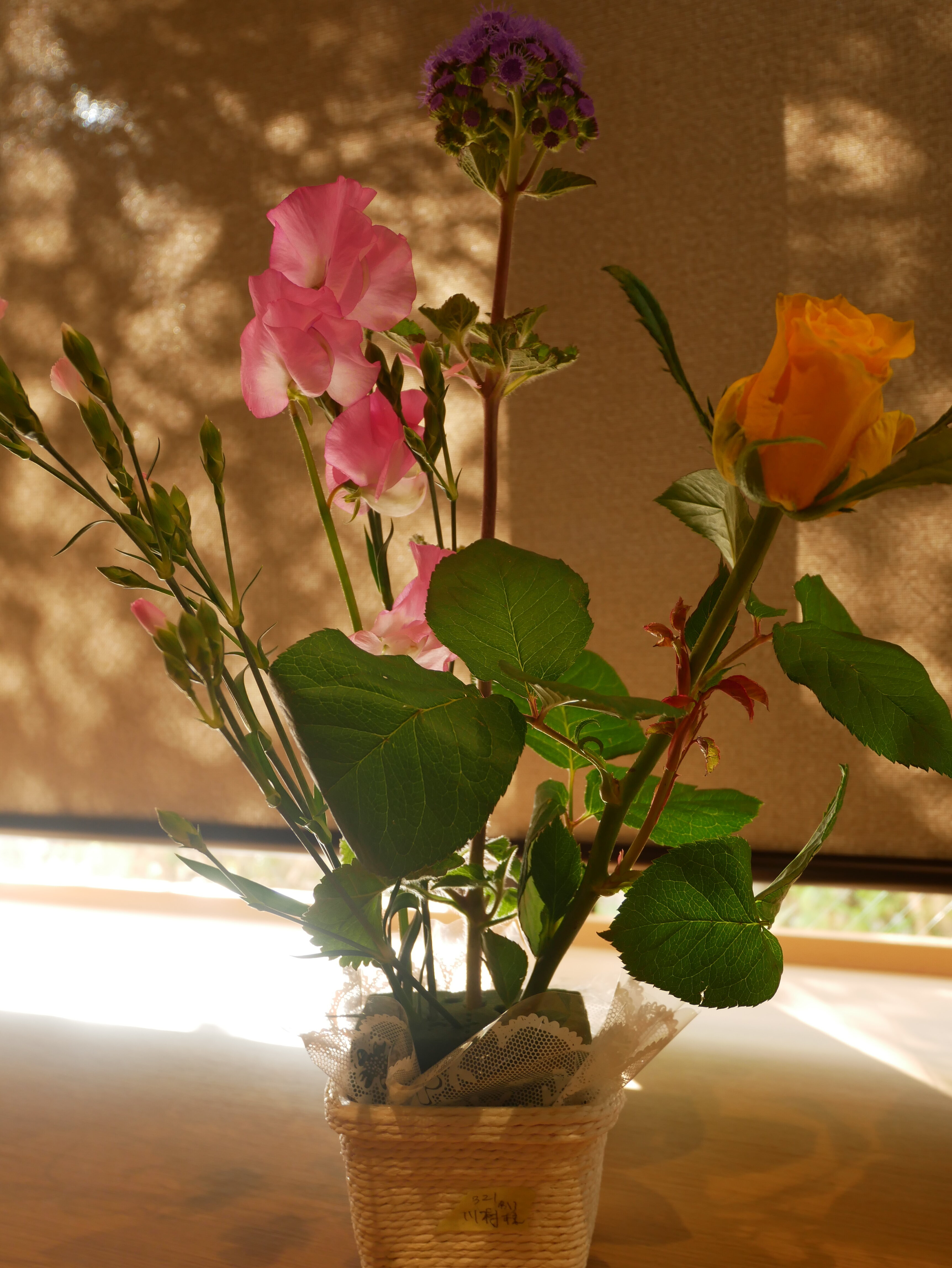 今月のお花は、バラ、アゲラタム、スイートピー、ソネットカーネーション。