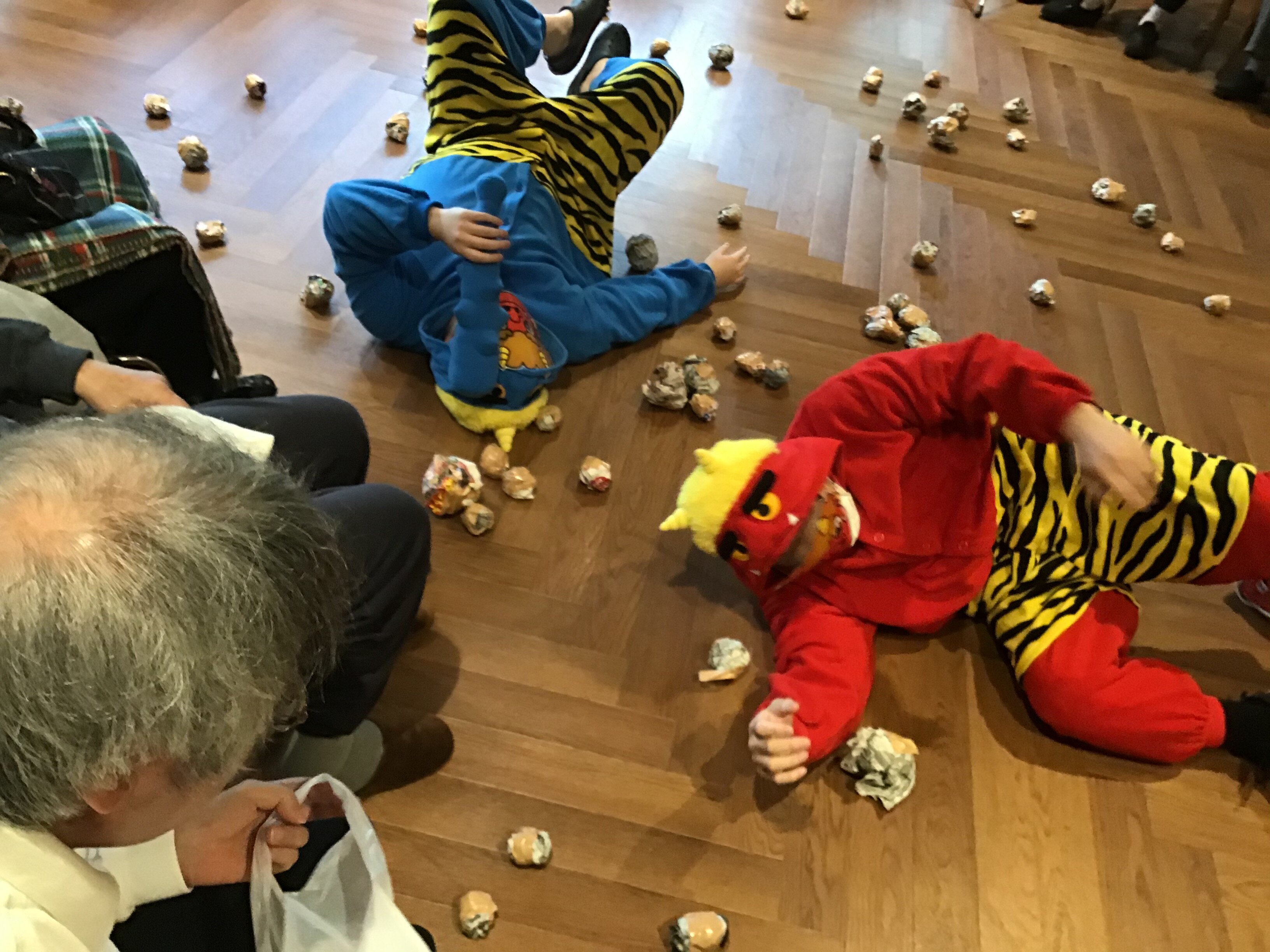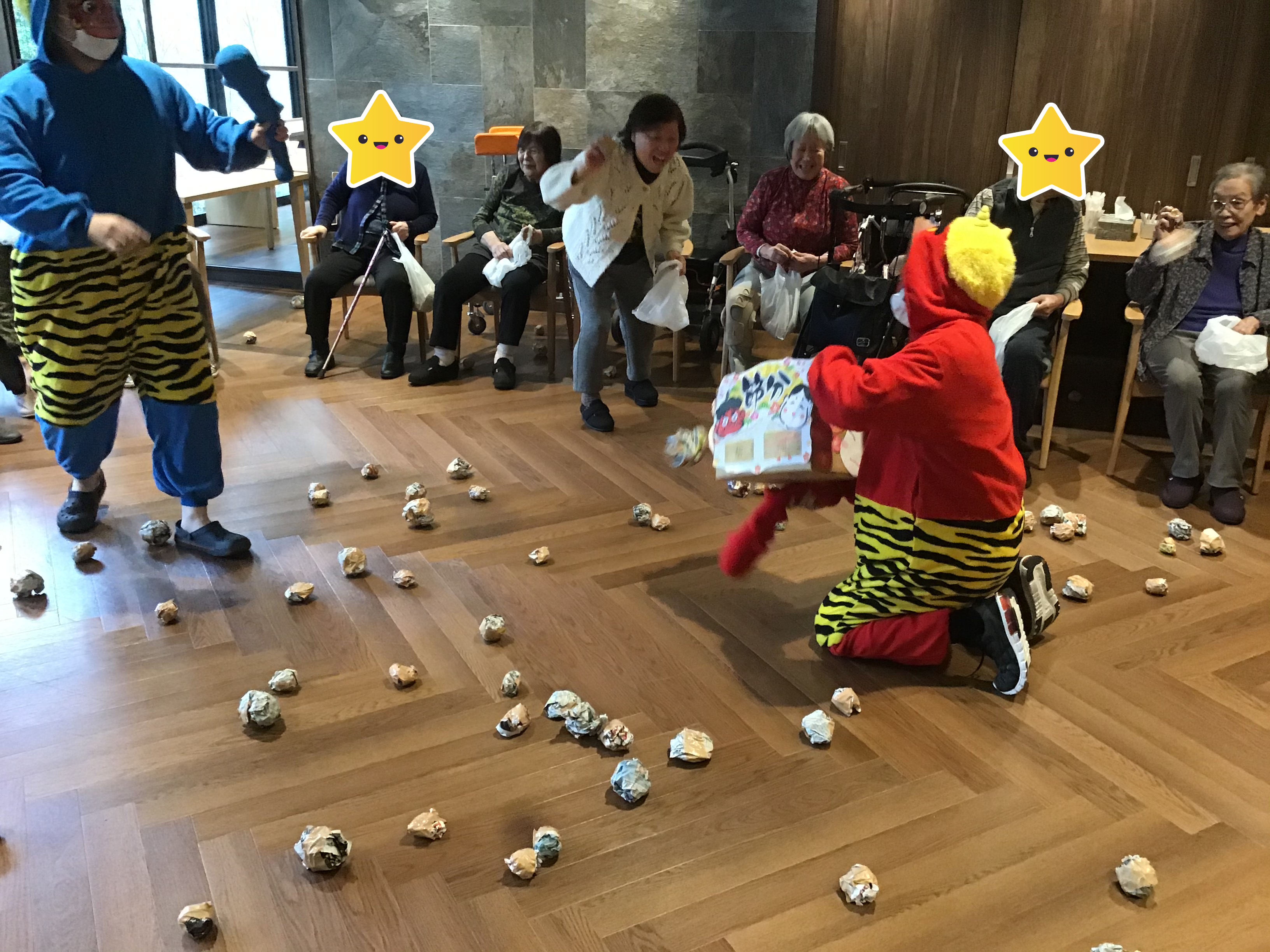 退治の為に豆に見立てた新聞紙ボールを鬼にめがけて投げて頂きました☆彡