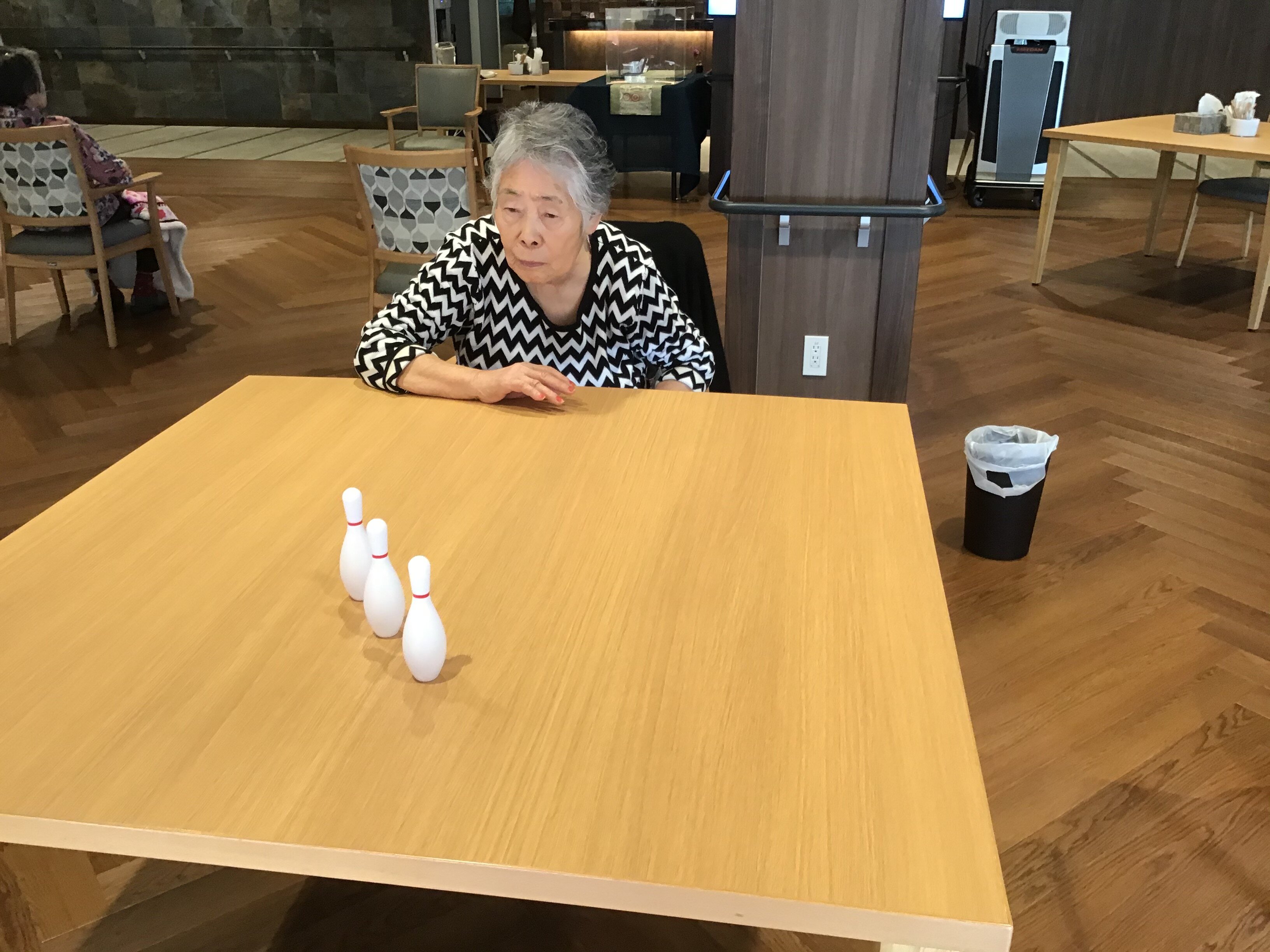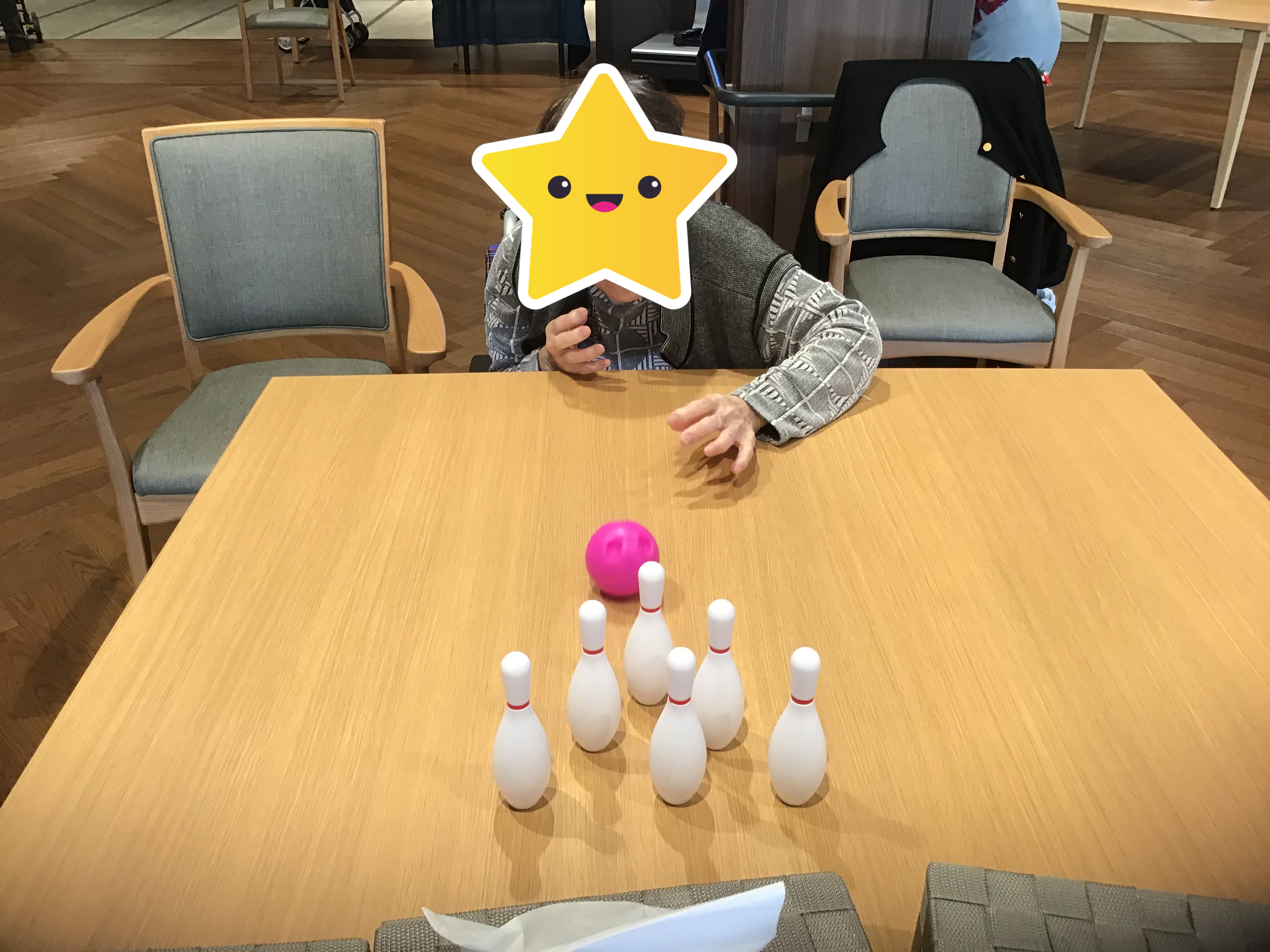 真剣にボーリングのピンをめがけて、ボールを投げます。