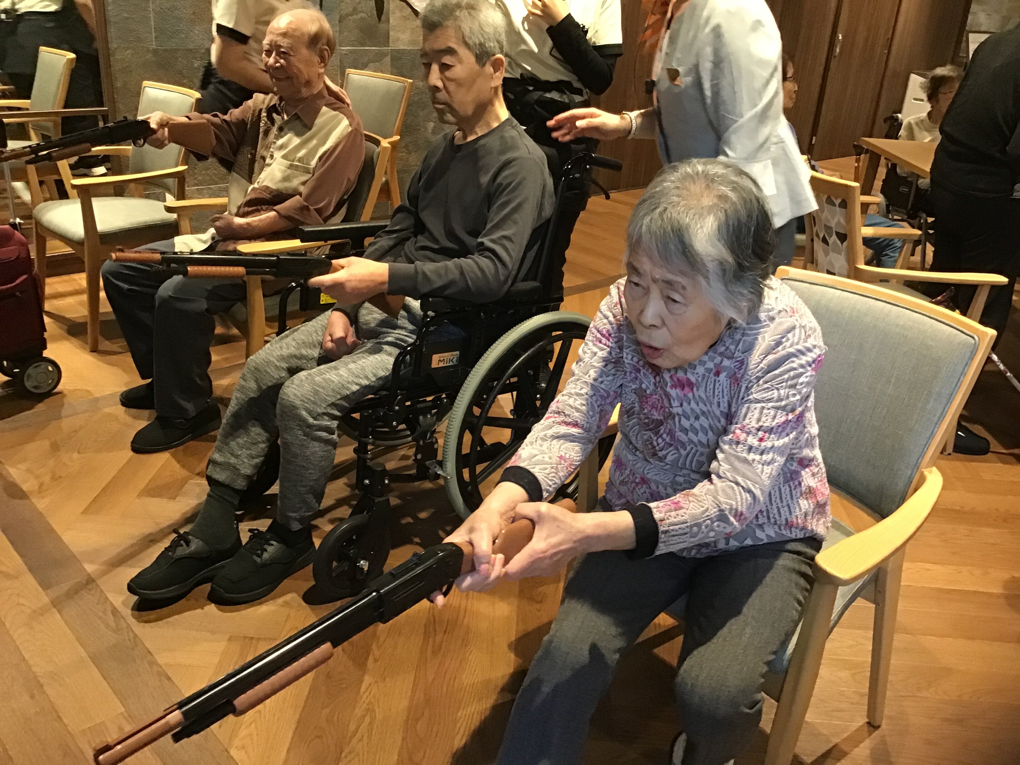 射的の銃を渡され、的に向かって狙いを定めていきます。
