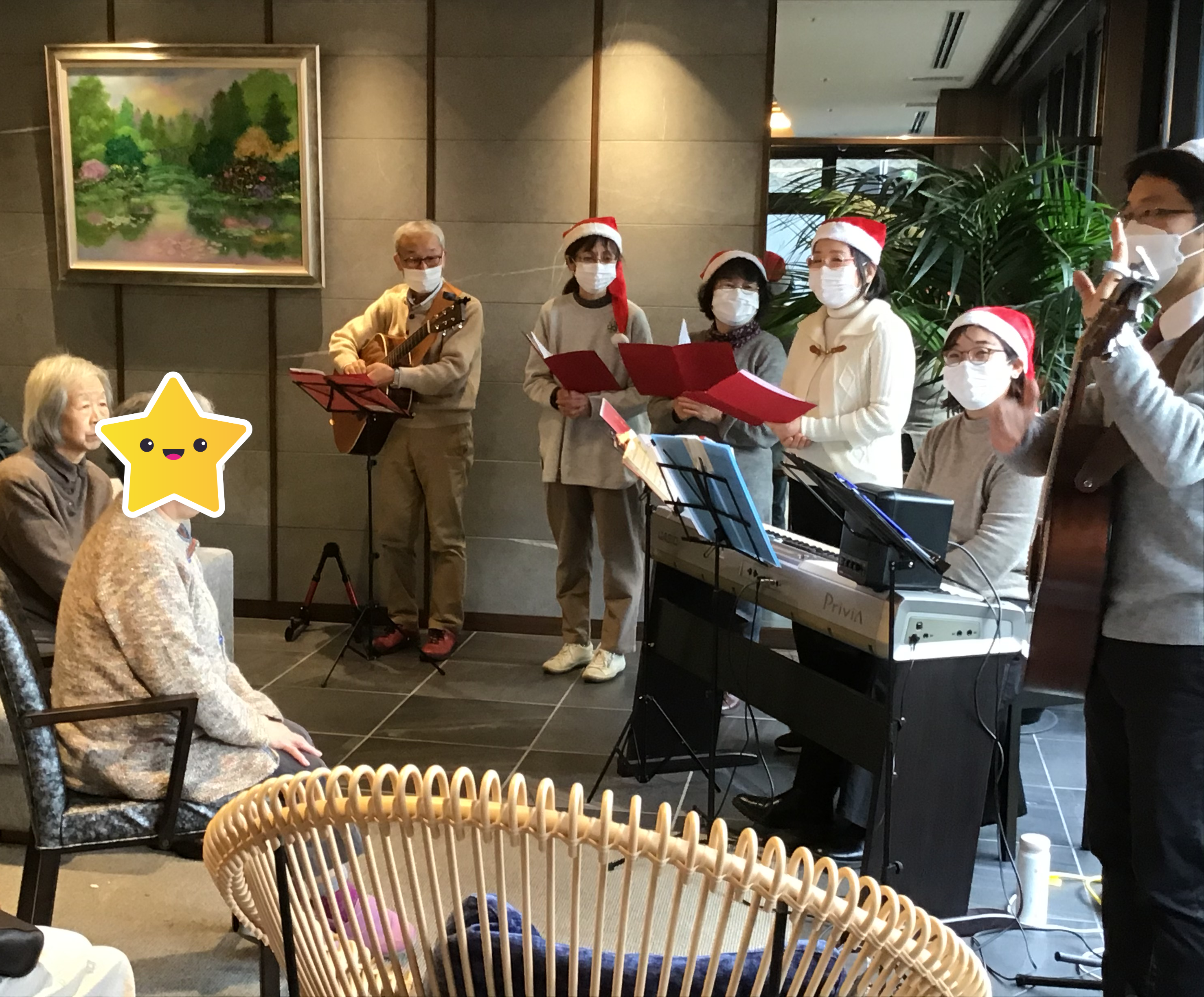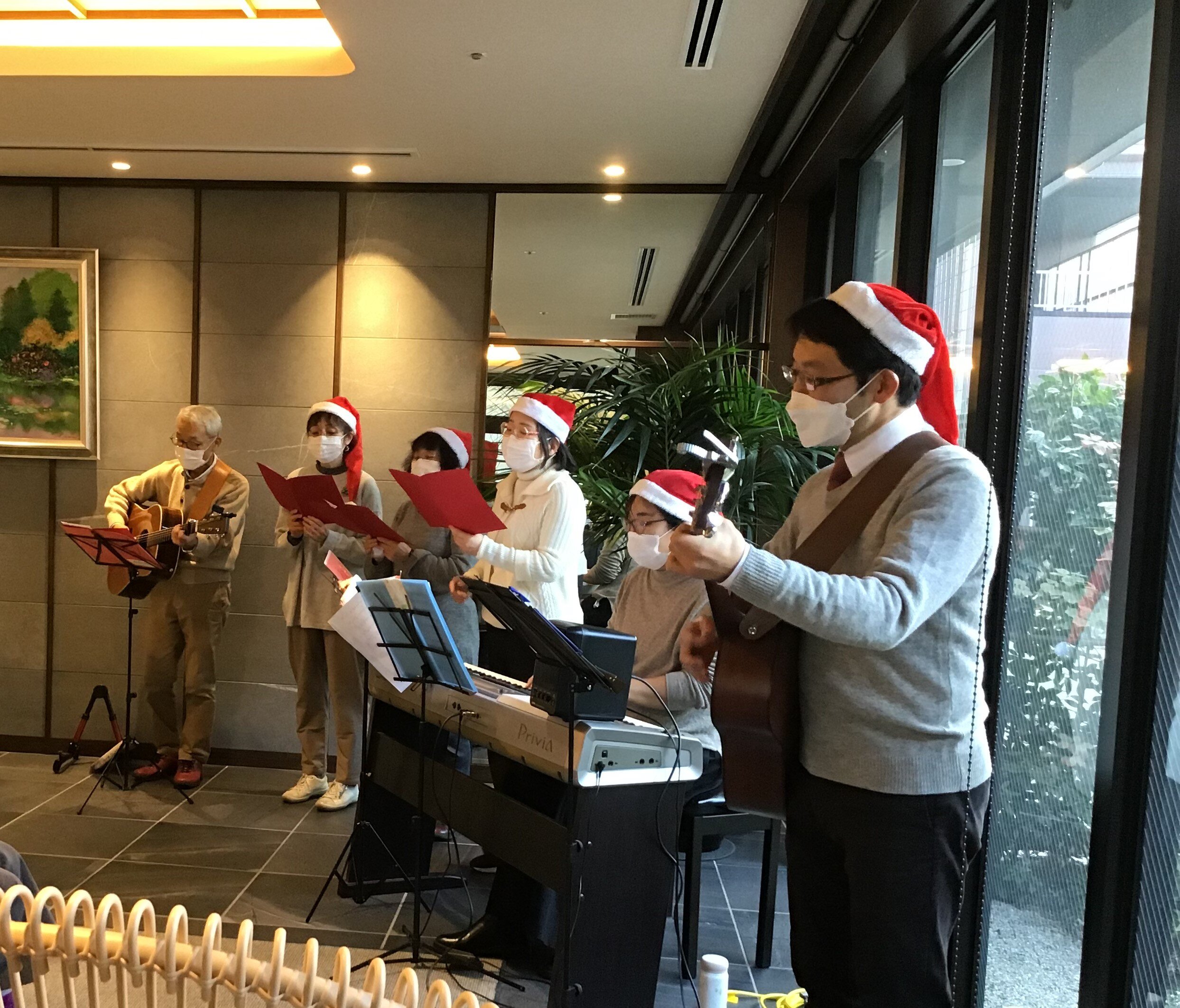 「もろびとこぞりて」「きよしこの夜」「もみの木」などクリスマスソングをギターやエレクトーンの演奏と共に披露してくださいました。