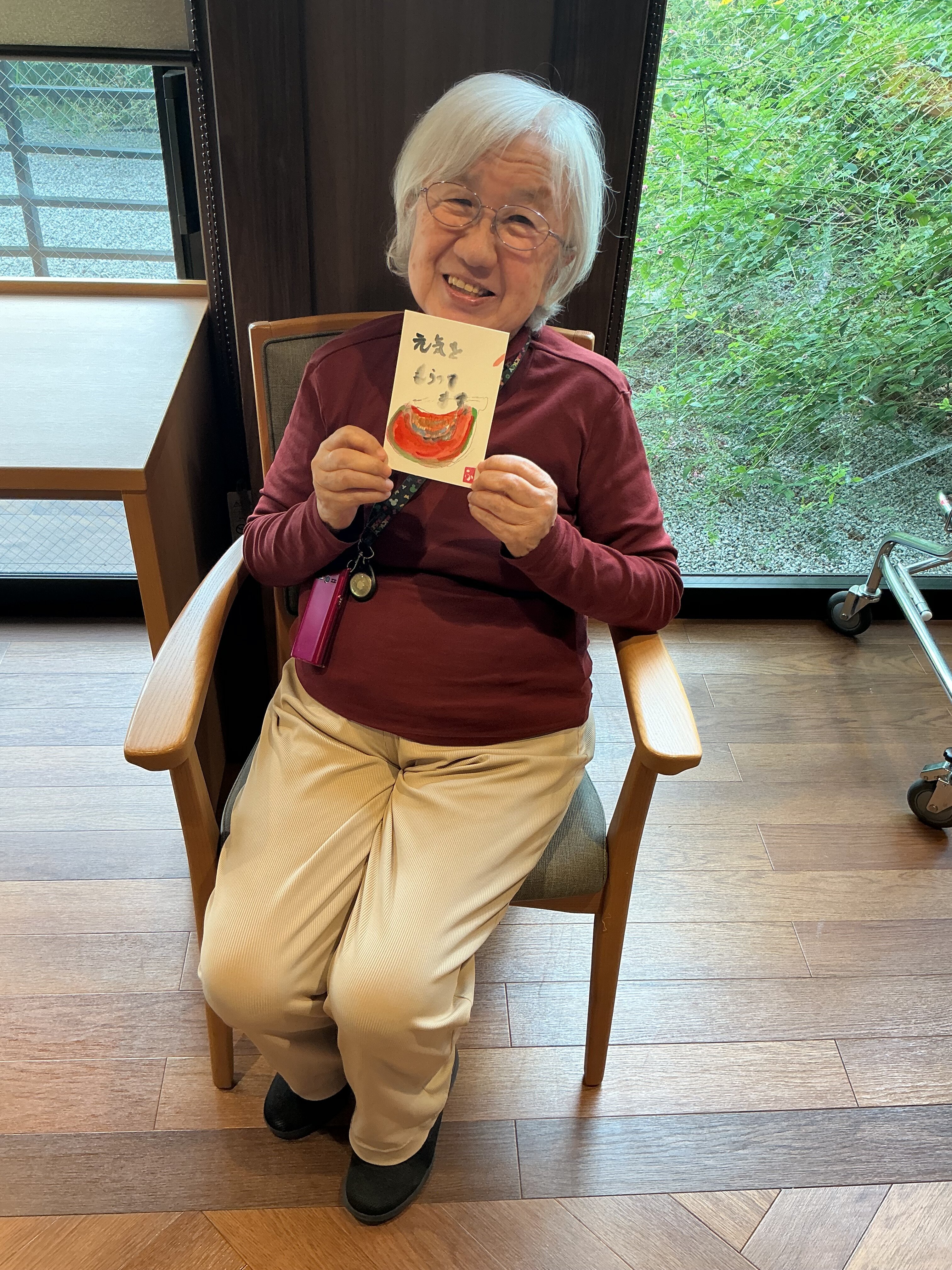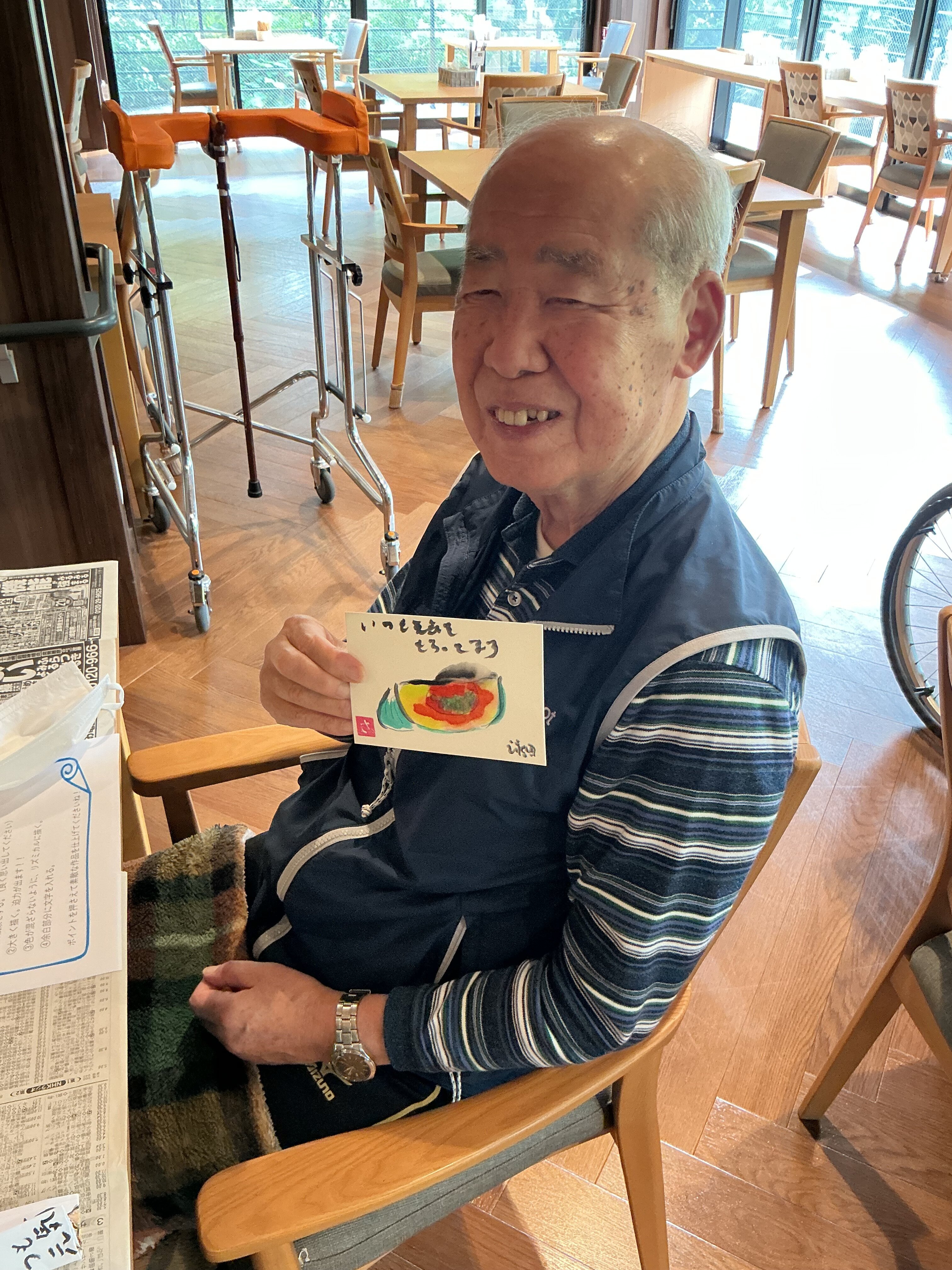 小さな手から渡される心のこもった贈り物に、ご入居者の皆様は「ありがとうね。大切に使うよ。」と受け取っていらっしゃいました。