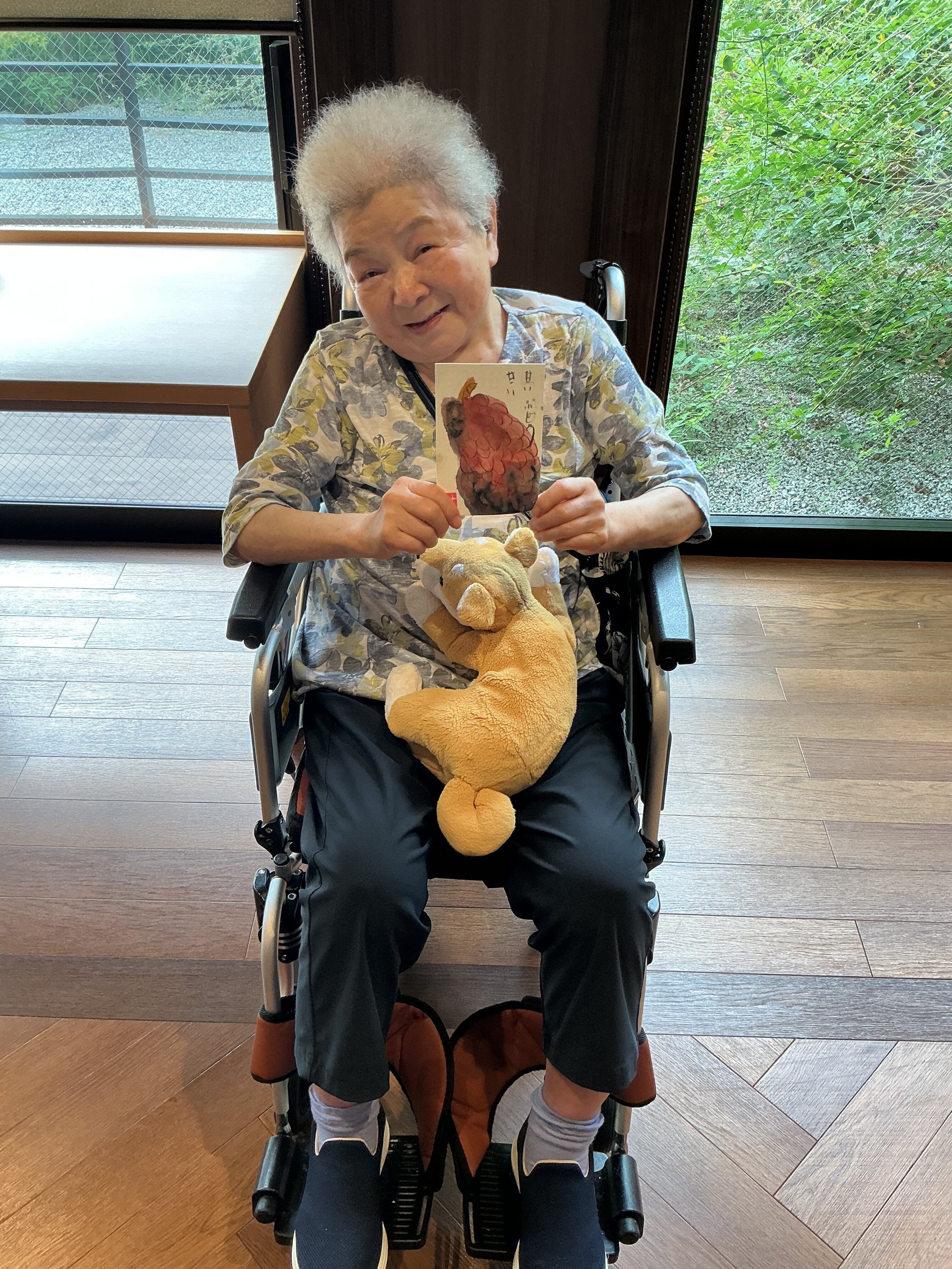 そして、ご入居者の皆様と一緒に、「げんこつやまのたぬきさん」や「幸せなら手をたたこう」で遊び、温かい拍手と笑顔で満たされました。