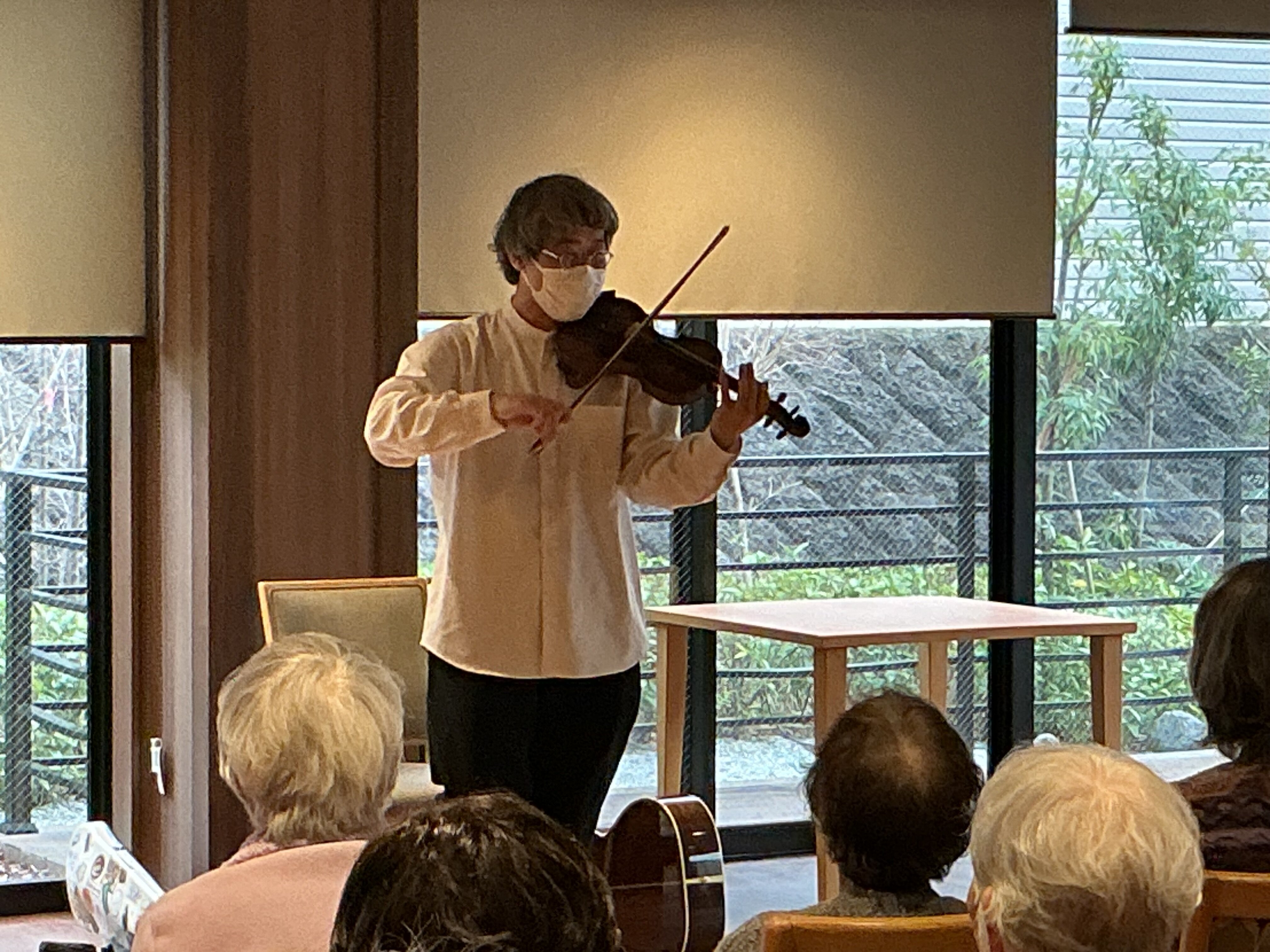 会場となったレストランには、多くのご入居者様がお集まりくださいました。 島袋さんの奏でるフィドルの軽快で、どこか懐かしい音色が響き渡ると、皆様じっと耳を傾け、その世界観に引き込まれていらっしゃいました。