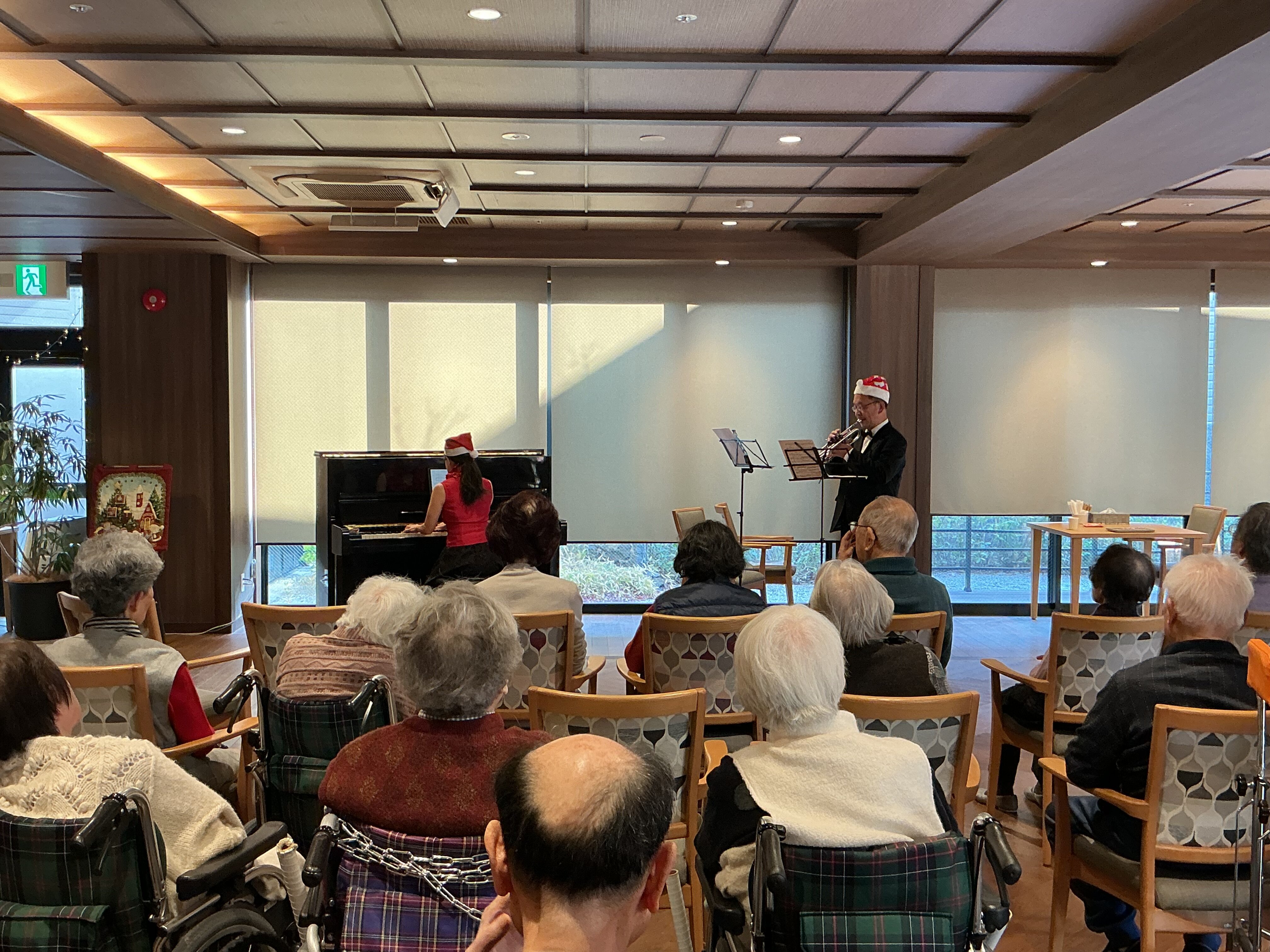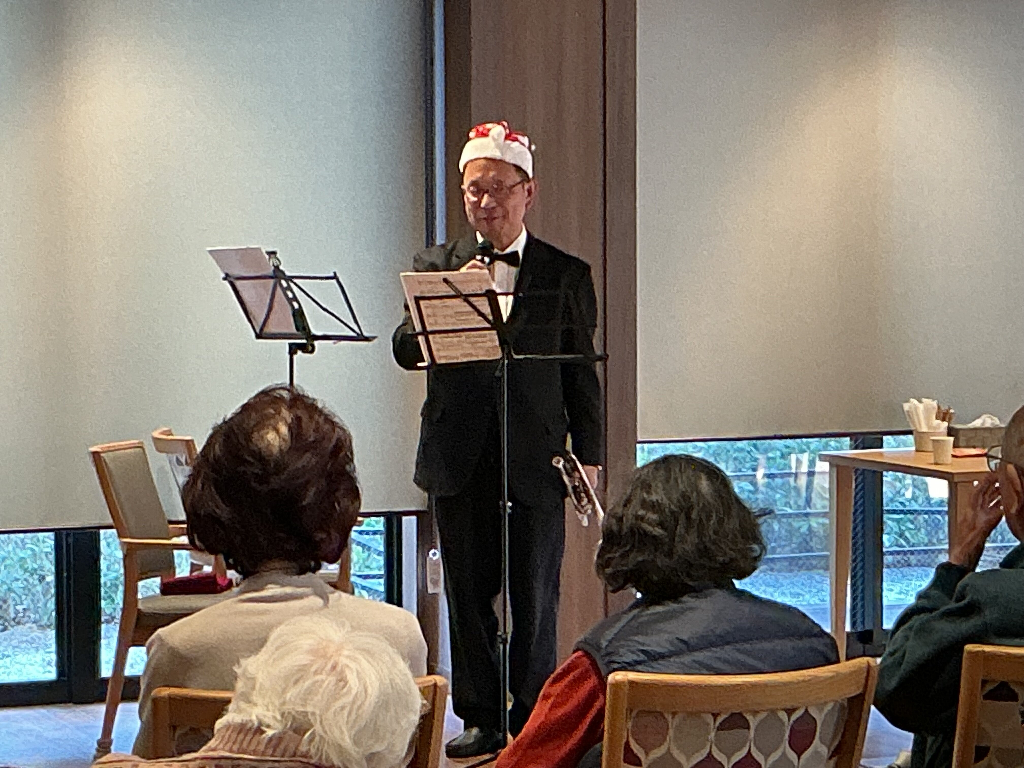 先日、当施設にてピアノとトランペットの演奏会を開催いたしました。今回は、ご入居者様に一足早いクリスマス気分を味わっていただけるよう、演奏者のお二人がサンタクロースの帽子をかぶって演奏してくださいました。