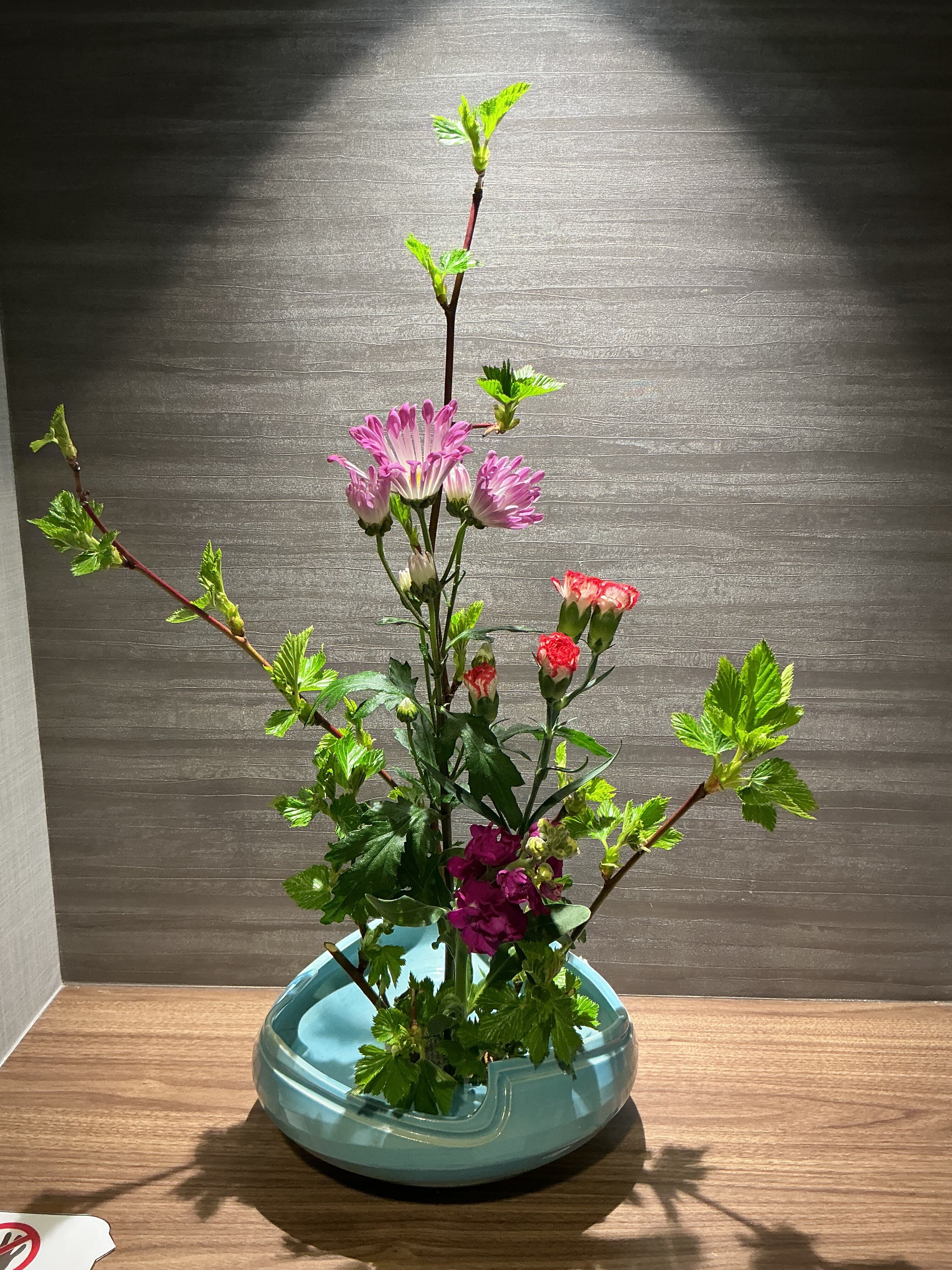特にストックのふんわりとしたボリューム感と、木いちごの生き生きとした枝ぶりのコントラストが見どころです。お花の前を通るたびに、ストックの優しい香りが鼻をくすぐり、「もうすぐ春ですね」と入居者様同士の会話も弾んでいます。