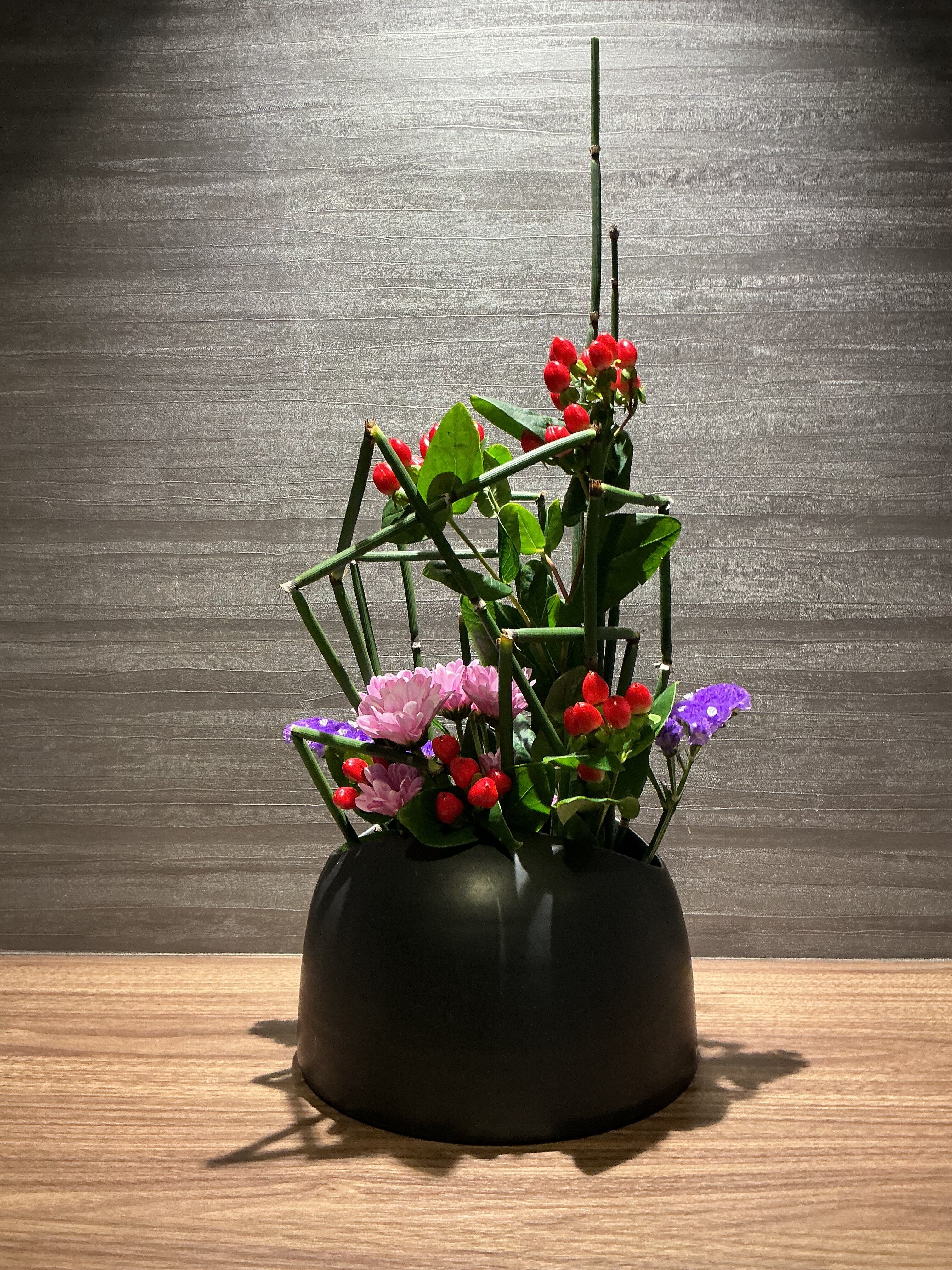 今週は、スッと立ち上がるトクサの「緑」と、ヒペリカムの「赤」のコントラストが非常に美しいです。