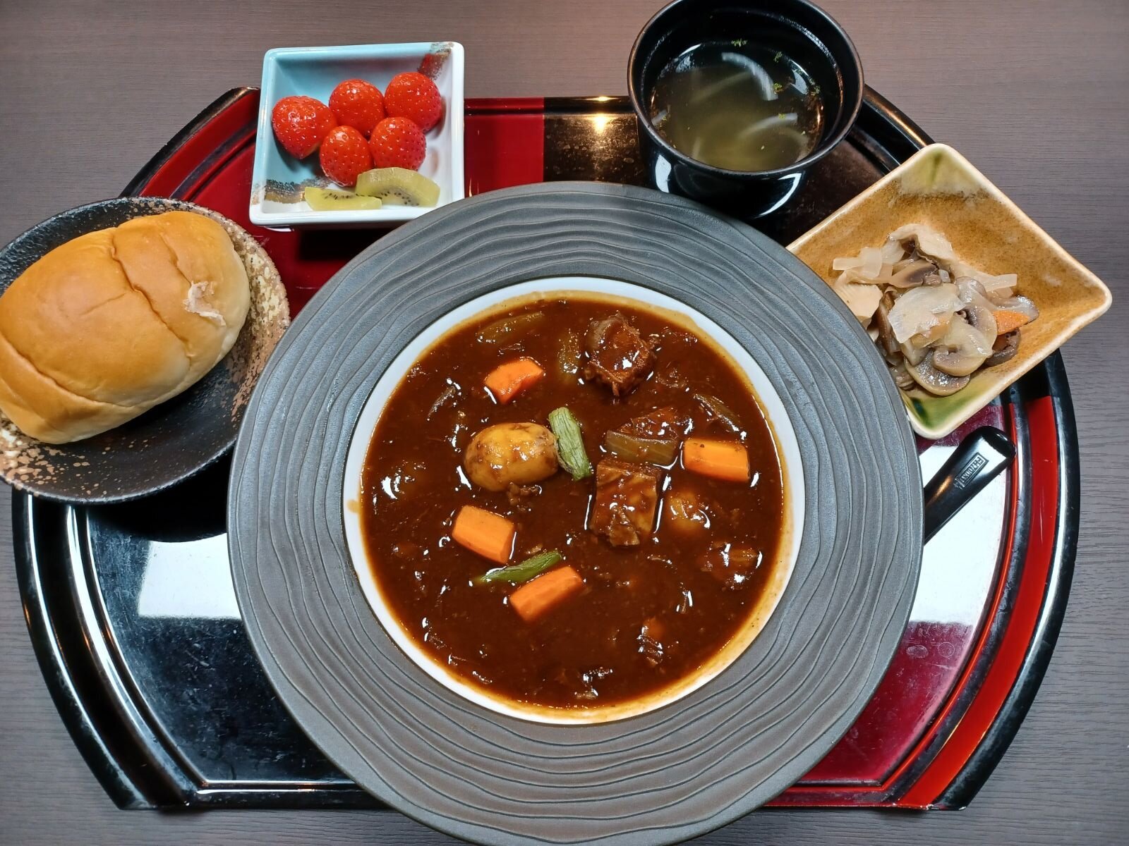 お食事前から「今日はシチューなのね!」「いい匂いがしてきたわ」と楽しみにされていた皆様。配膳されると、あちこちで「わあ、豪華ね!」と歓声が上がりました。
