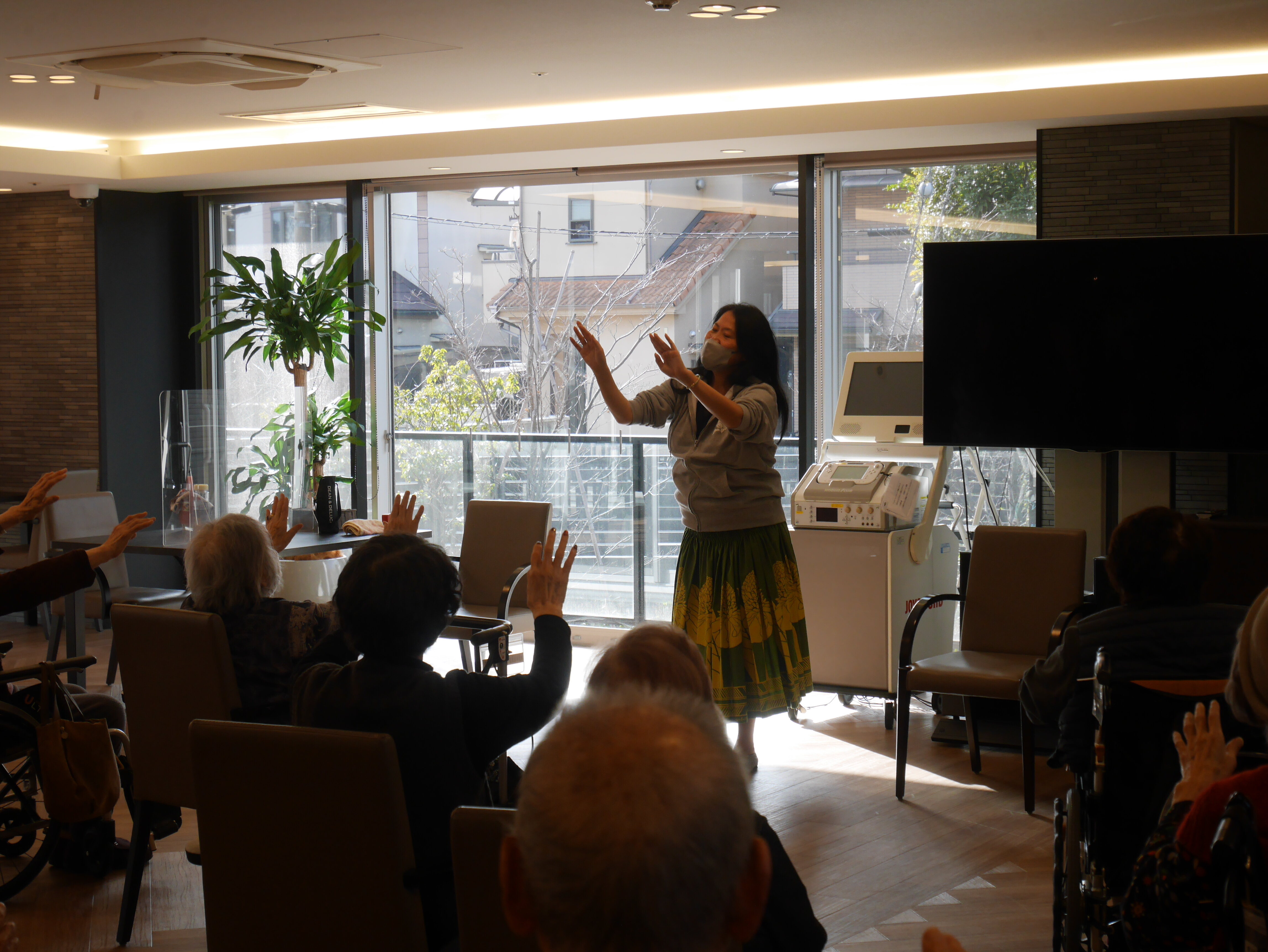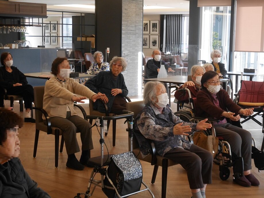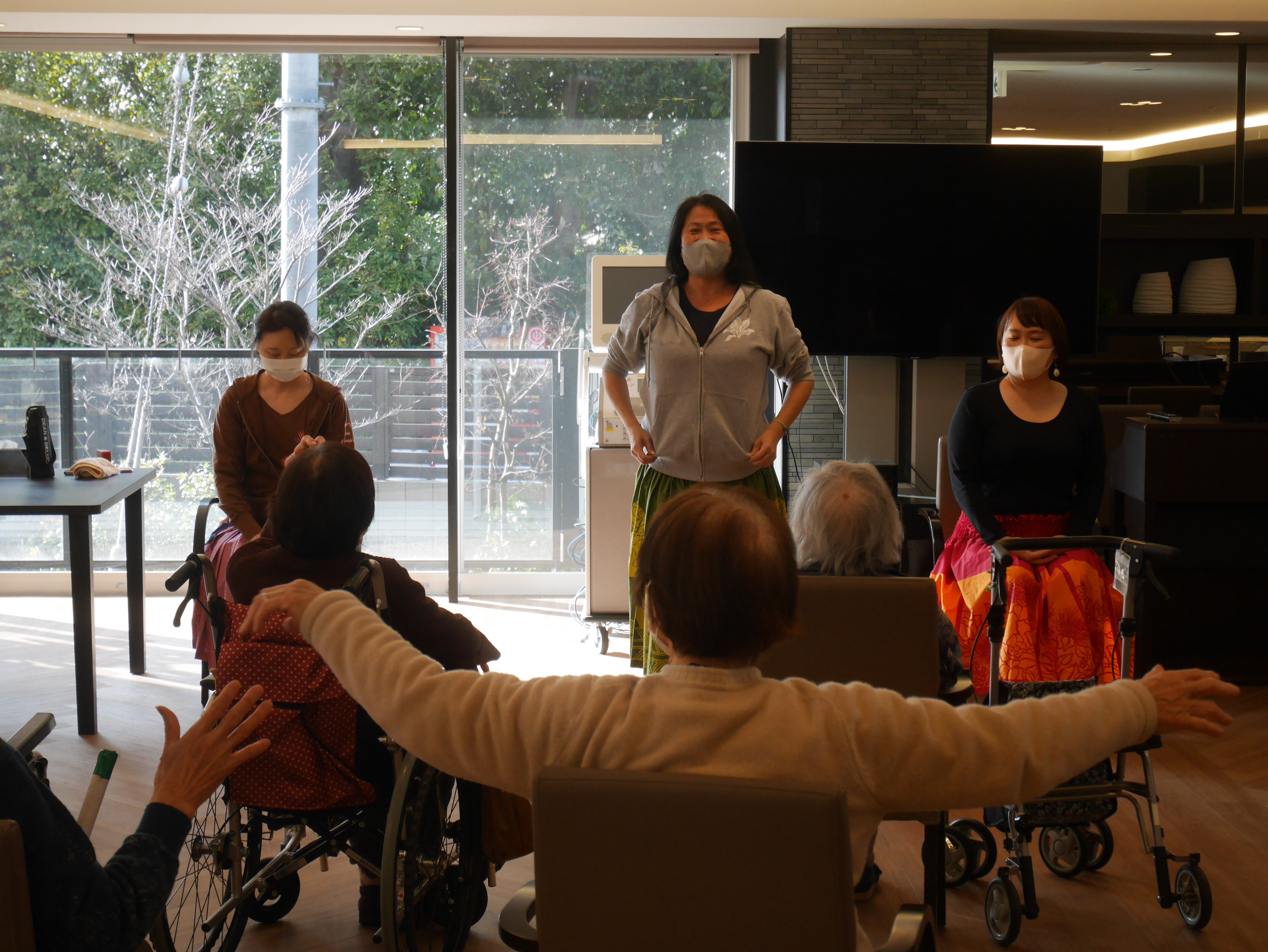 本日のレクリエーション"椅子に座ってフラダンス"です。