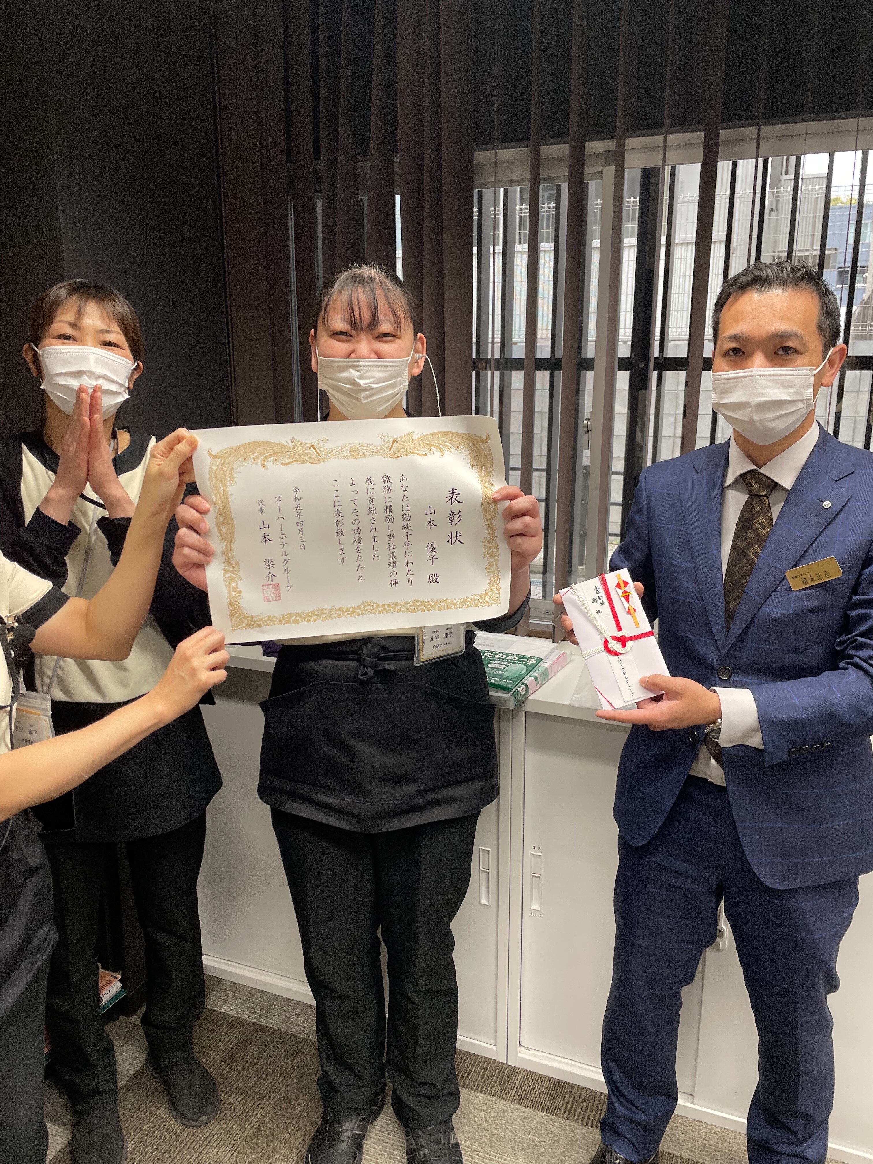 先日、スーパー・コートプレミアム宇治の介護スタッフリーダーの山本優子さんが「勤続10周年」の表彰をされ、楢木施設長から表彰状とお祝いのお言葉をいただきました。