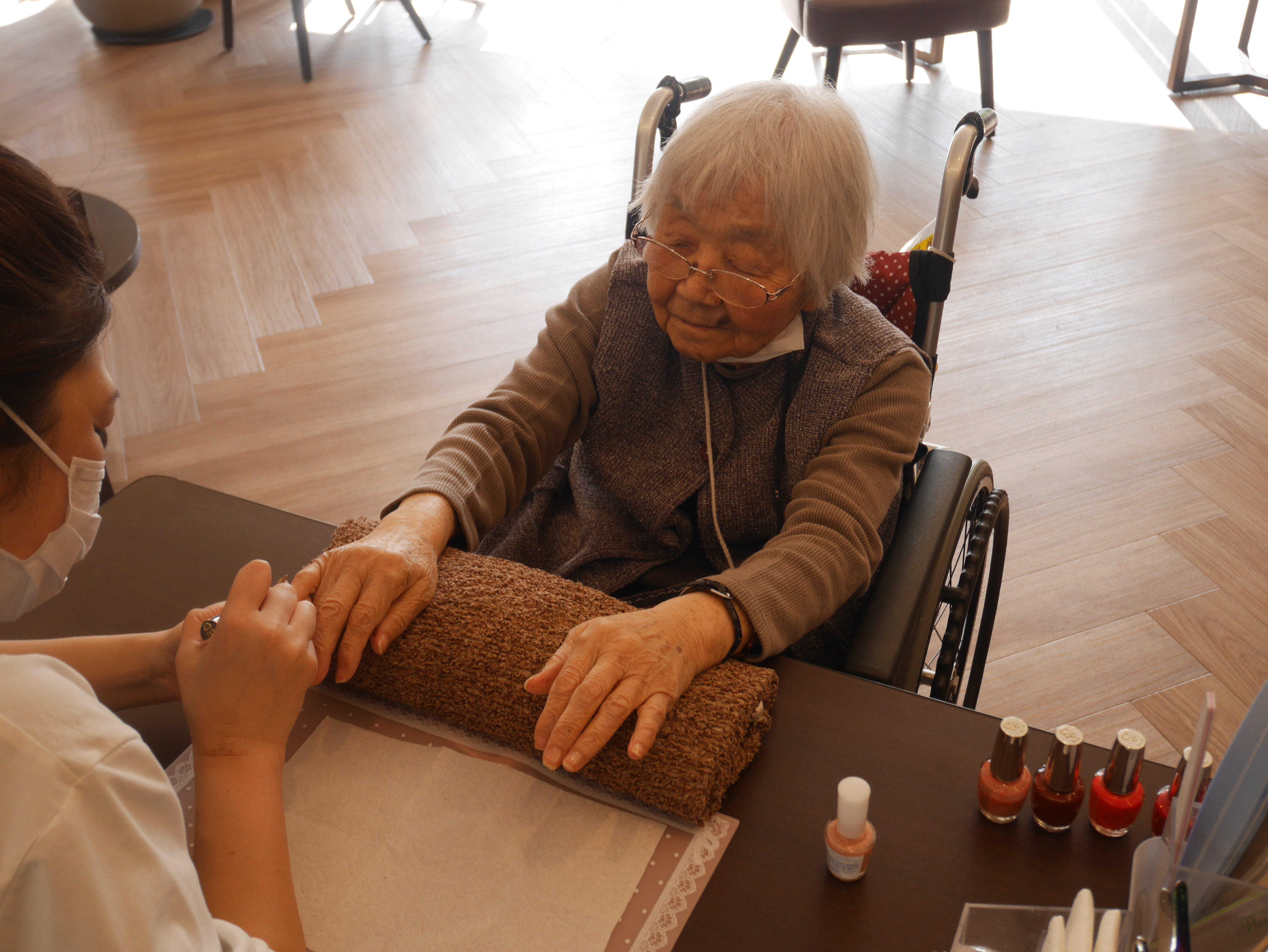 入居者様「似合うかな?私まだまだ気持ちも若いから赤いのするわ!!!」